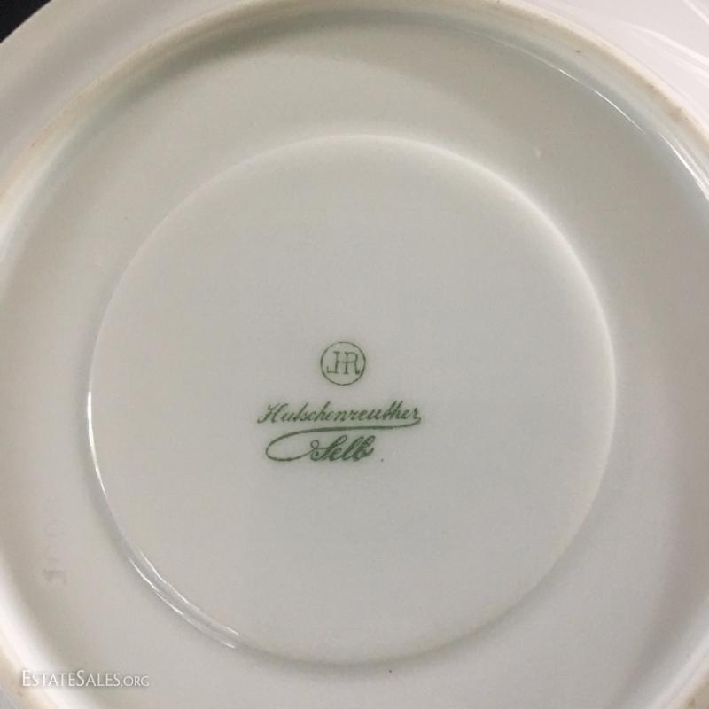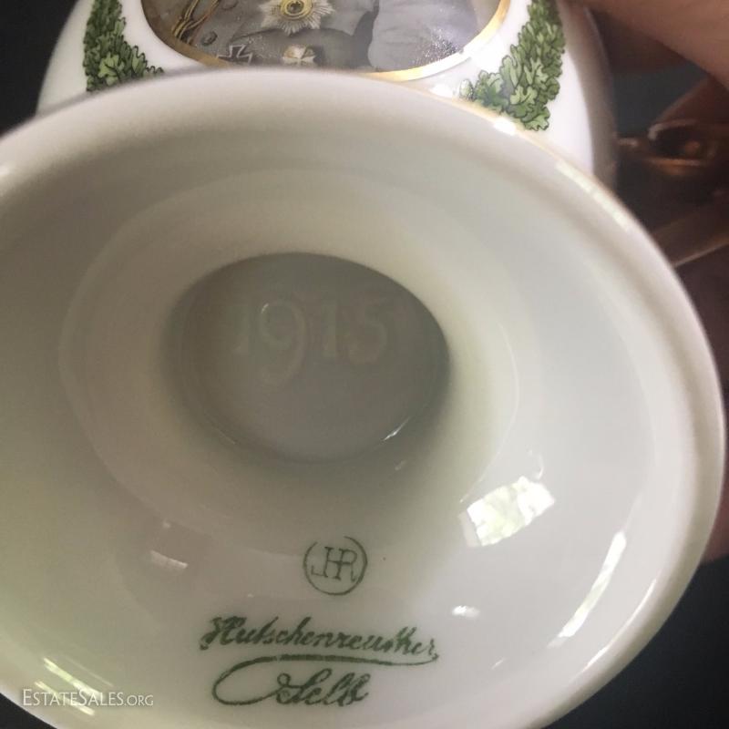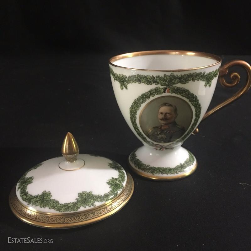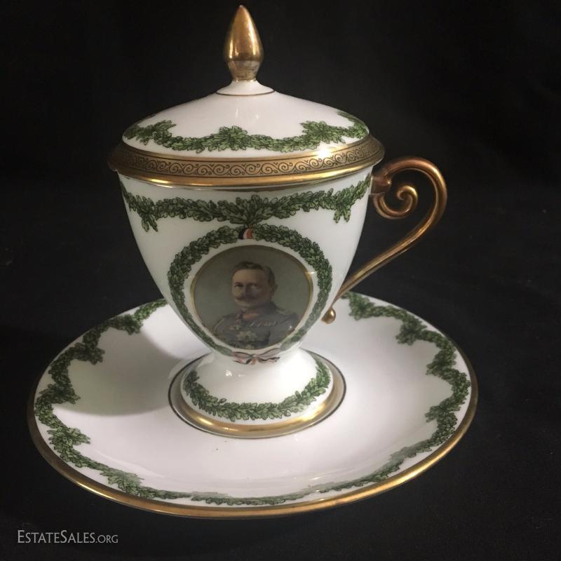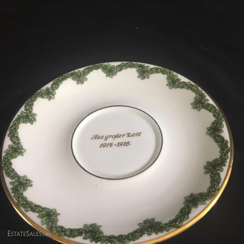 Tea cup with lid and saucer. Marked 1915. Cup is 5.5"tall. Plate is 6.5" diameter. Excellent condition.