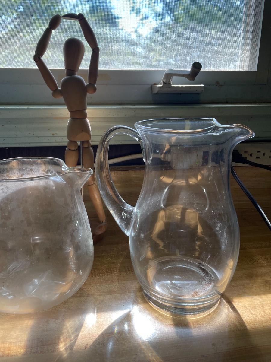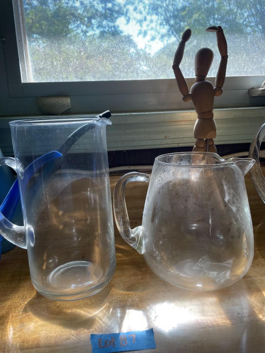lot 87- (3) glass pitchers, (2) watering cans, wooden decor piece