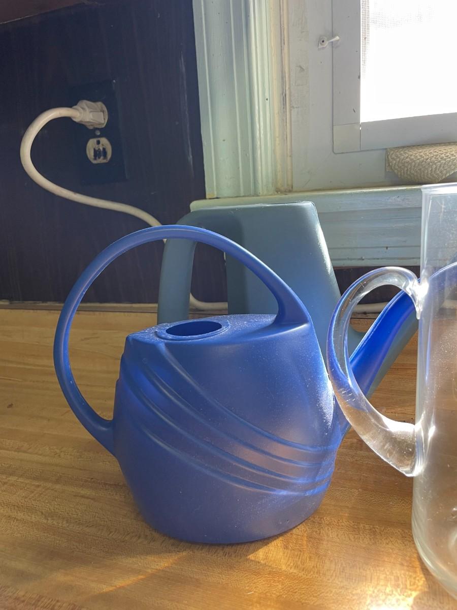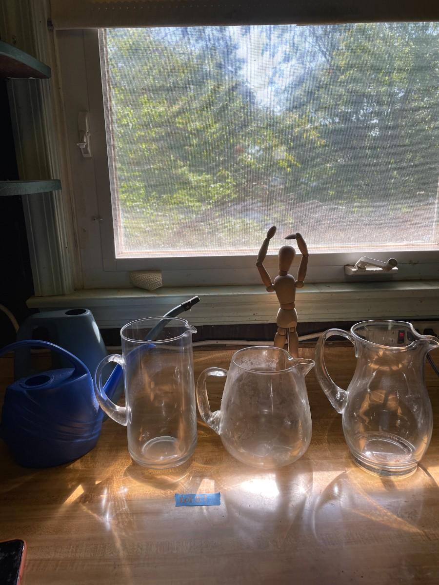 (3) glass pitchers, (2) watering cans, wooden decor piece.
