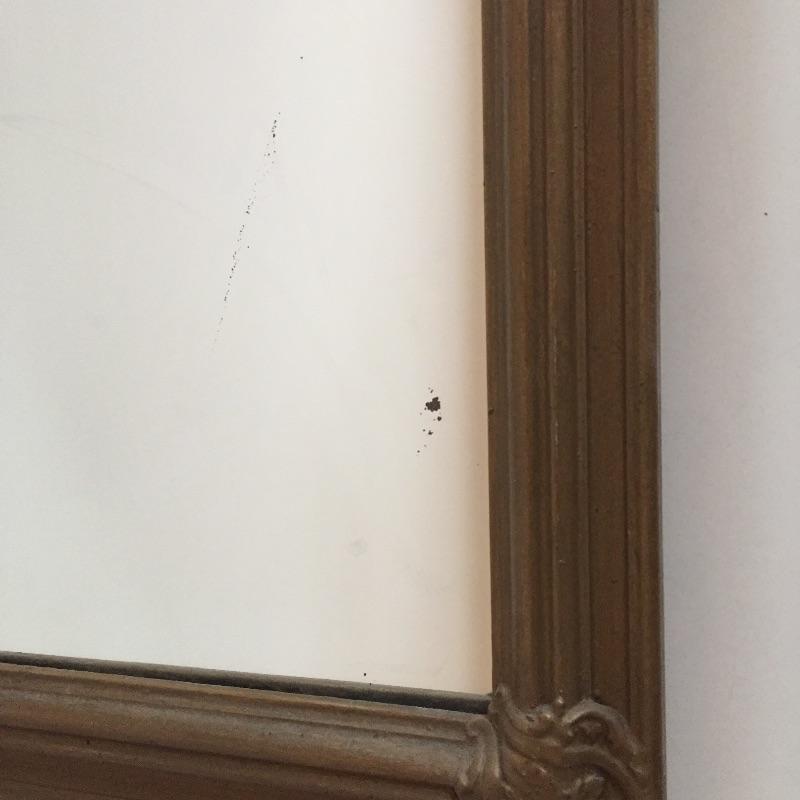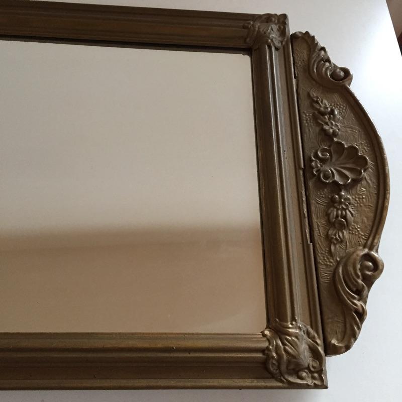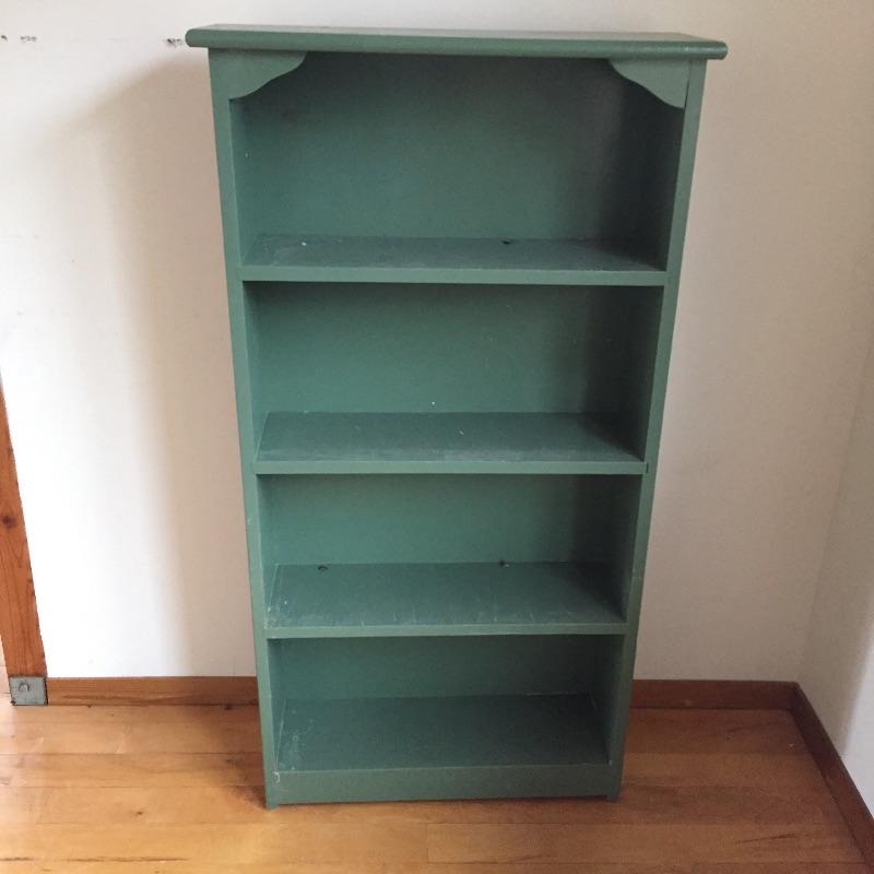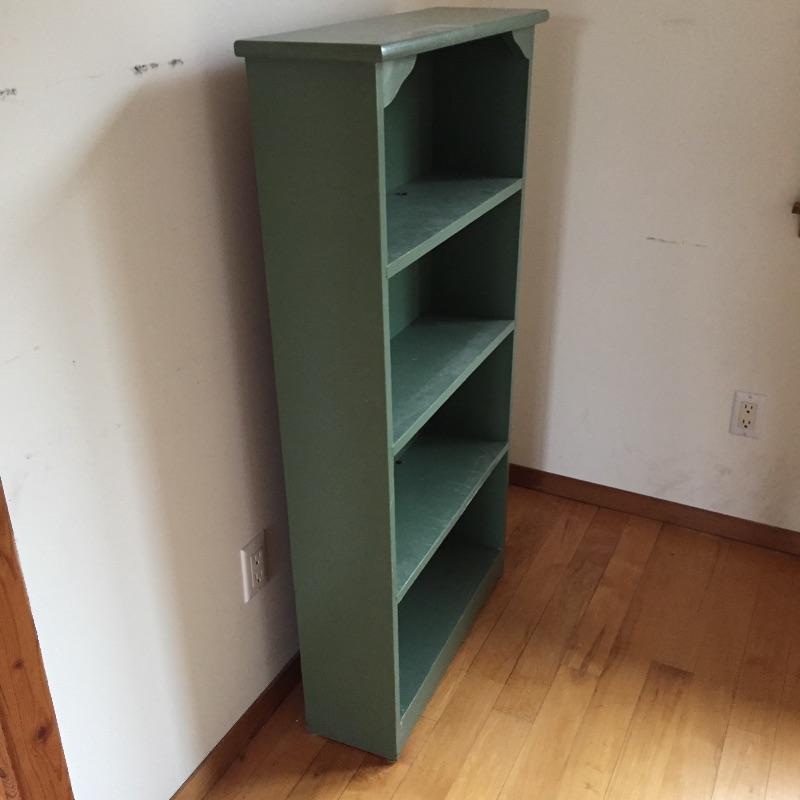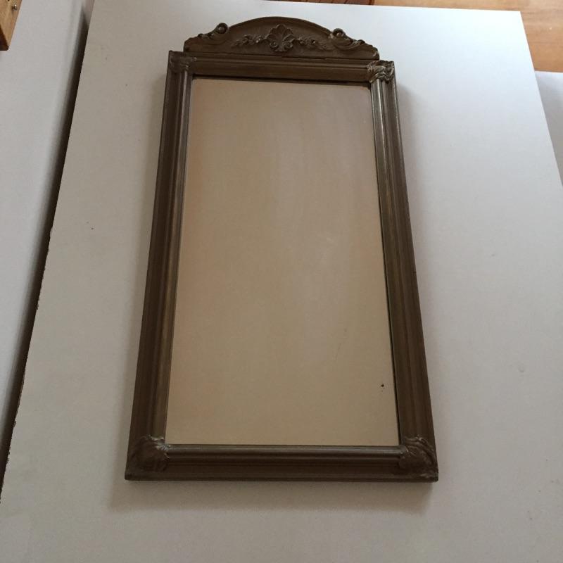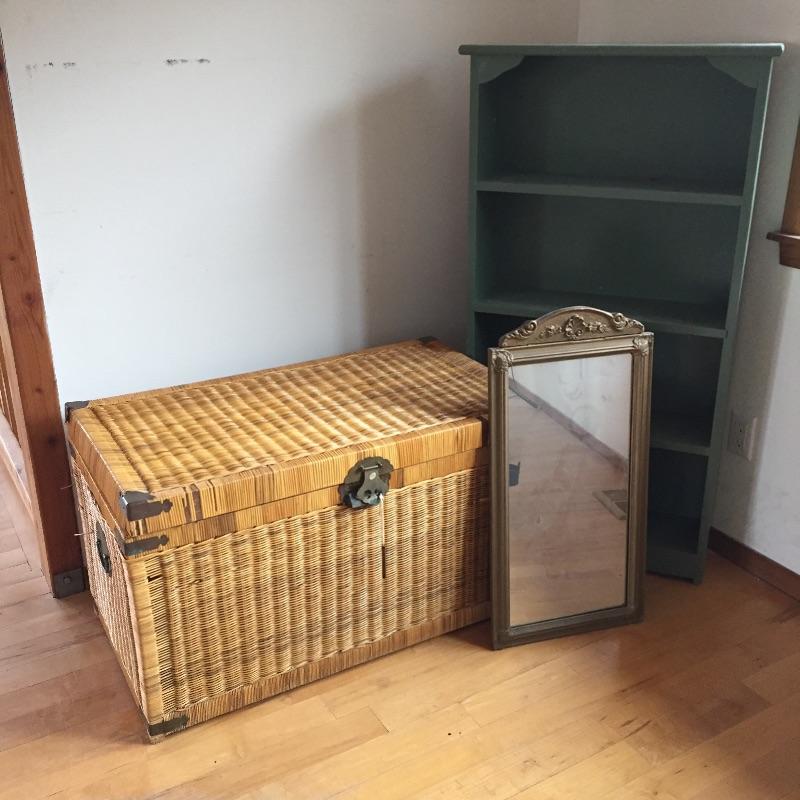 This 3 piece lot includes a set of green painted shelves, a wicker trunk and an ornate mirror. The mirror has a few minor dark marks. Shelf is sturdy wood.