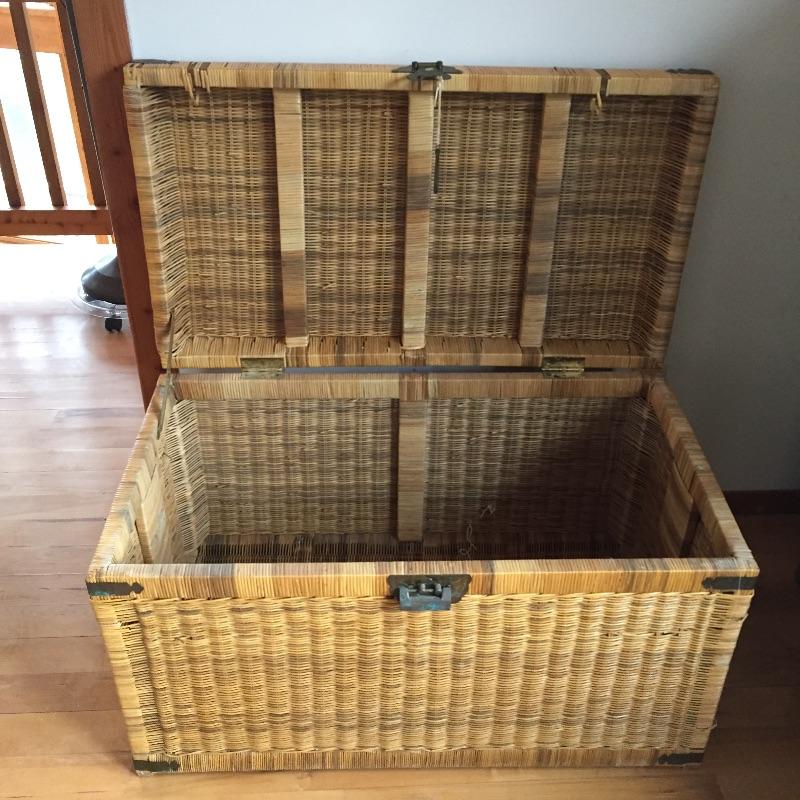 Wicker trunk measures 20” x 25” x 20”. Green shelf is small at 25.5” x 8.5” x 48”h