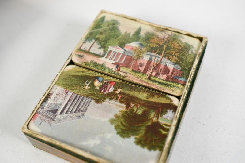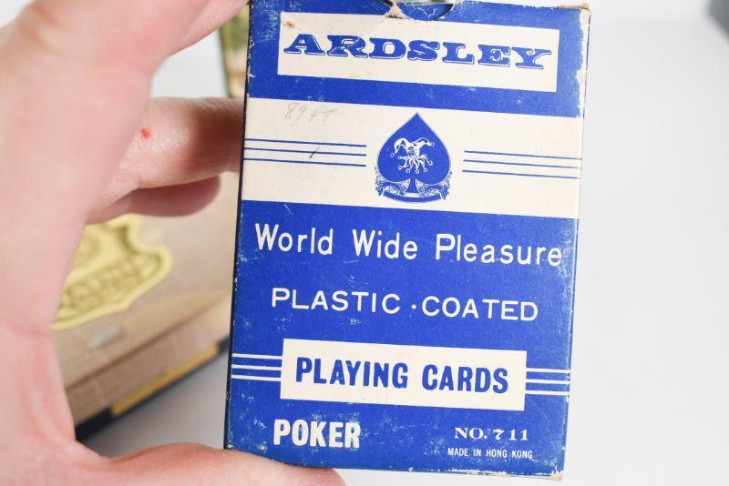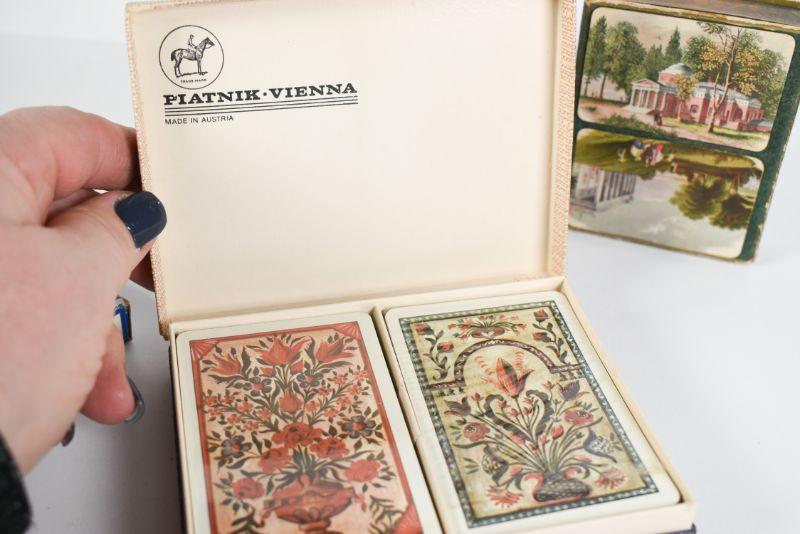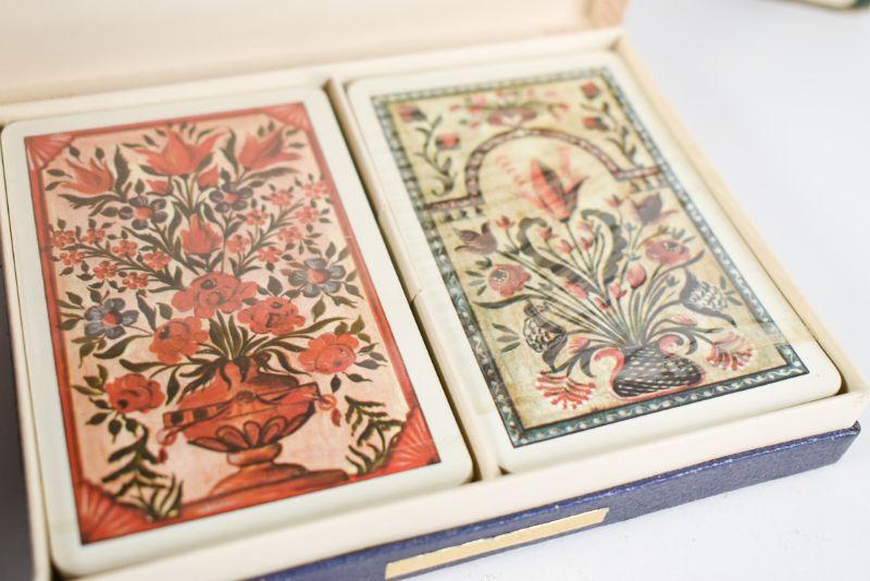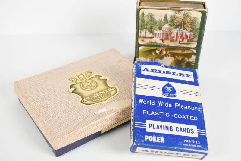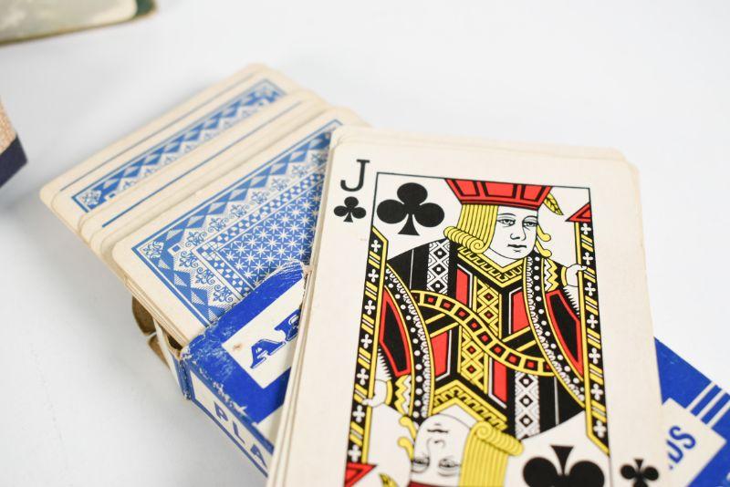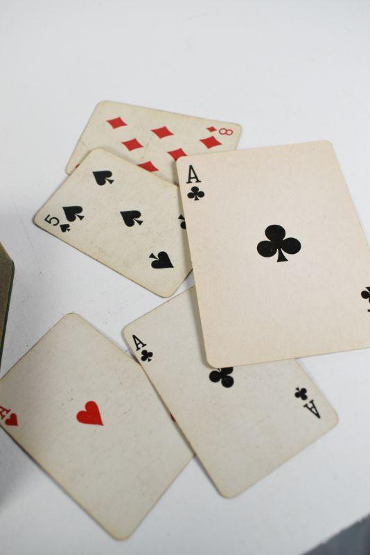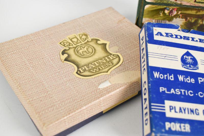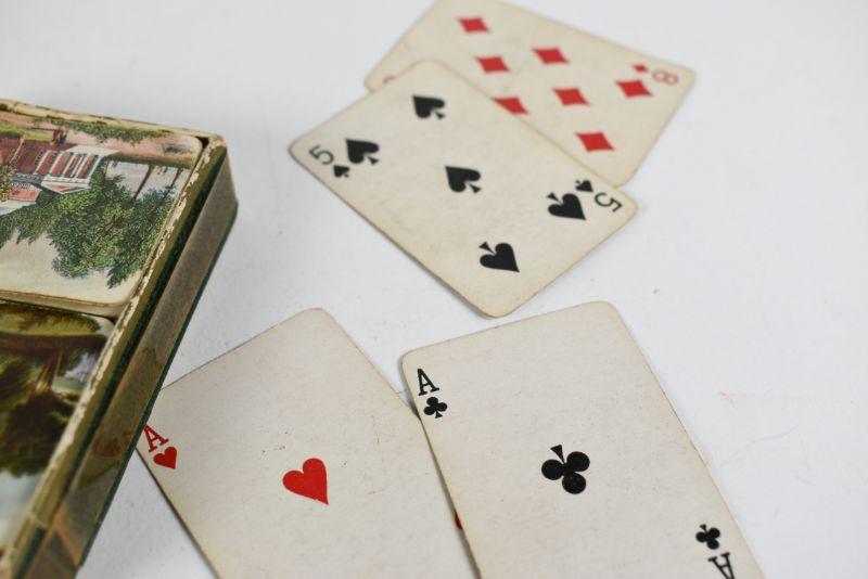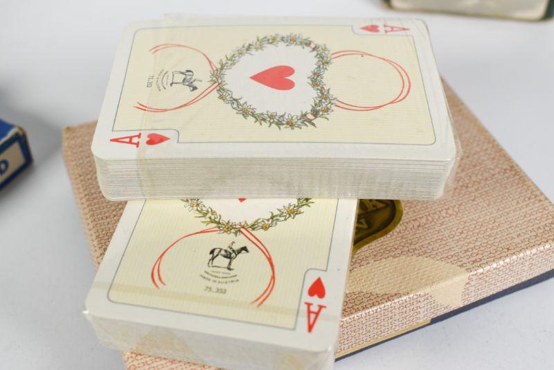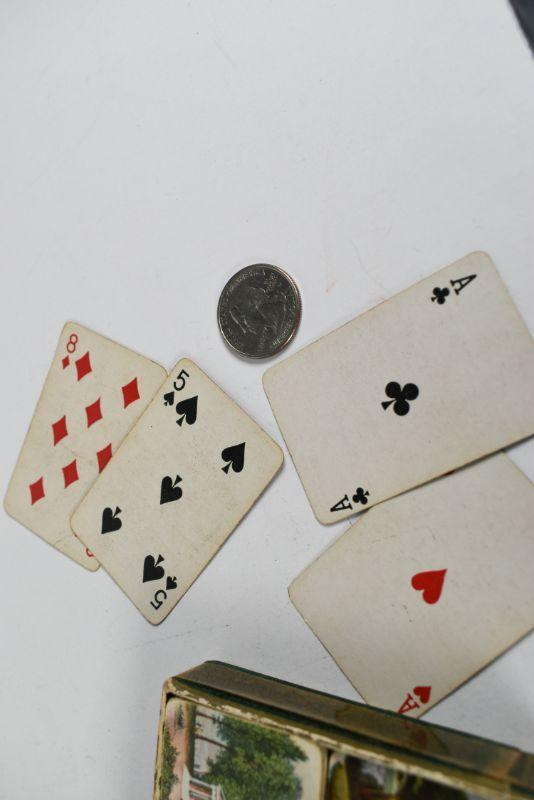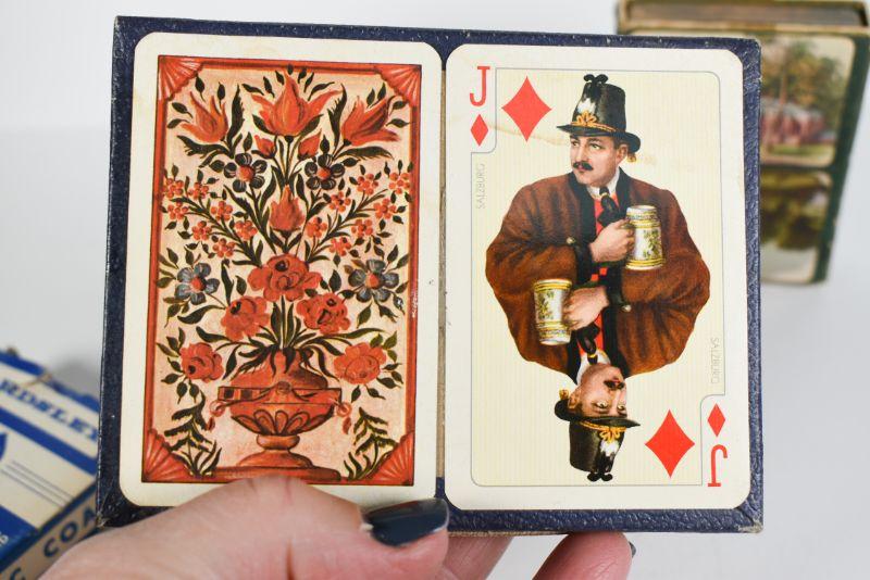 A few decks of vintage playing cards, including a set with small playing cards. All cards are there. **Please read Terms and Conditions before placing a bid. Pick up is Sunday, December 22 from 11am to 3pm or Monday, December 23 from 4pm-7pm in Mantua, NJ. All sales are final. All sales are as is, where is. Please review all photos. Props are not included. Measurements are approximate.