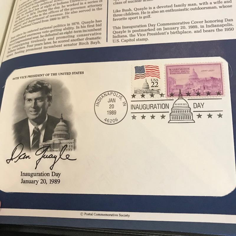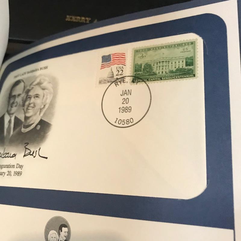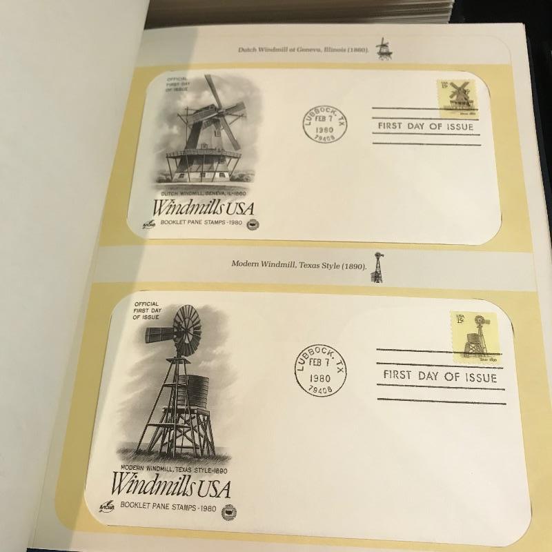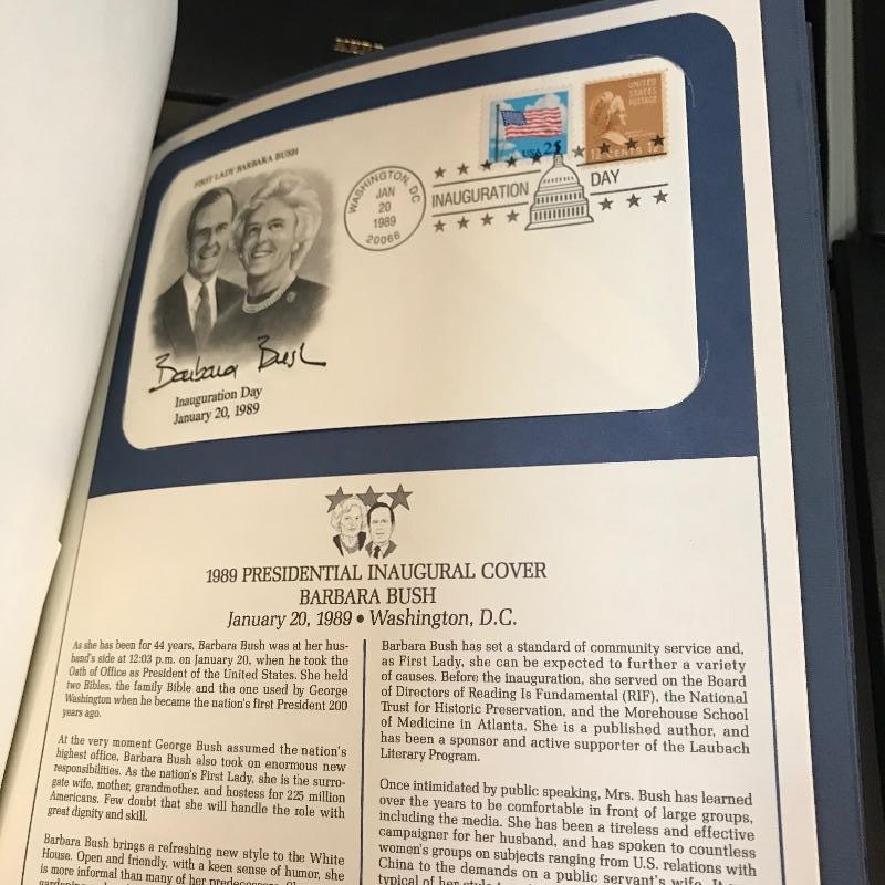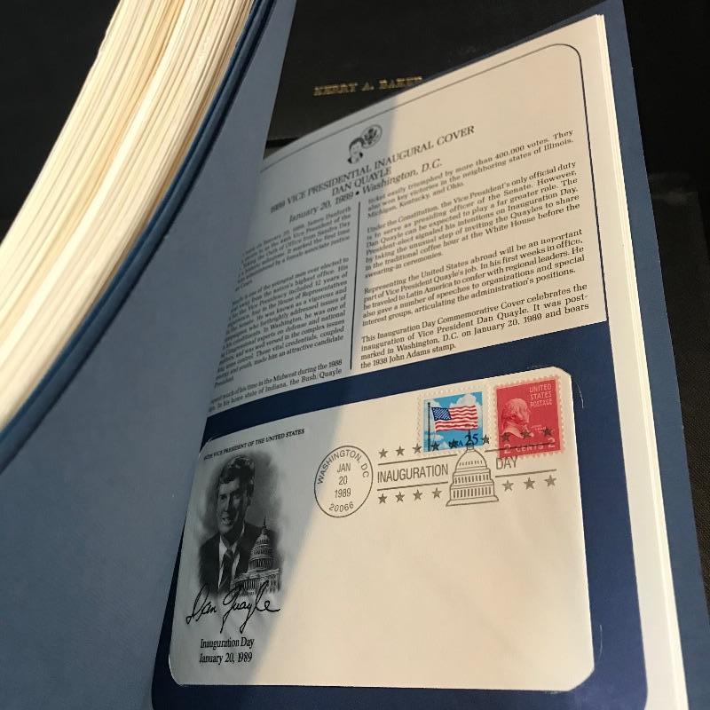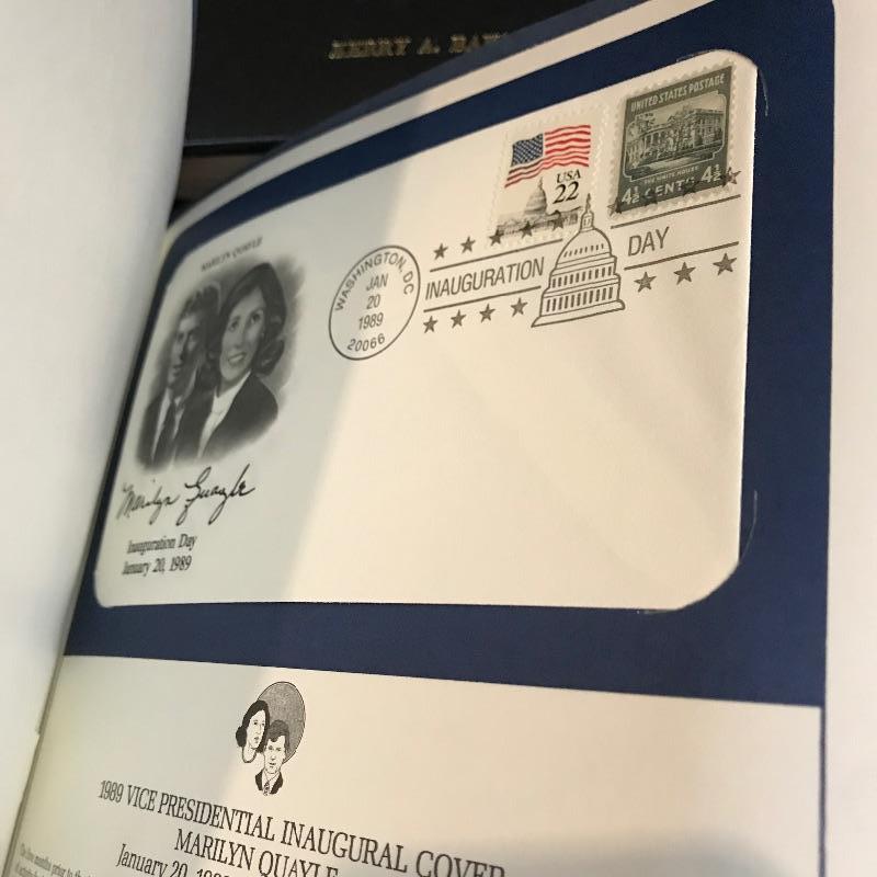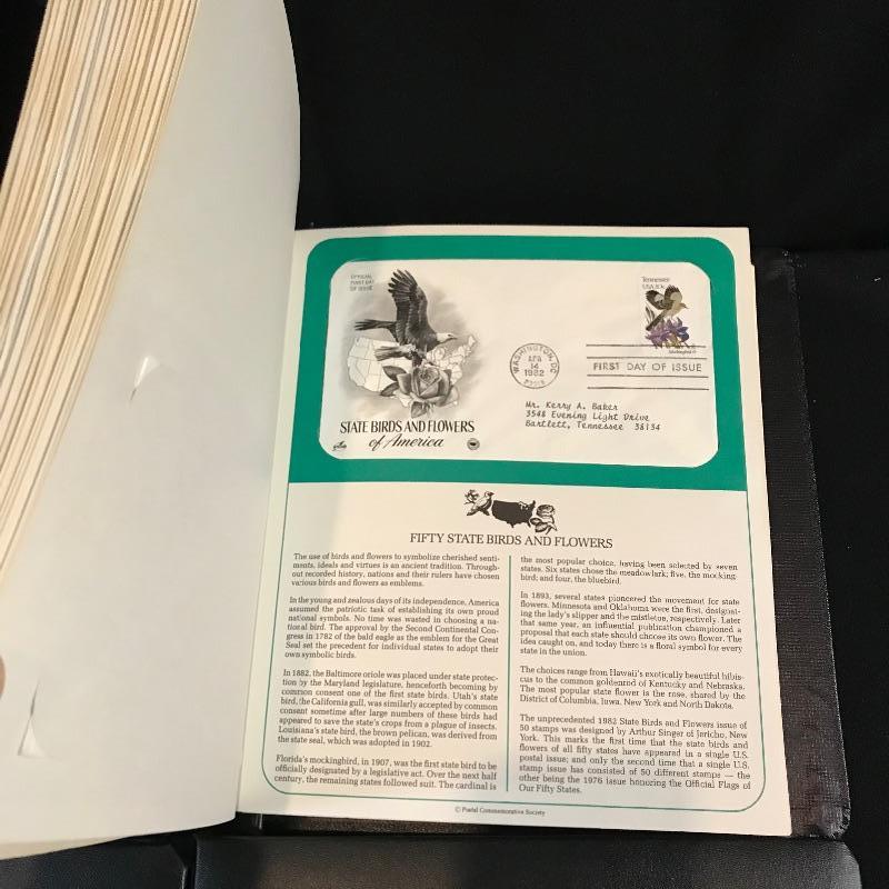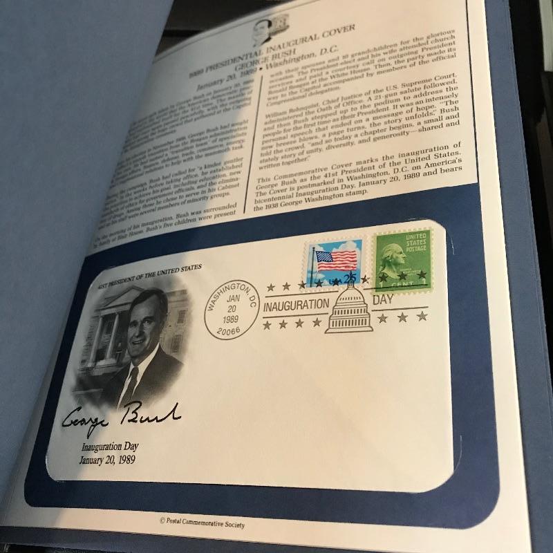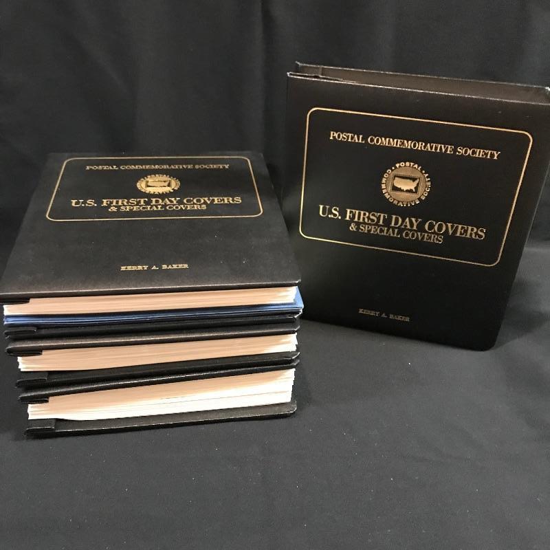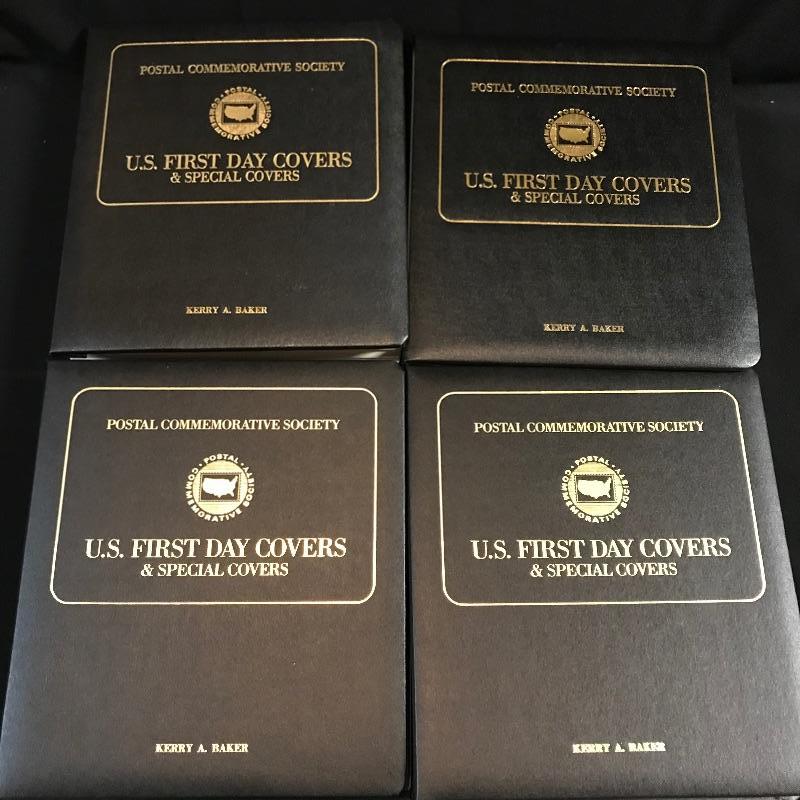 Four matching black binders personalized with special first day covers. Most are collected with full page layout. One binder features George HW Bush and Dan Quayle inaugural 1st day cover collection. Just a few pages are waiting for the stamped, cancelled cachet envelope. Covers include many special US stamps, with just a few international. Genres include presidents, US History, Statehood, Wildlife, Professions and People. The first binder shown in photos appears to be two organized collections from US Presidents (Washington to Reagan) and Wildlife. Most stamps are from 1980s.