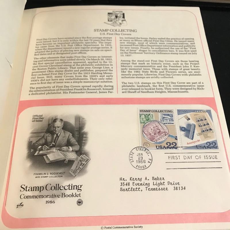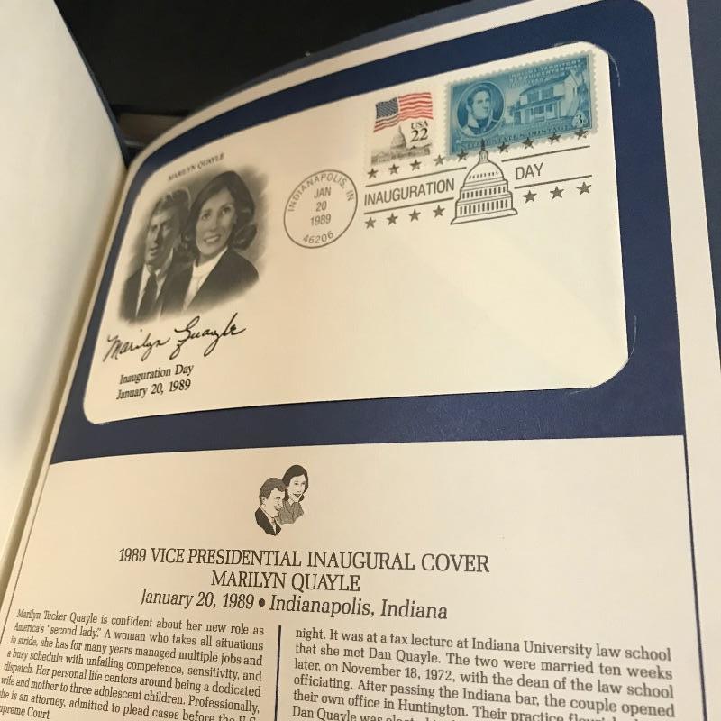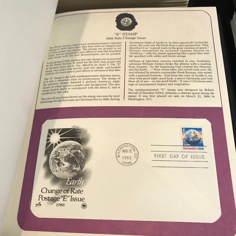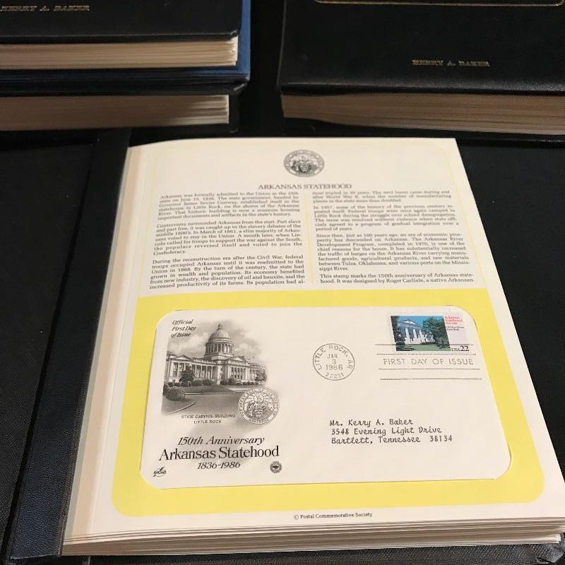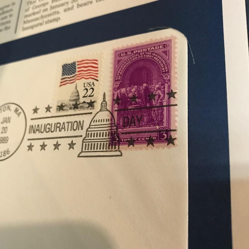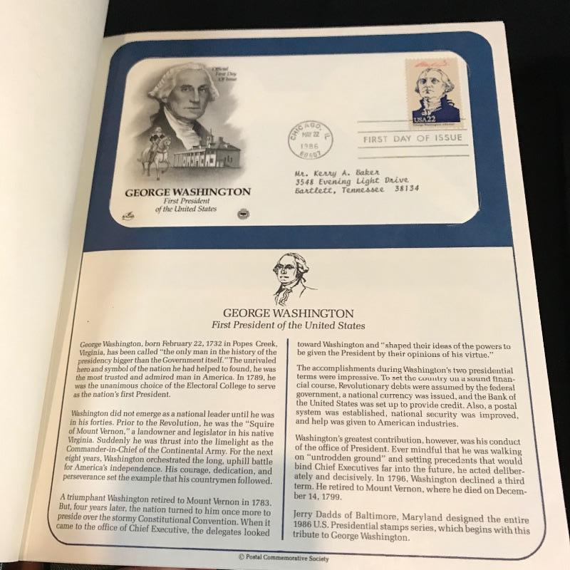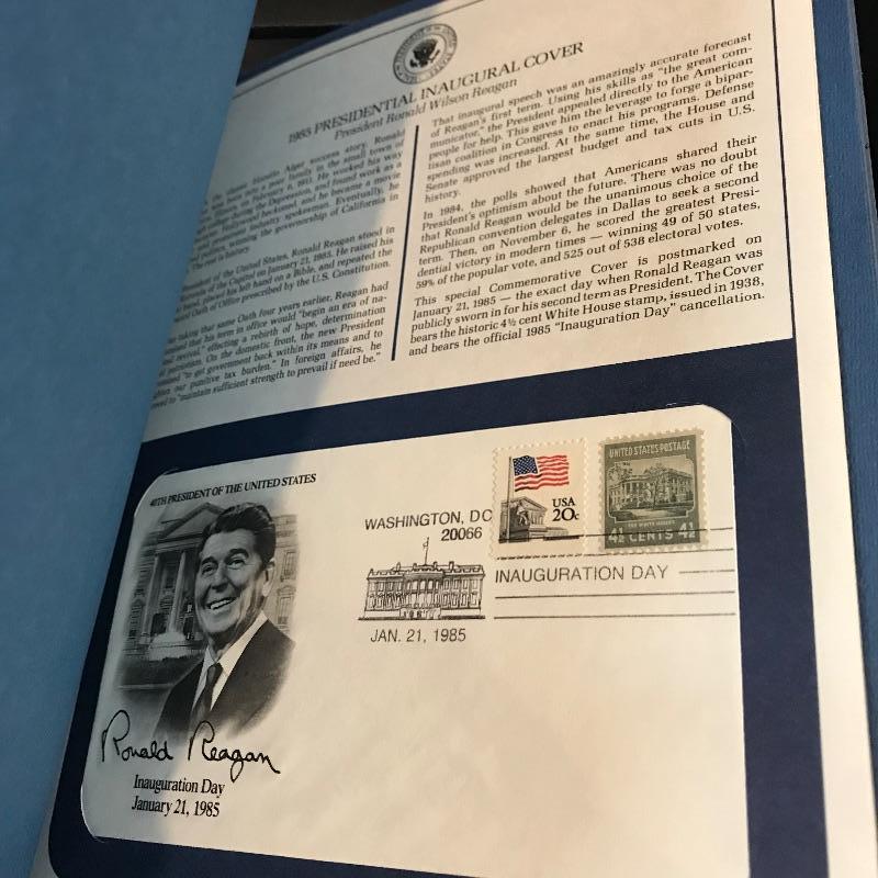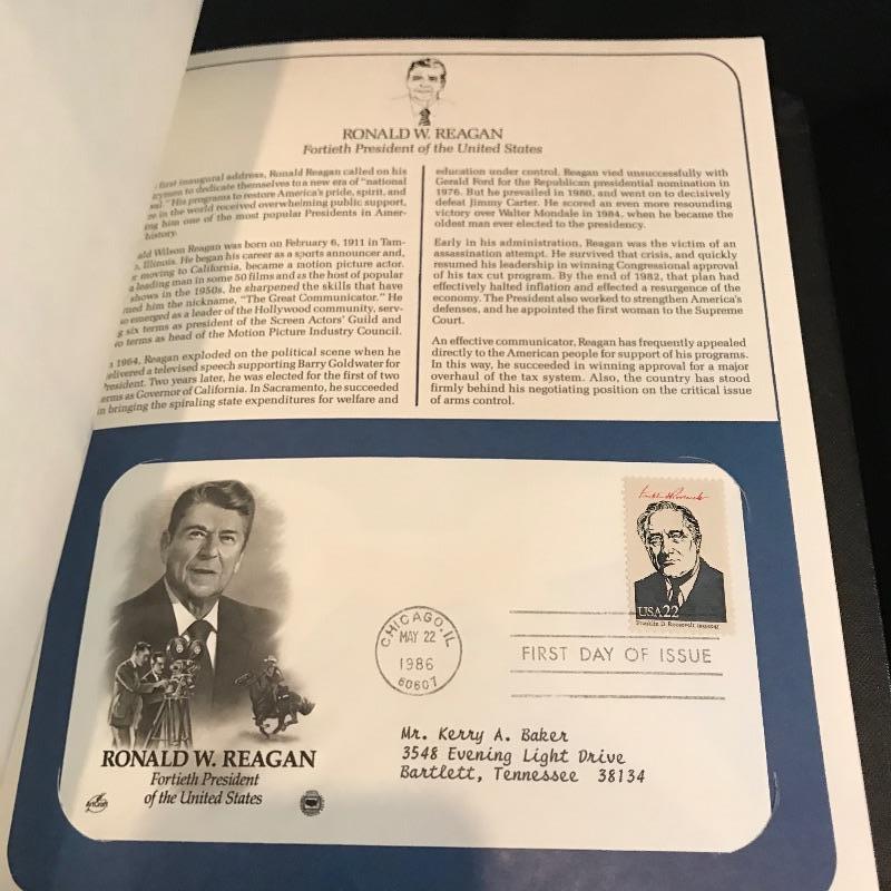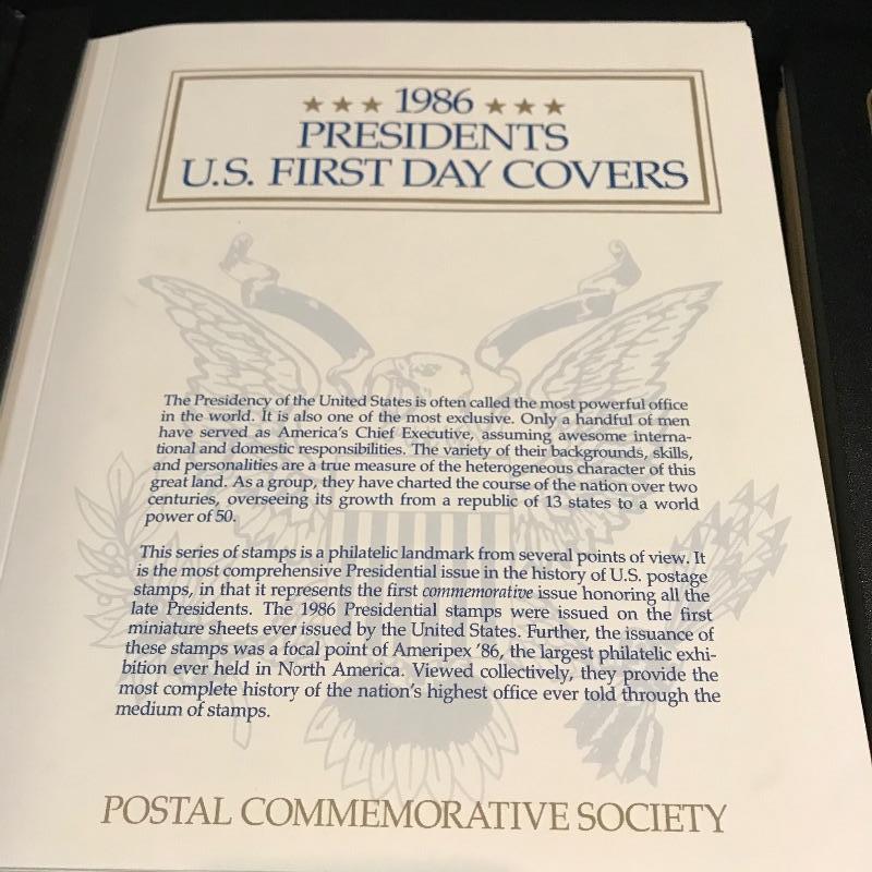Four matching black binders personalized with special first day covers. Most are collected with full page layout. One binder features George HW Bush and Dan Quayle inaugural 1st day cover collection. Just a few pages are waiting for the stamped, cancelled cachet envelope. Covers include many special US stamps, with just a few international. Genres include presidents, US History, Statehood, Wildlife, Professions and People. The first binder shown in photos appears to be two organized collections from US Presidents (Washington to Reagan) and Wildlife. Most stamps are from 1980s.