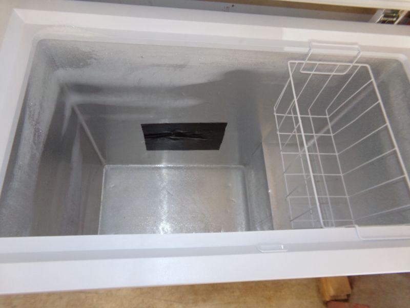 HOLE WAS POKE ON THE INSIDE BUT CLIENT GUARANTEES IT WORKS JUST FINE. FREEZER WAS RUNNING WITH FOOD INSIDE WHEN WE ARRIVED