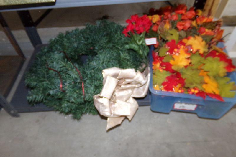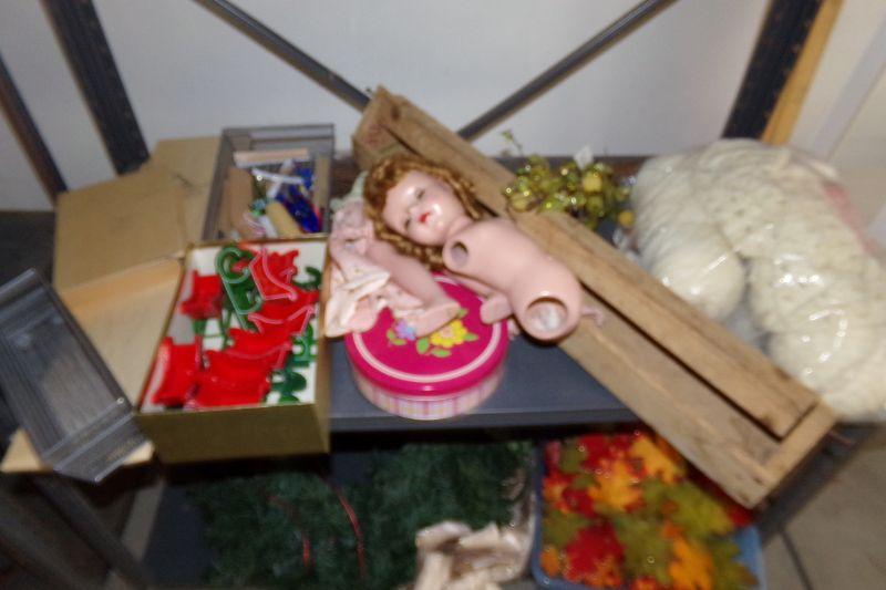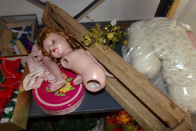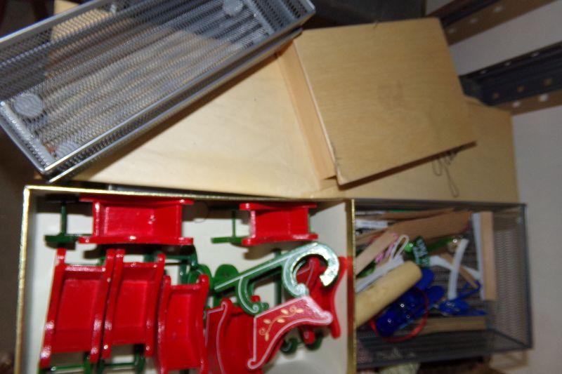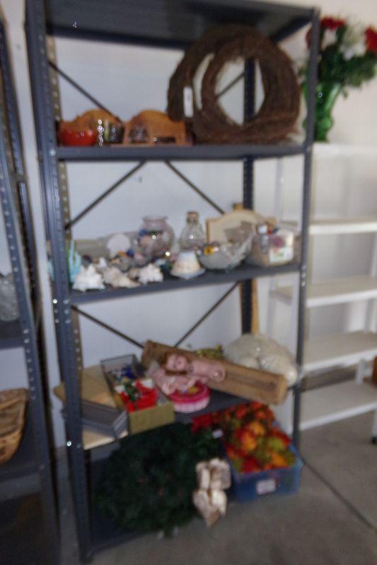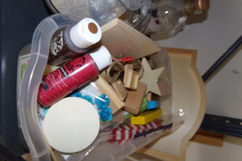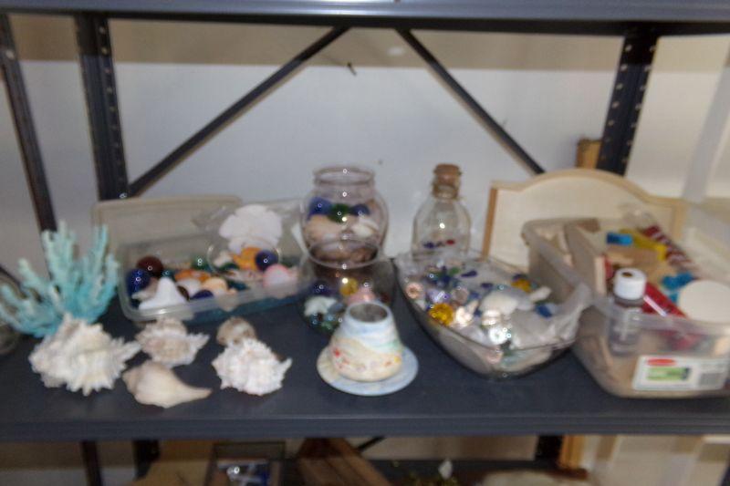 THIS SHELF IS FULL OF VARIOUS CRAFT SUPPLIES AND SEA SHELLS