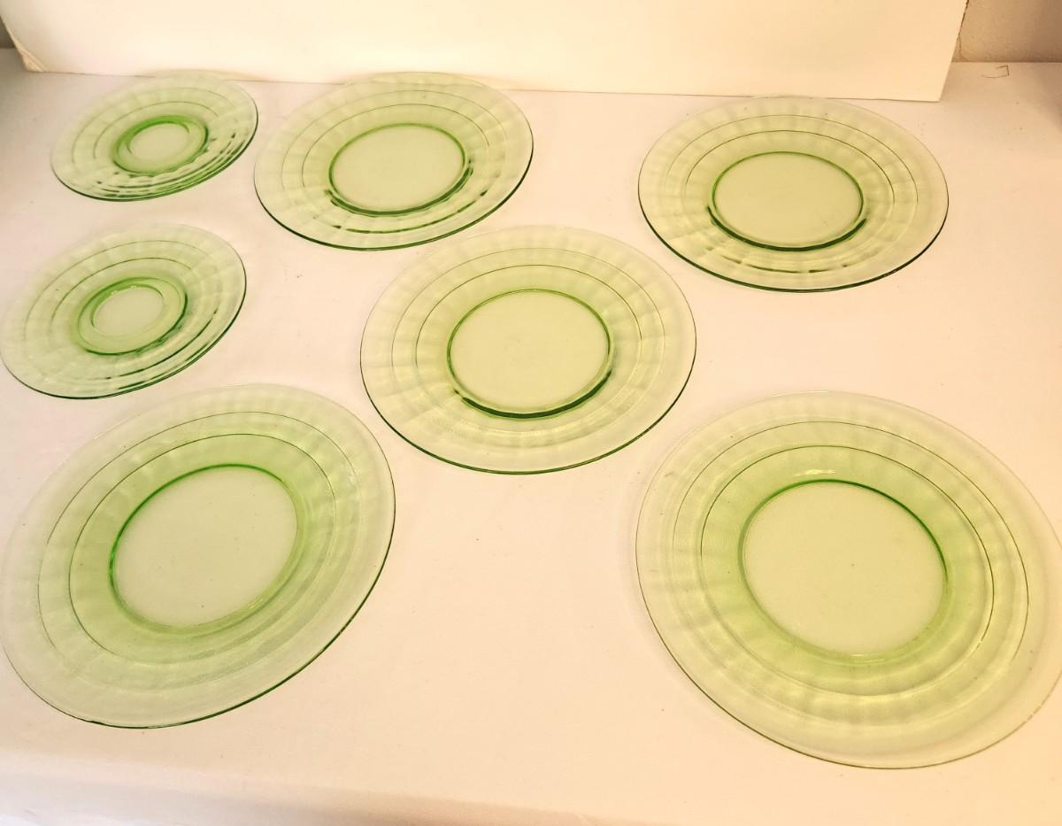 These 7 plates/saucers are in good condition - Depression era - Uranium/Vaseline glass - glows when hit with black light. Plates are 8.25" across/saucers 6.25" across.