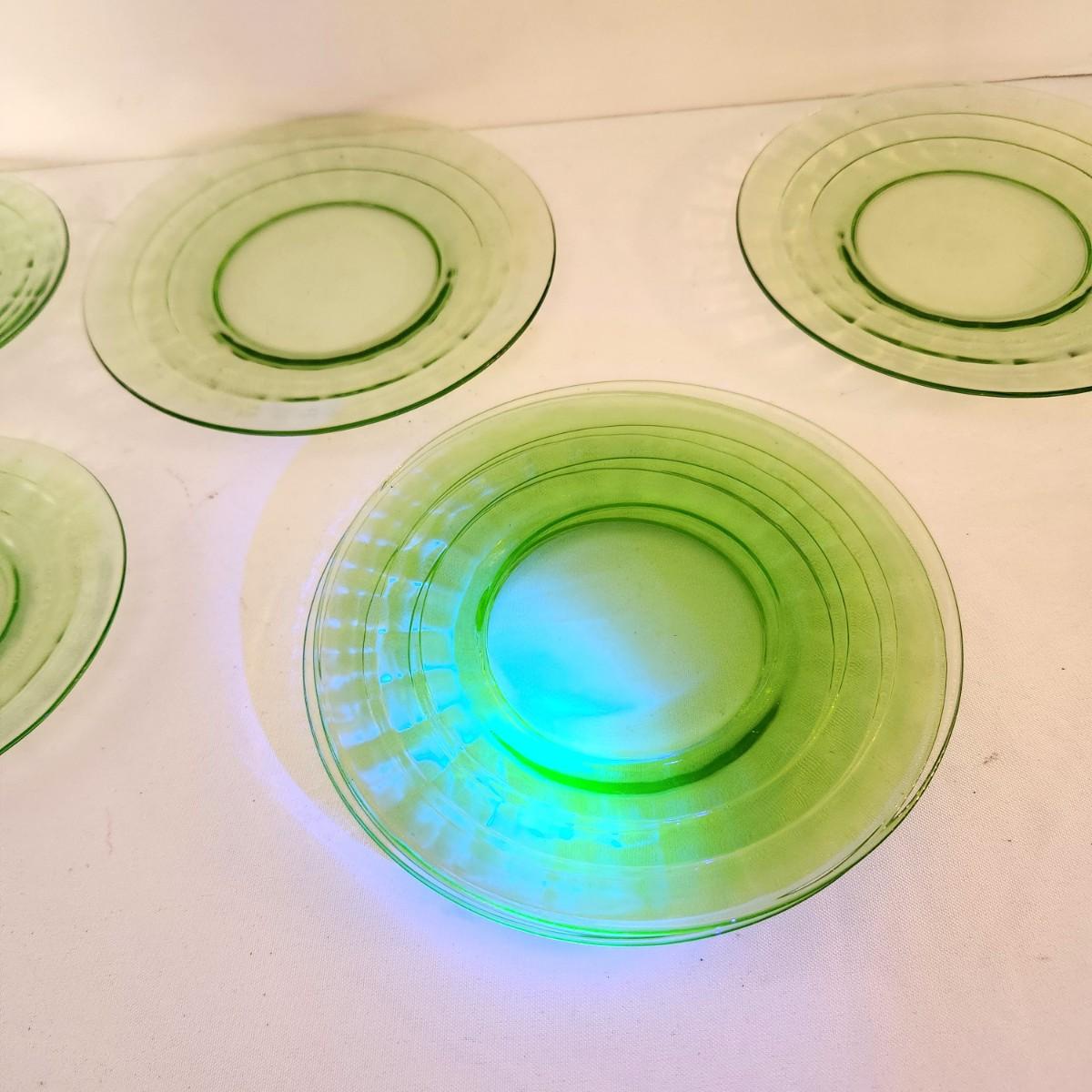 Lot #87 5 Depression era plates - 2 saucers - Uranium/Vaseline glass - Glows