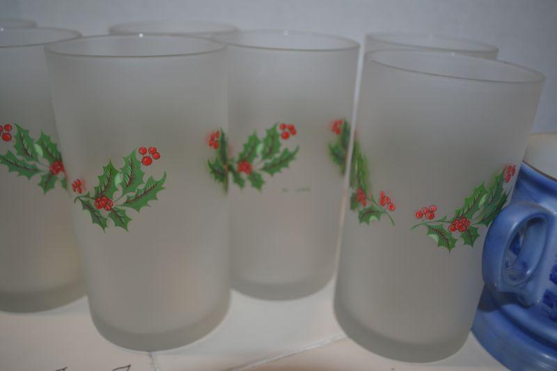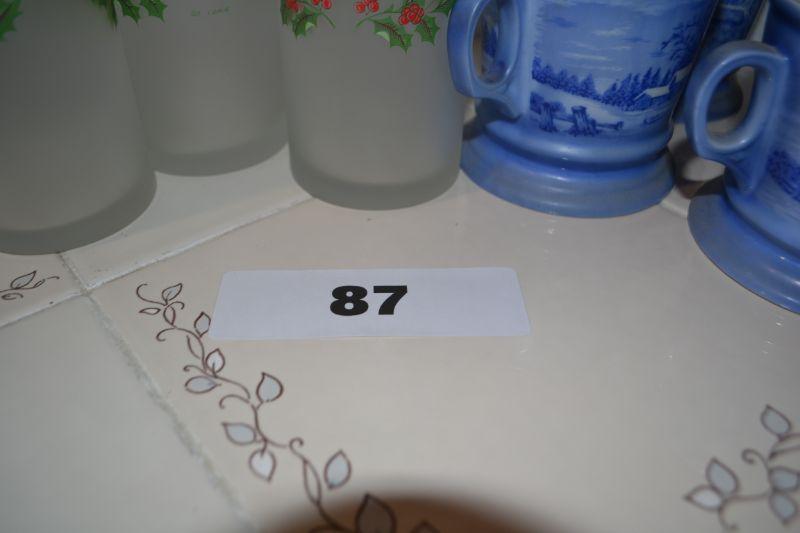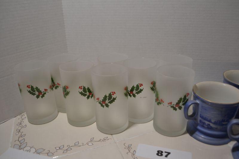 LOT 87. FROSTED CHRISTMAS GLASSES AND BLUE MUGS
