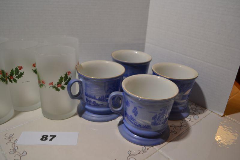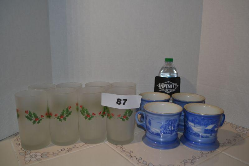 LOT 87 FROSTED CHRISTMAS GLASSES AND BLUE MUGS