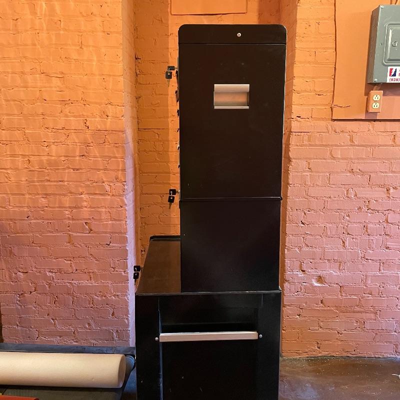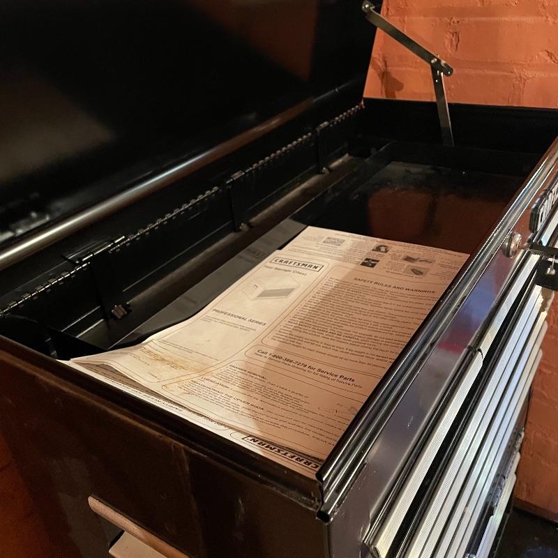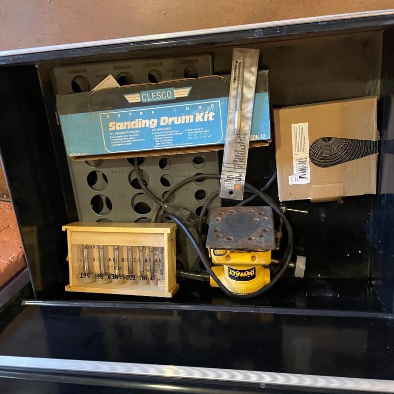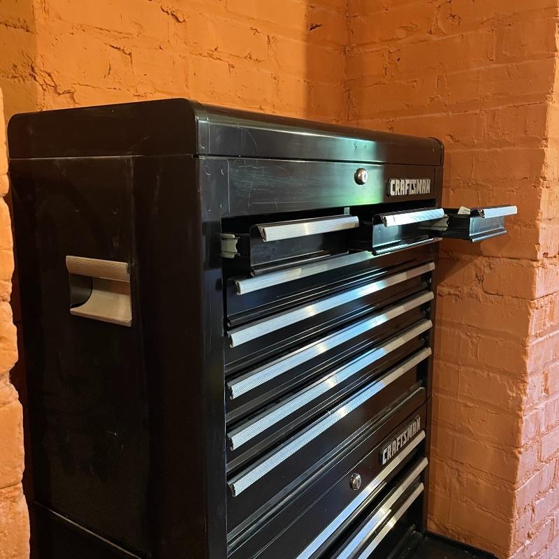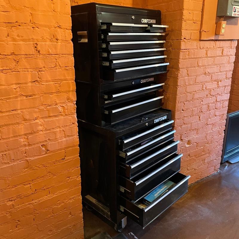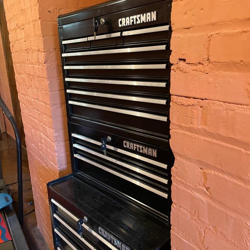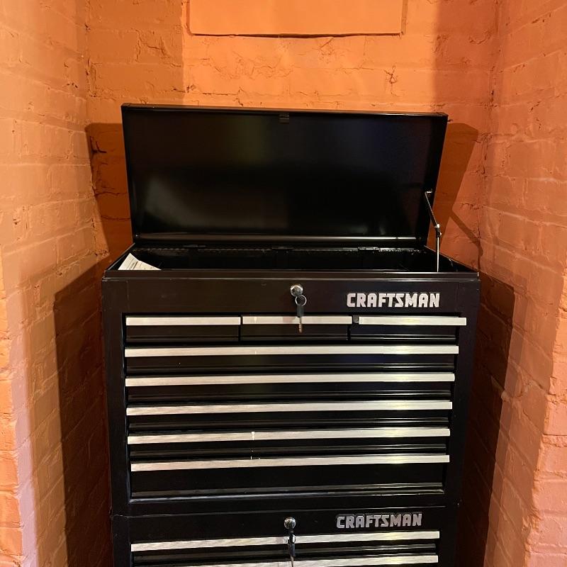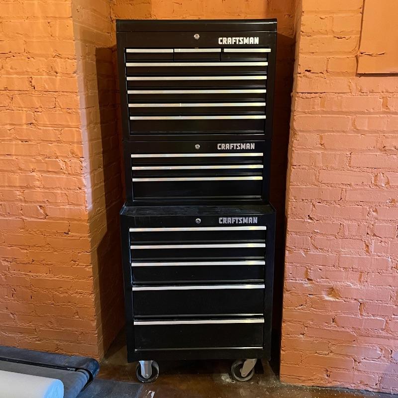 Three-piece tool chest stacked into a 15 drawer unit on wheels. Each unit has its own different key set and the top seems to only lock the cabinet, not the drawers. Some tools are included, see images. The palm grip sander turned on when tested. Entire unit measures approximately 26.75” x 18” x 65.25”. Each compartment sits snuggly in the lower portion, they do not need hardware or tools to assemble or disassemble. Please bring help to load, piece is currently in walk-out basement. Local pick up only.