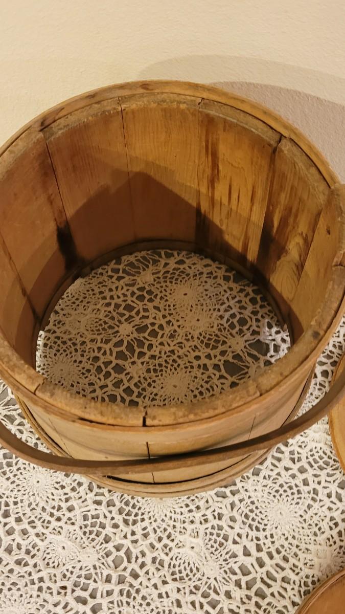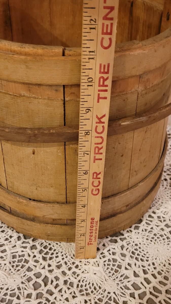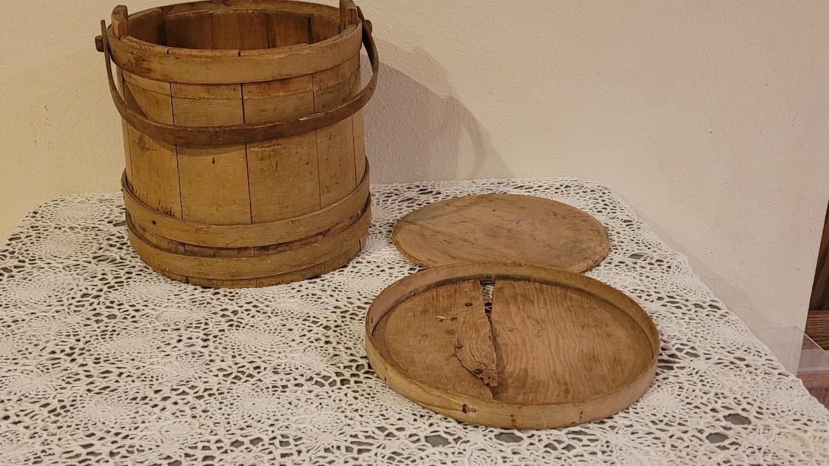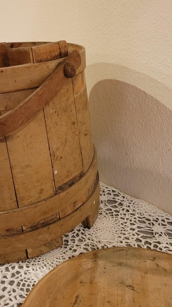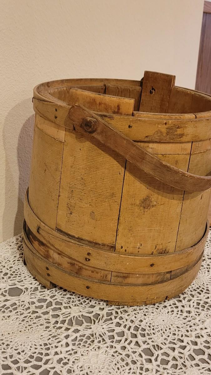 Lot 82: Antique Primitive Firkin Sugar Bucket (needs repair)