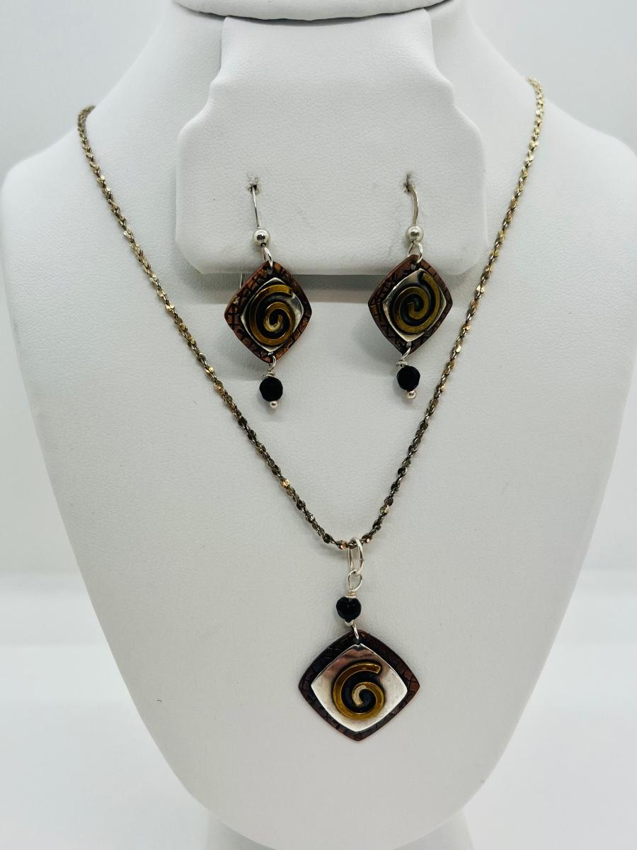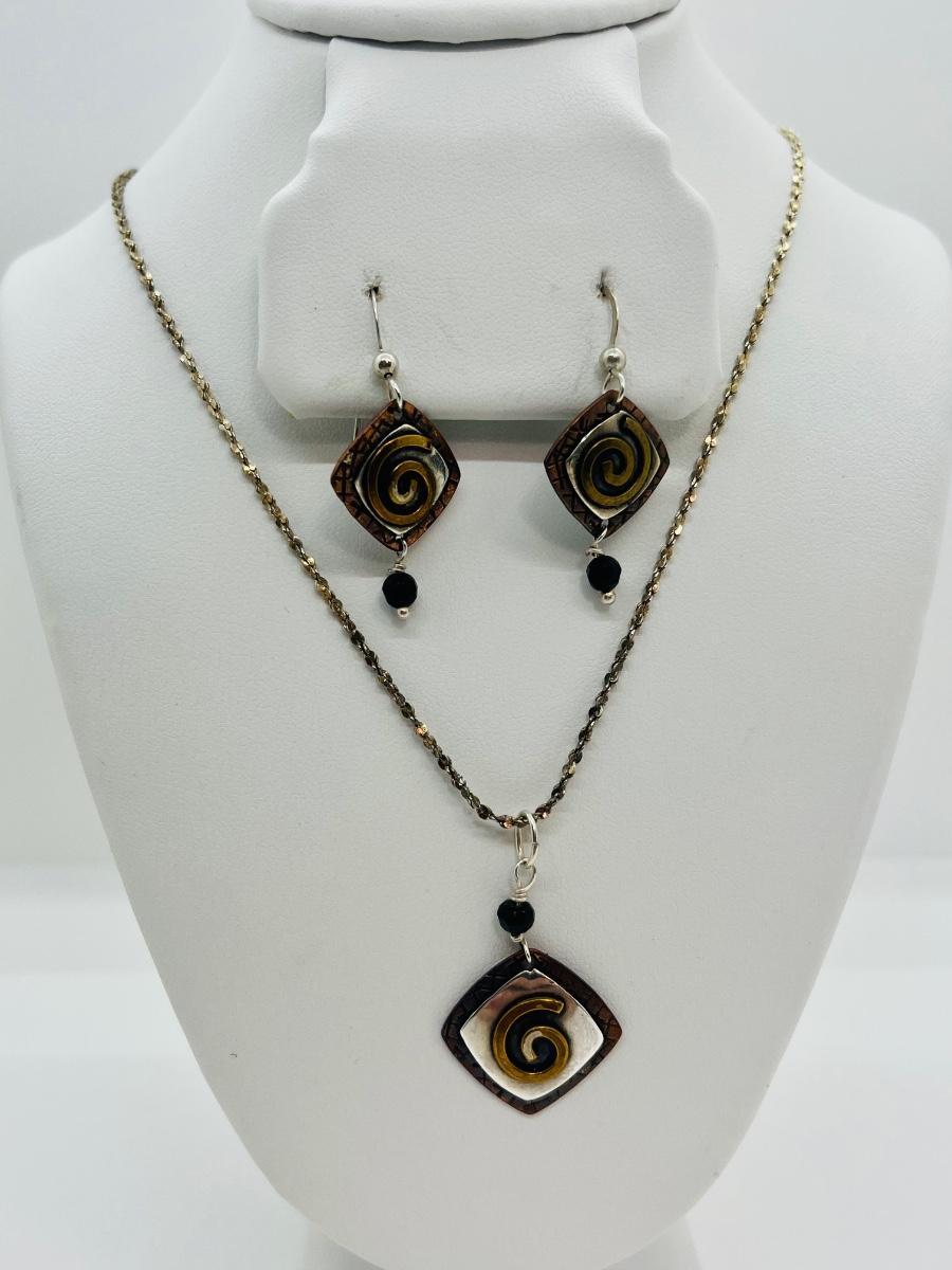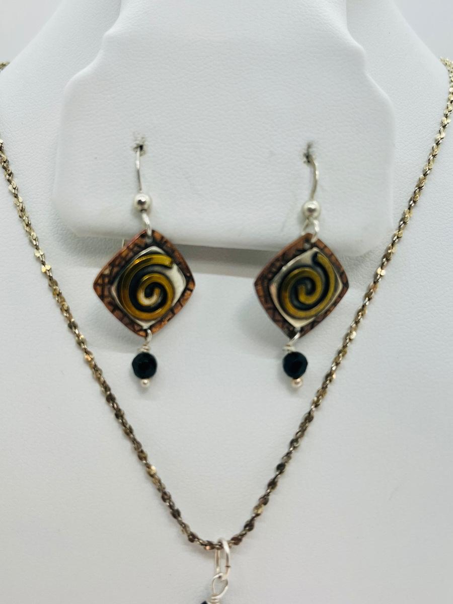 Lot 87: Gardella Sterling, Copper and Brass Pendant and Earring Set