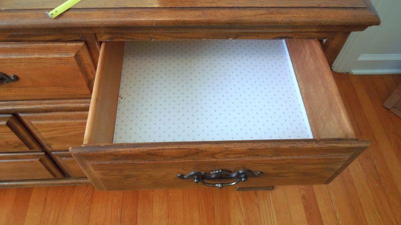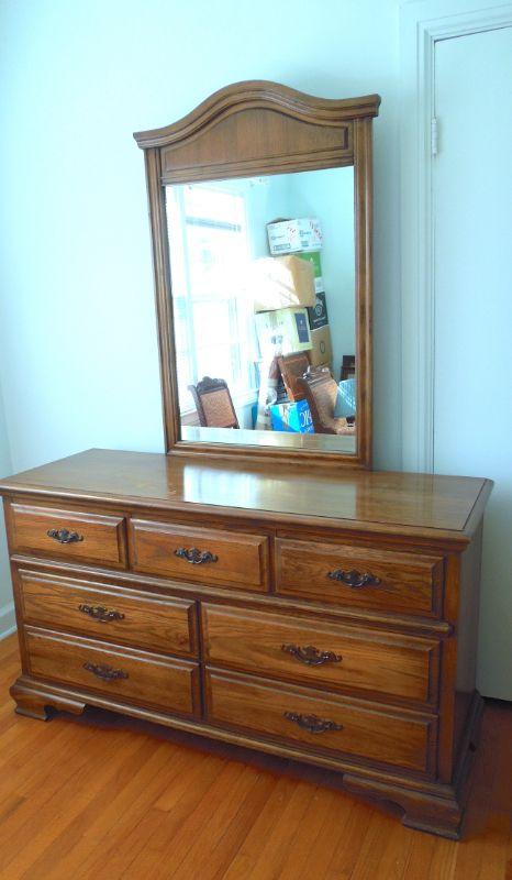 Early American style popular in the 60's and 70's. No manufacturer brand. Solid wood with walnut finish. Removable mirror. 7 drawers. 58" W x 20" D x 33" H chest. Mirror 30" W x 45" H. Total height 88". Water damage on top of dresser.