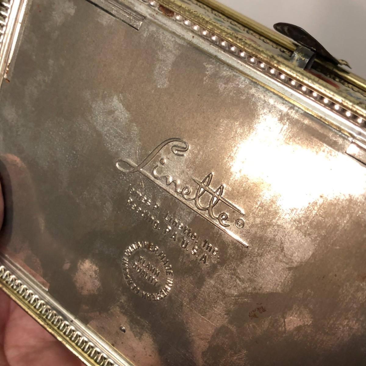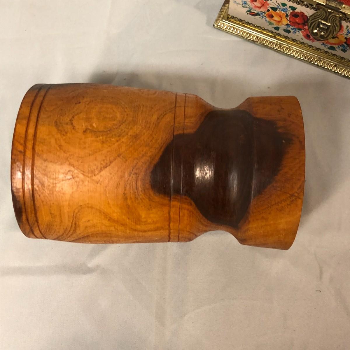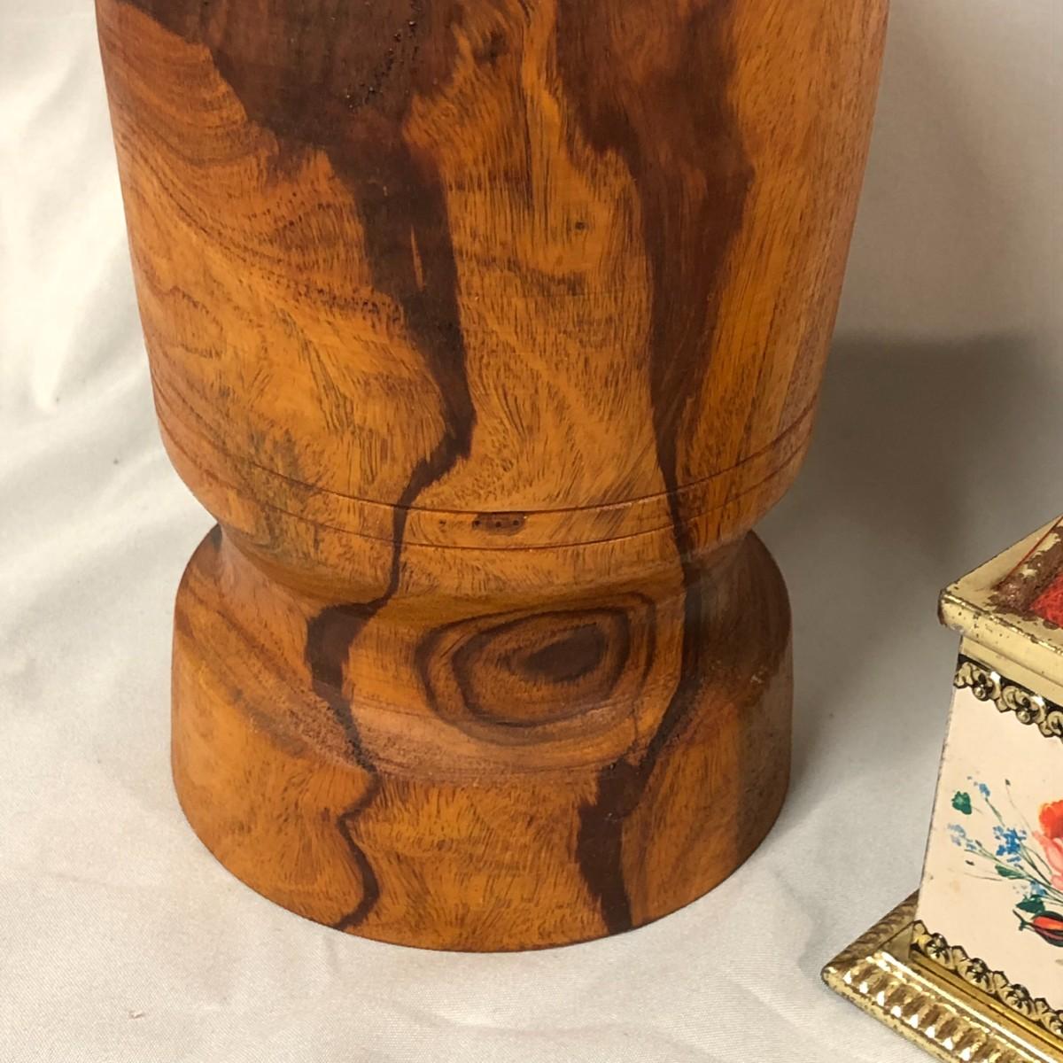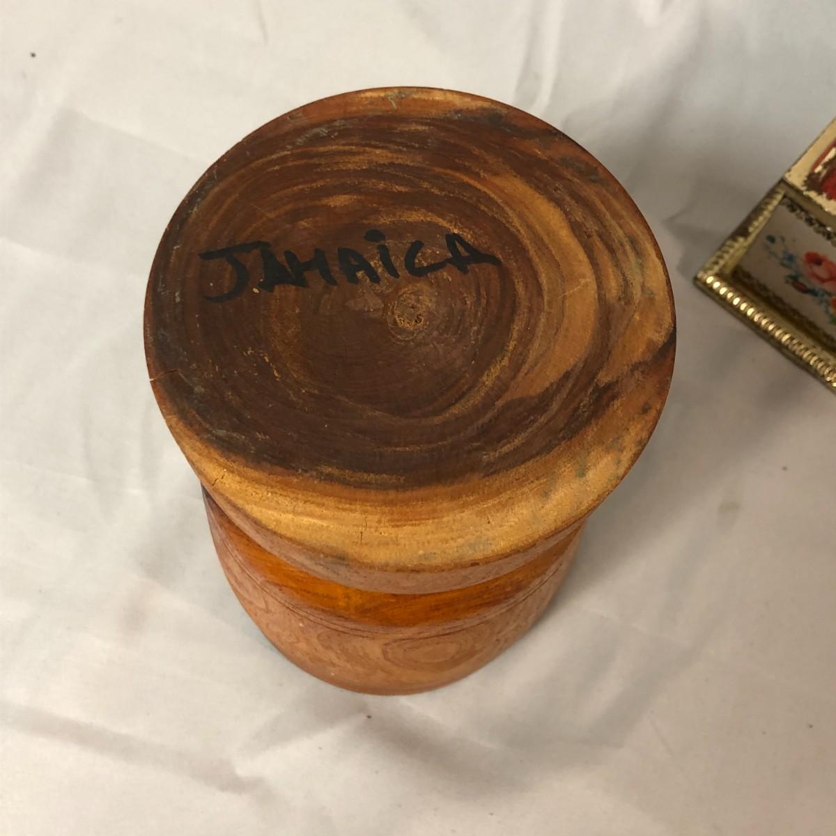 These don't really go together, but they shouldn't go alone either! The wood piece is a heavy piece of wood with beautiful natural markings. Jamaica is written on the bottom and it stands just shy of 7" tall. The tin candy box by Linette was made in Western Germany and is about 7" at the widest. Some discoloration to the metal on one side, but still pretty and still usable for jewelry or more candy!
