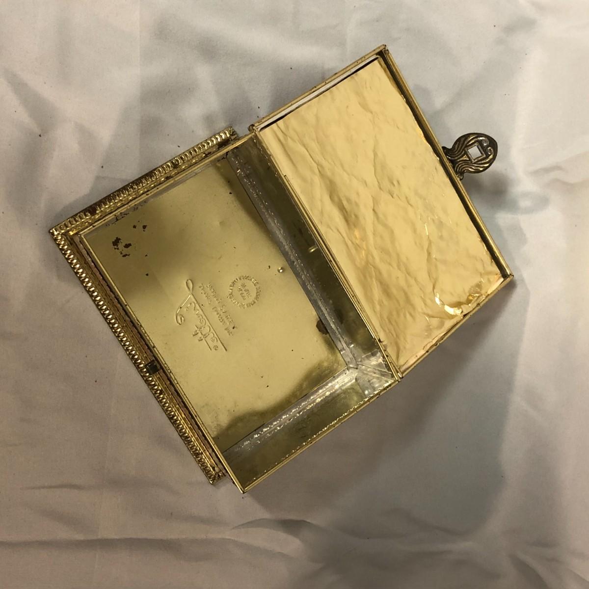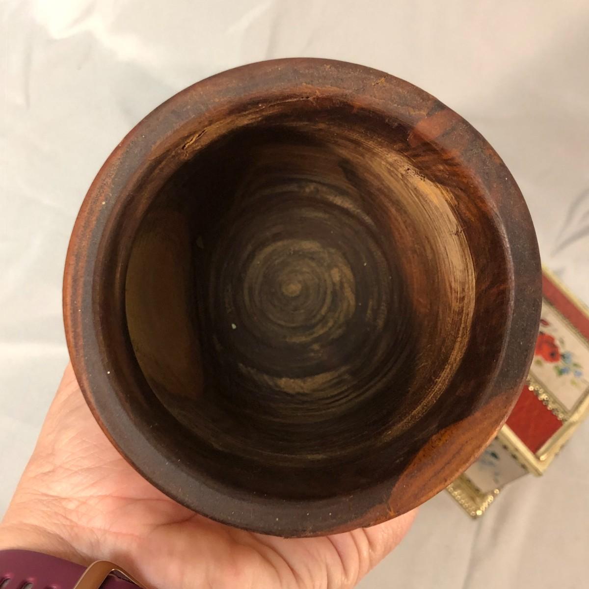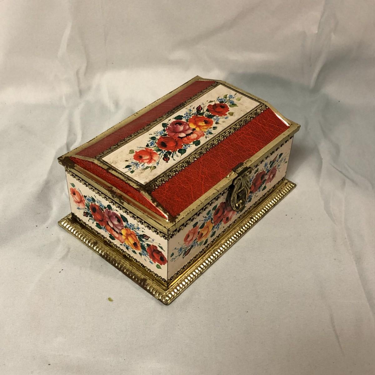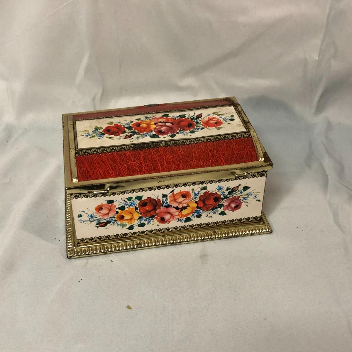 These don't really go together, but they shouldn't go alone either! The wood piece is a heavy piece of wood with beautiful natural markings. Jamaica is written on the bottom and it stands just shy of 7" tall. The tin candy box by Linette was made in Western Germany and is about 7" at the widest. Some discoloration to the metal on one side, but still pretty and still usable for jewelry or more candy!