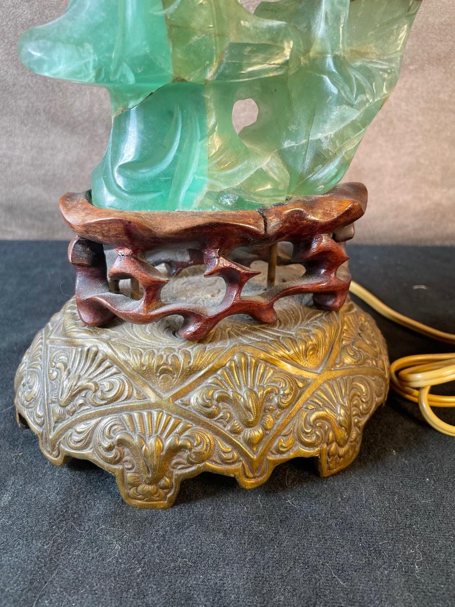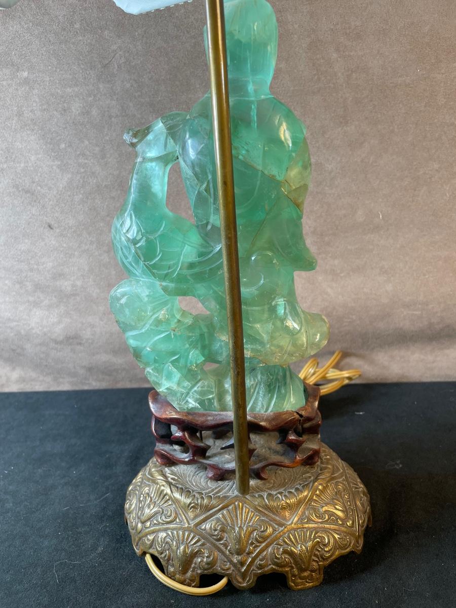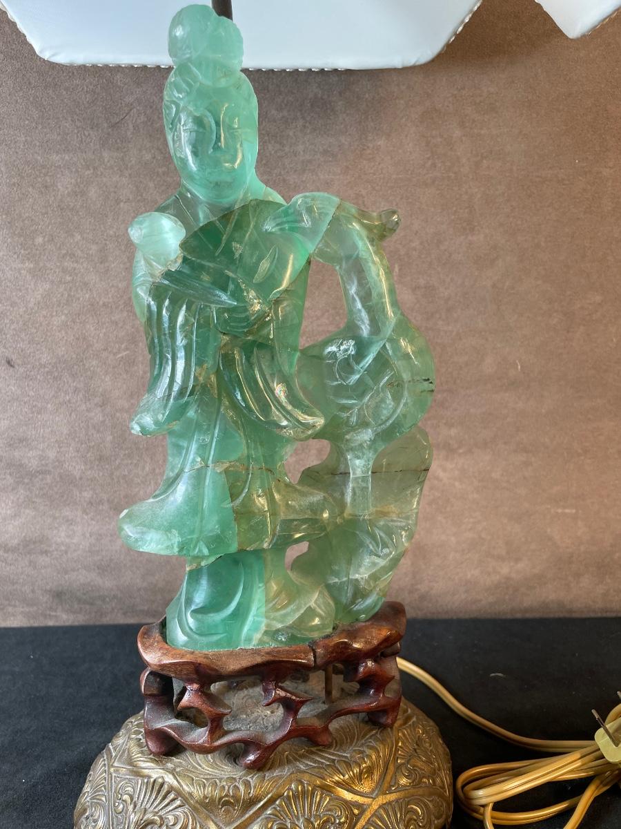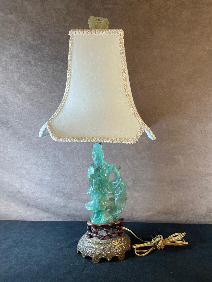 Lamp base is Asian figure hand-carved of stone (alabaster ?) on a wood base on a metal base very old and has many cracks. Shade is in excellent condition. 23.5" tall not counting finial