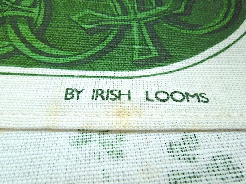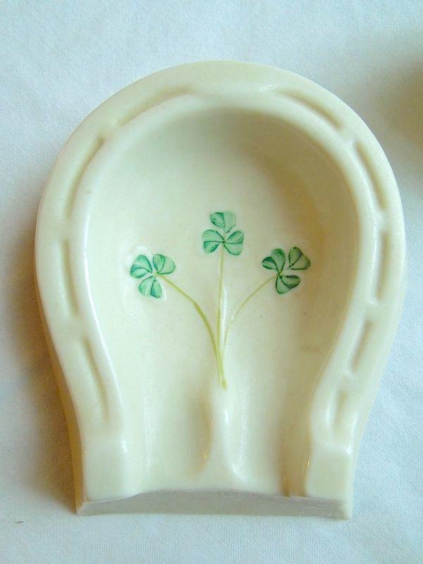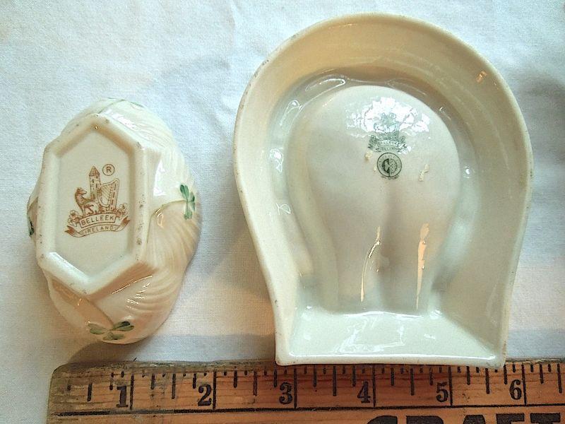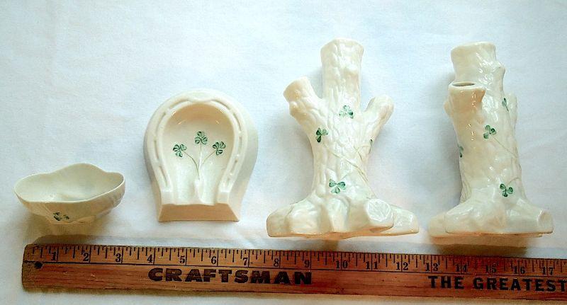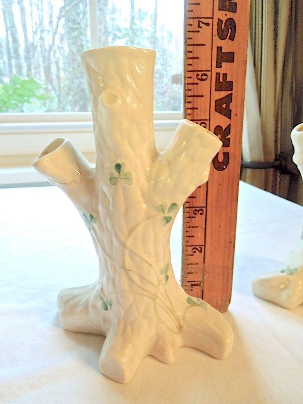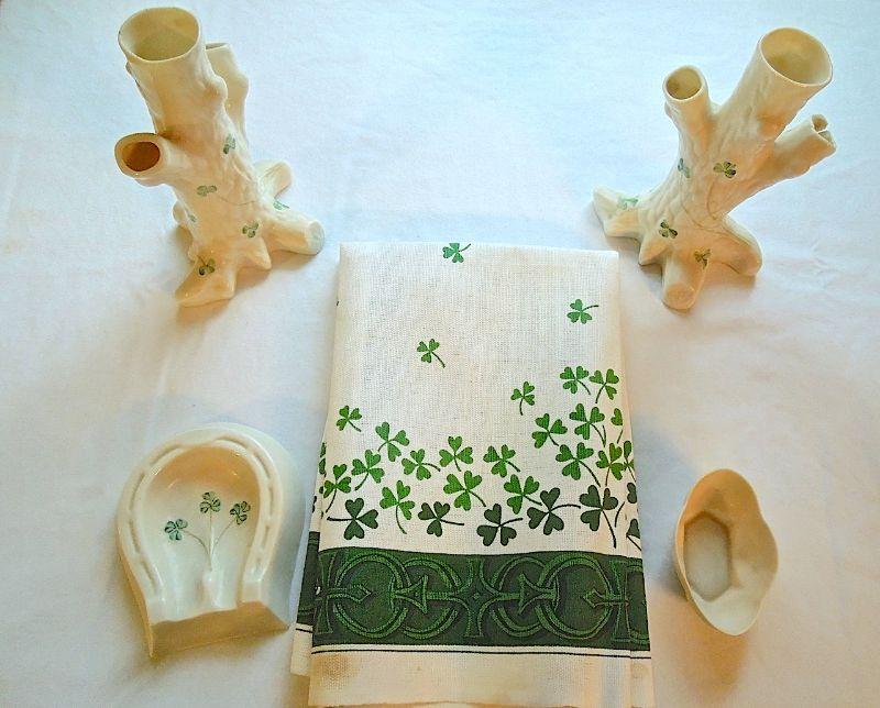 Two Belleek shamrock porcelain triple tree trunk bud vase 6.5" wiith green mar (one cracked); Belleek white porcelain shamrock horshoe dish spoon rest; small shell nut dish with brown mark. No chips or cracks other than mentioned. an irish linen printed shamrock tea towel with a few stains.