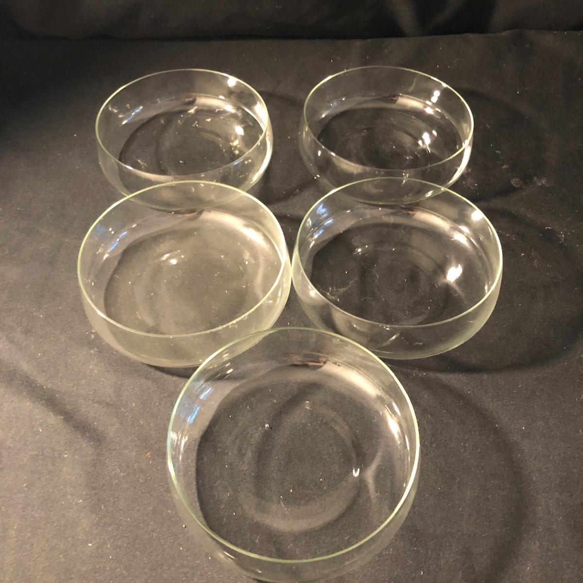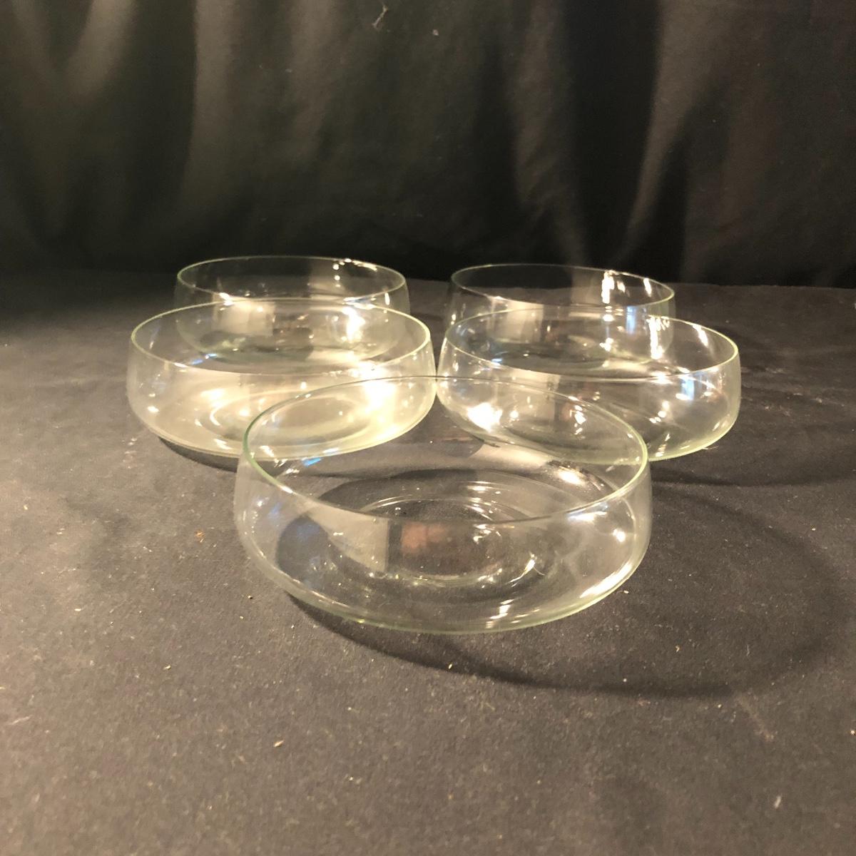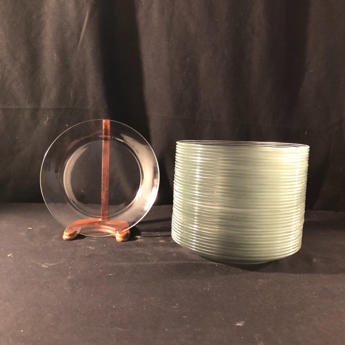 A large collection of over thirty Arcoroc French glass plates. Also includes three sets of six glasses in different sizes and five delicate glass bowls. One bowl has chip on top, see pictures. Plates measure 8”D.