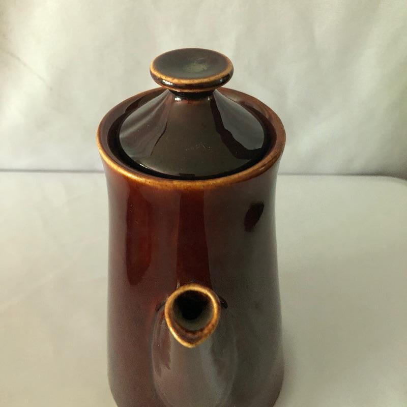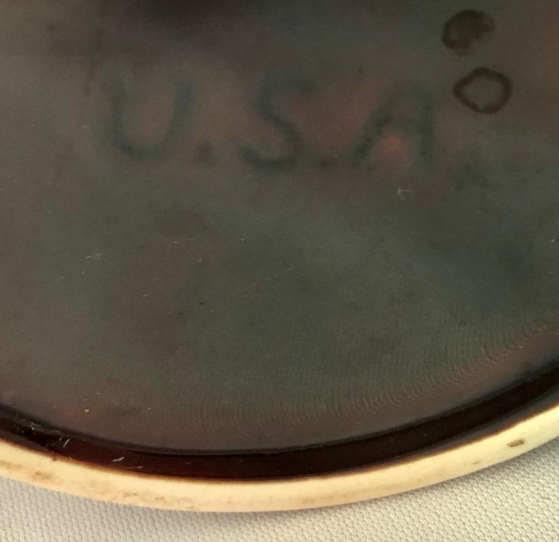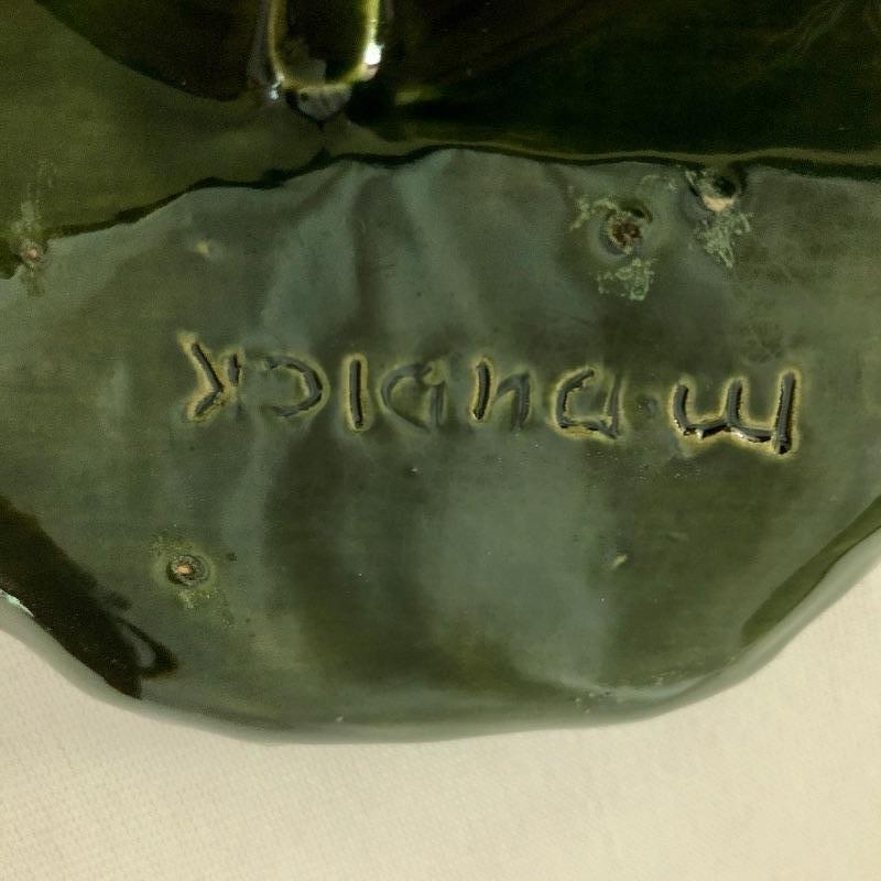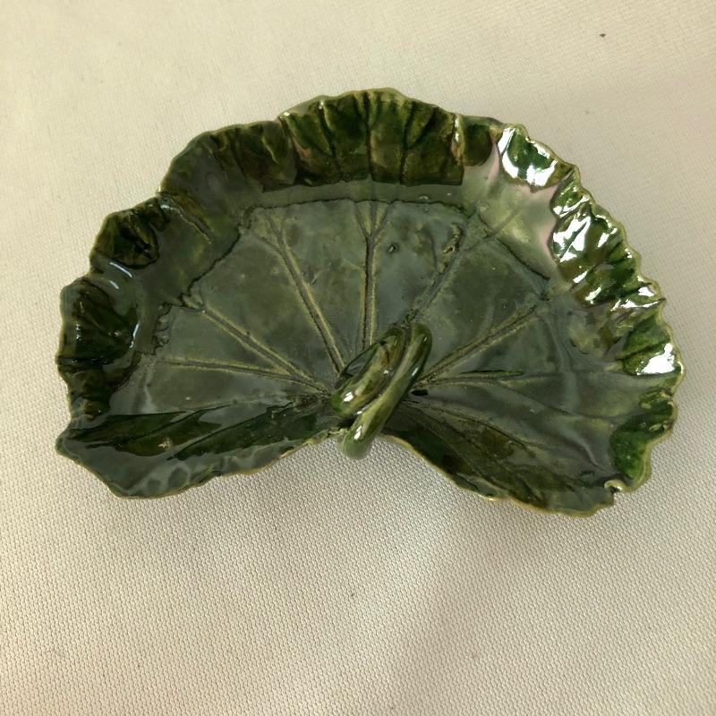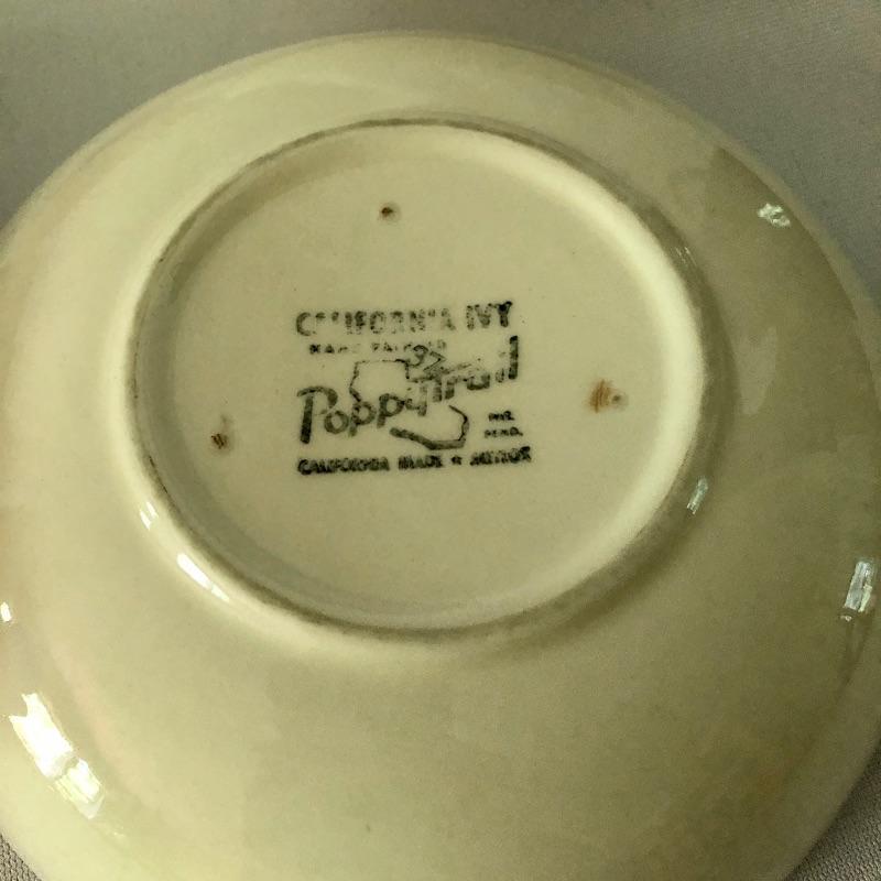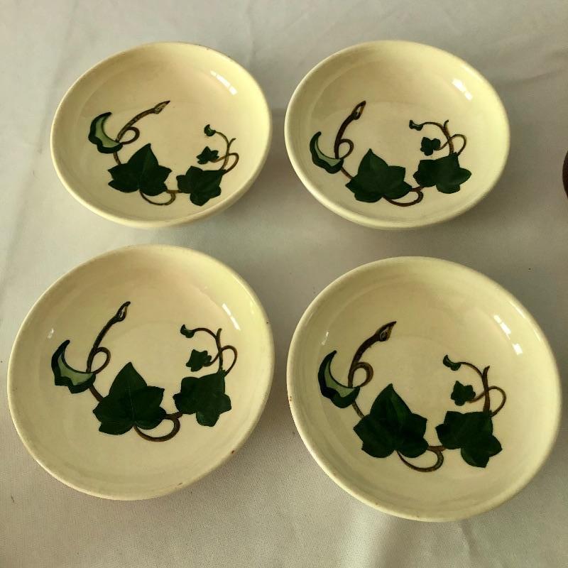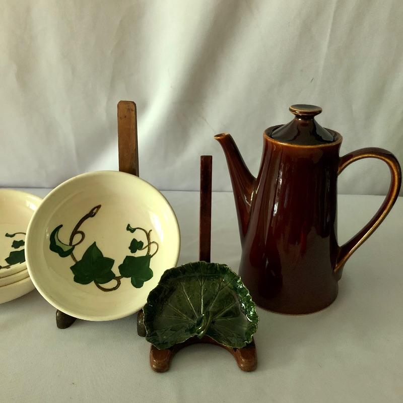 A nice eclectic mix of ceramic items in this lot that includes a brown teapot, a small leaf shaped coin dish and four bowls. The teapot is marked U.S.A and the small dish M. Dudick. The four matching bowls with an ivy design are called California Ivy and part of the Poppytrail collection.