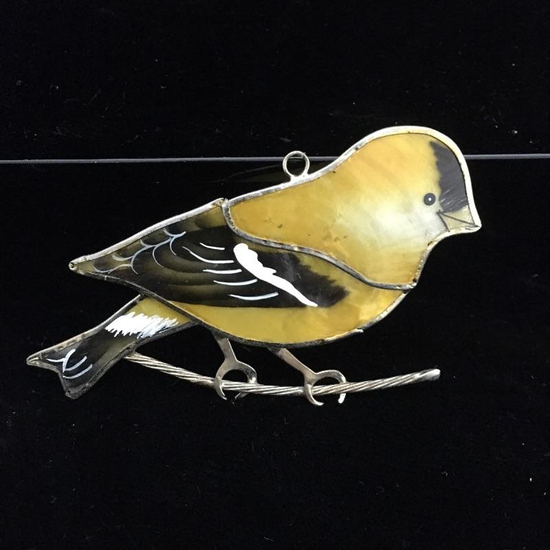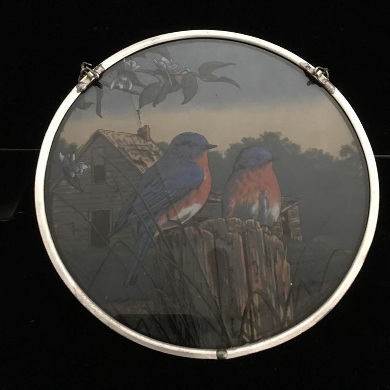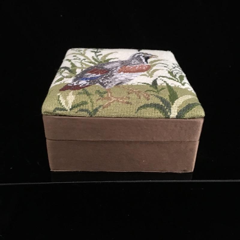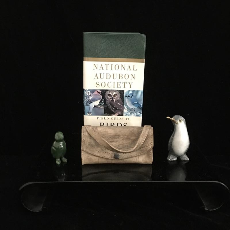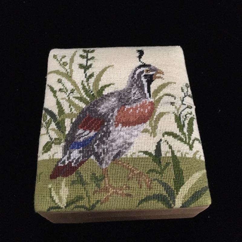 Bird lot includes needlepoint box, two stone birds, ceramic field bag, framed artwork, Audubon book and a hanging glass decoration that has a crack, see pictures. Frame measures 11.5” x 15”.
