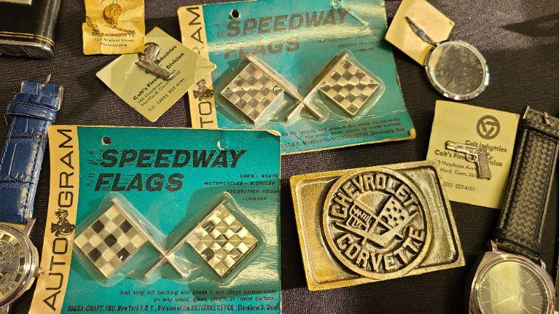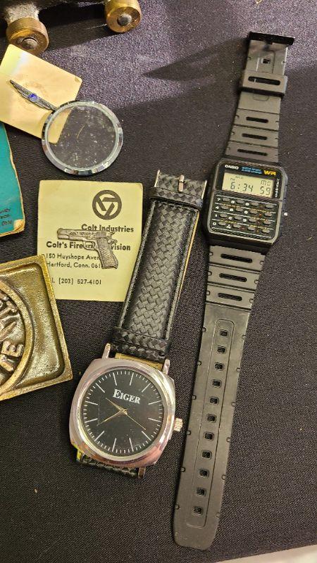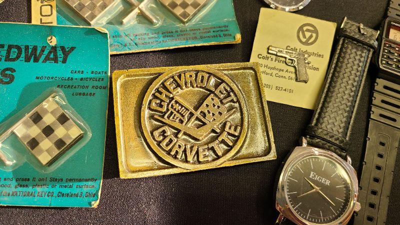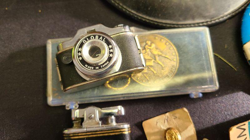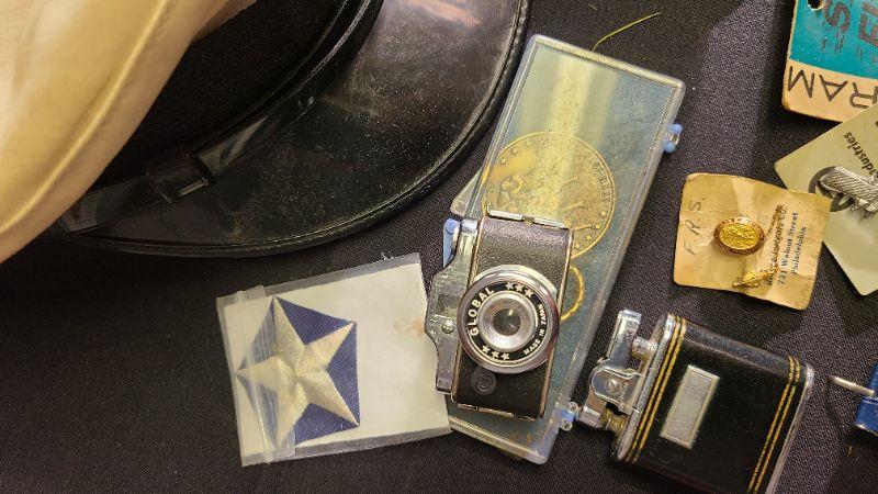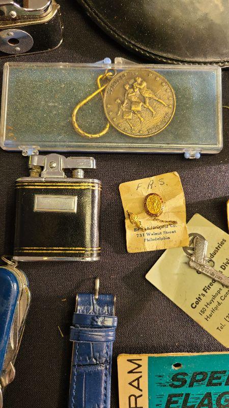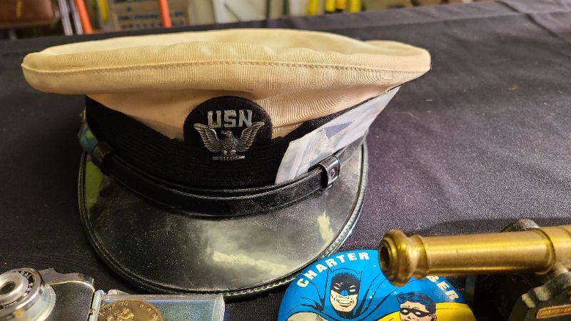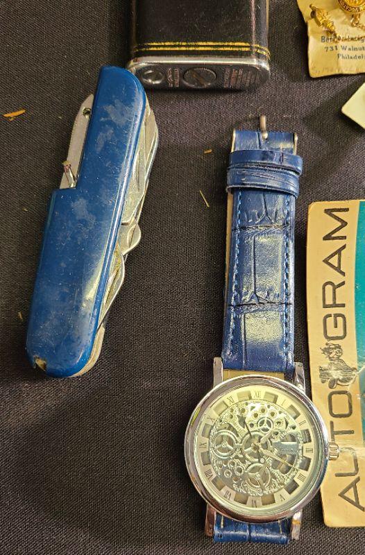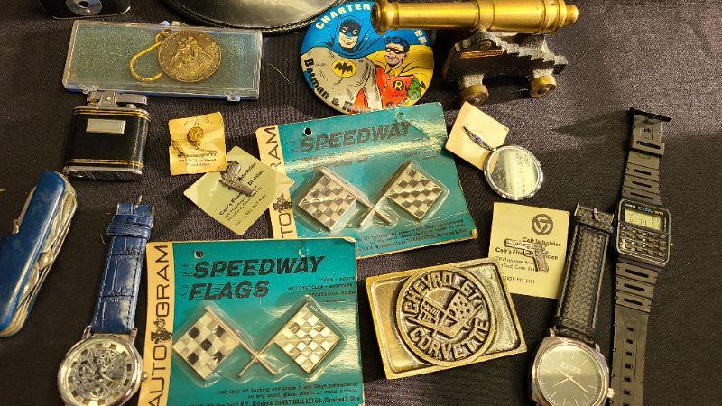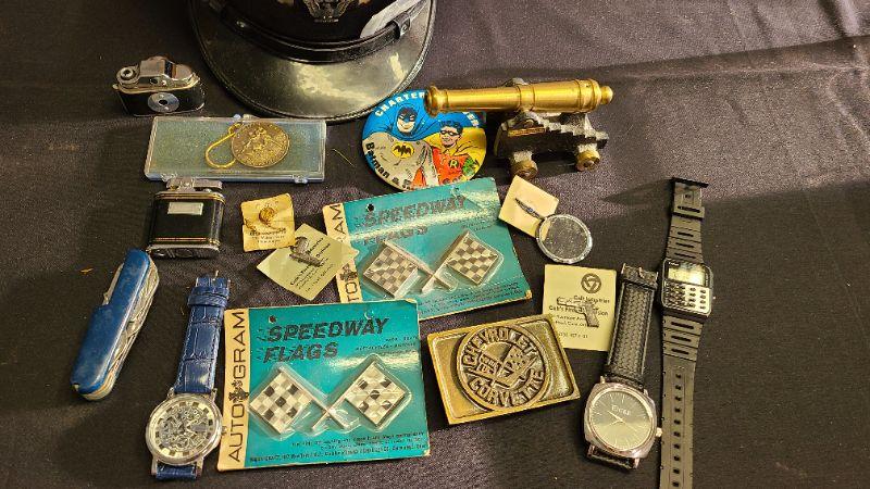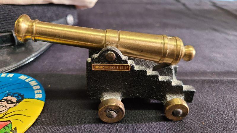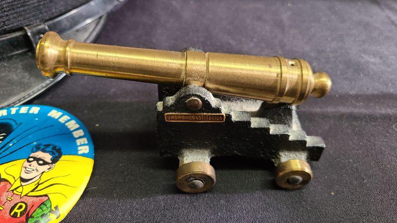 Small USS Constitution brass and cast iron cannon, vintage watches, a lighter and more.