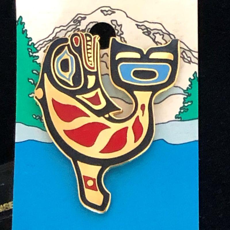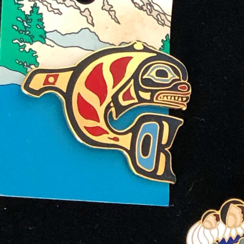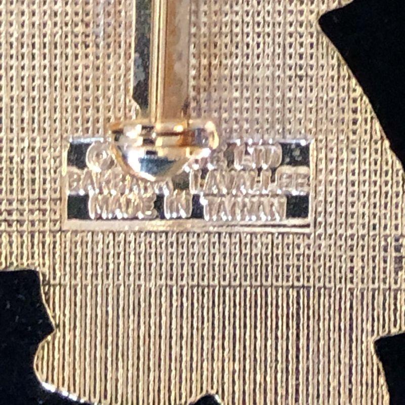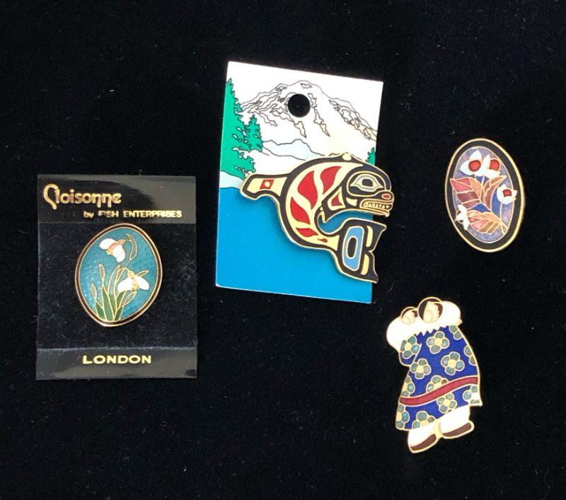 These pins are all in like new condition. The one pin can be a cat or a fish depending on which way you direct it. The cat/fish is marked Ivory Jack's Trading Co, and the other marking is too hard to read.
