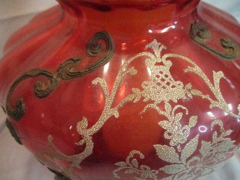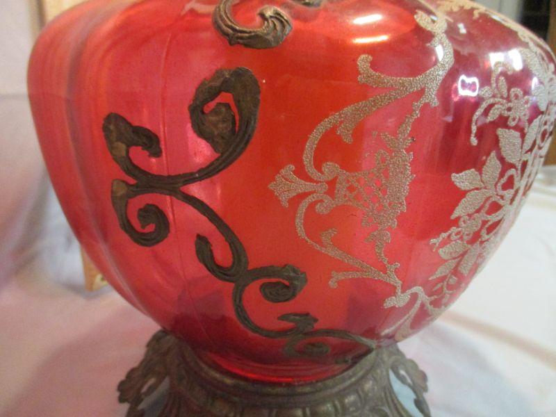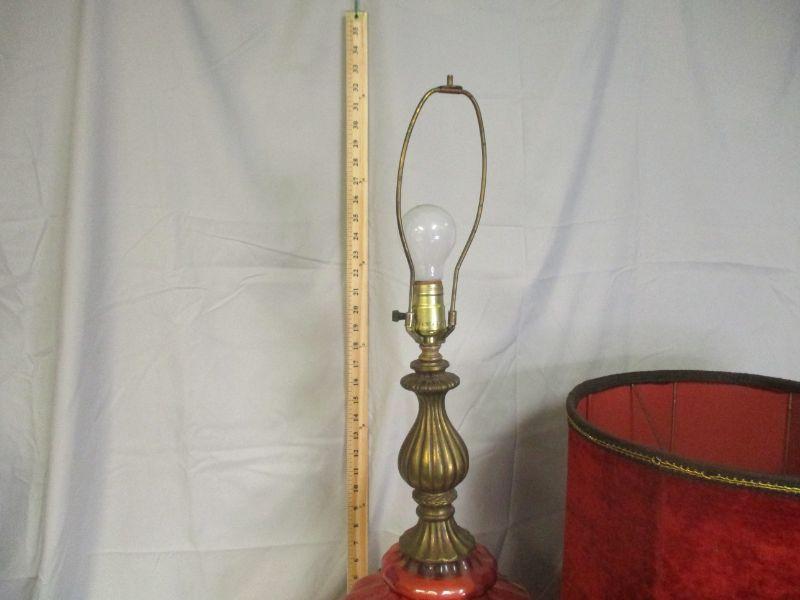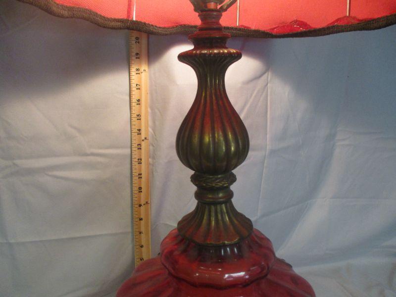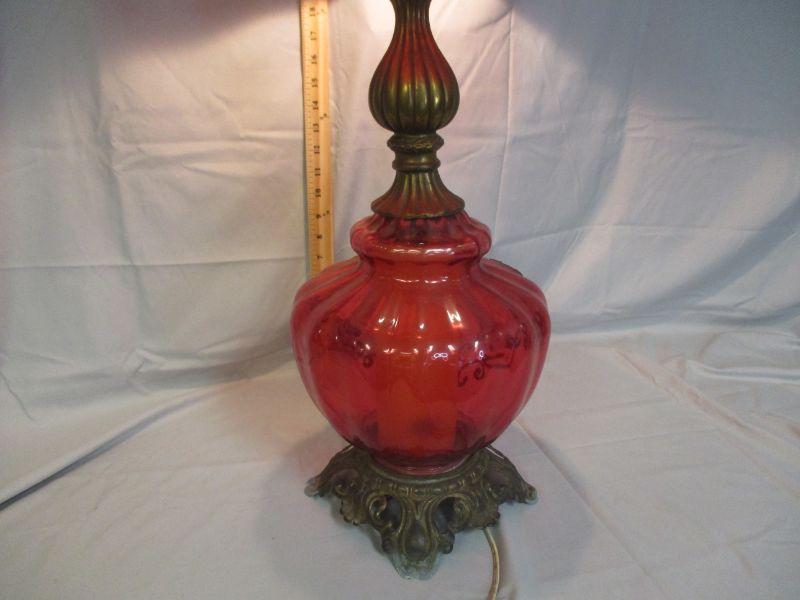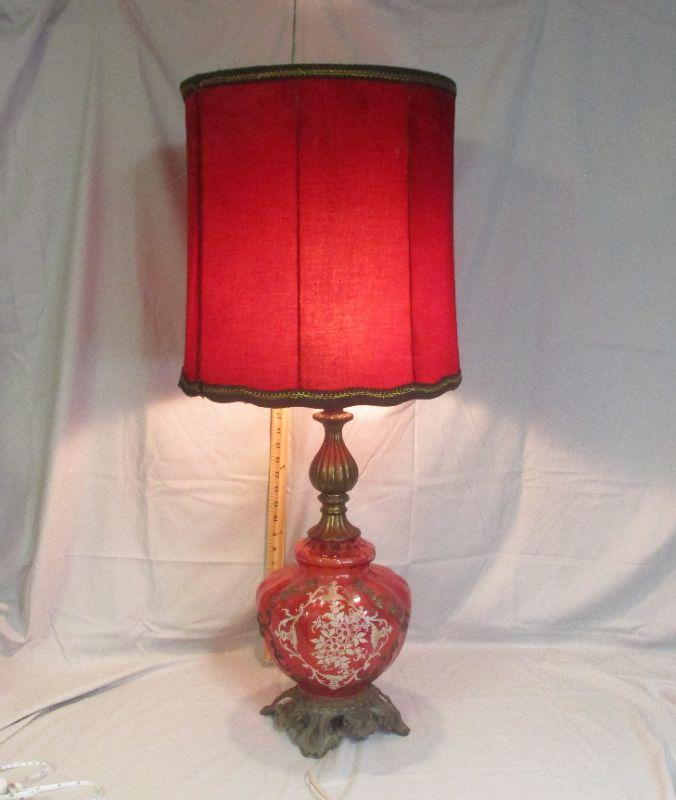 This is a GORGEOUS lamp - the pictures don't do it justice! It has a cranberry glass base with a gold and white painted design sitting on a brass foot. The neck of the lamp is also metal. It is 31.5" from the base to the top of the finial, with the lampshade on it it 37.5" tall. The lamp uses a three-way bulb and matches Lot 86.
