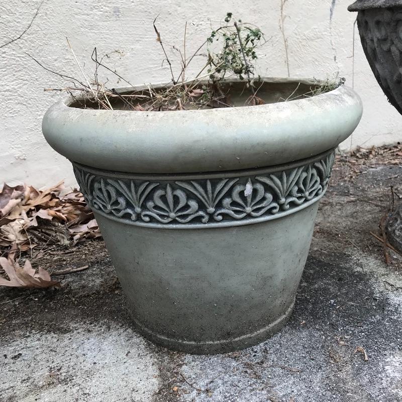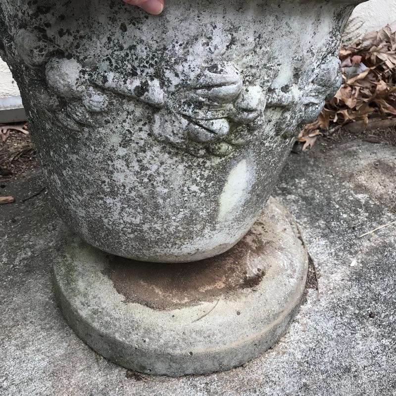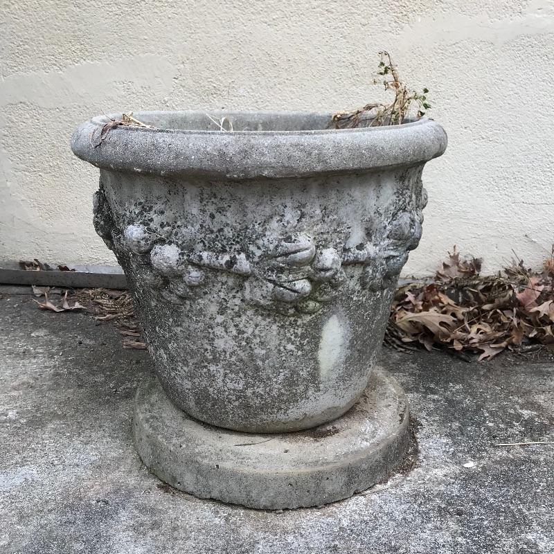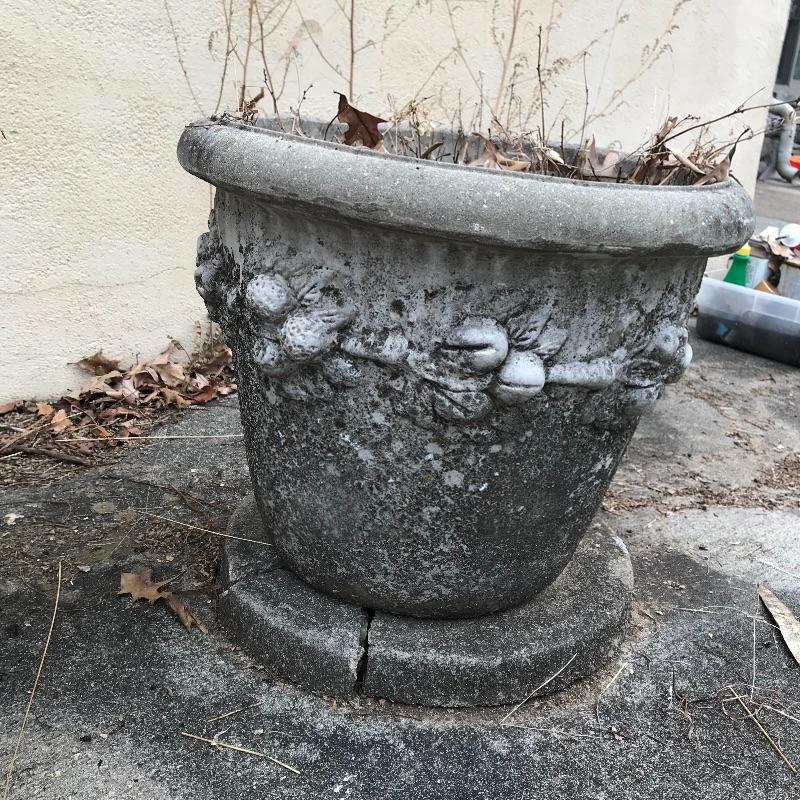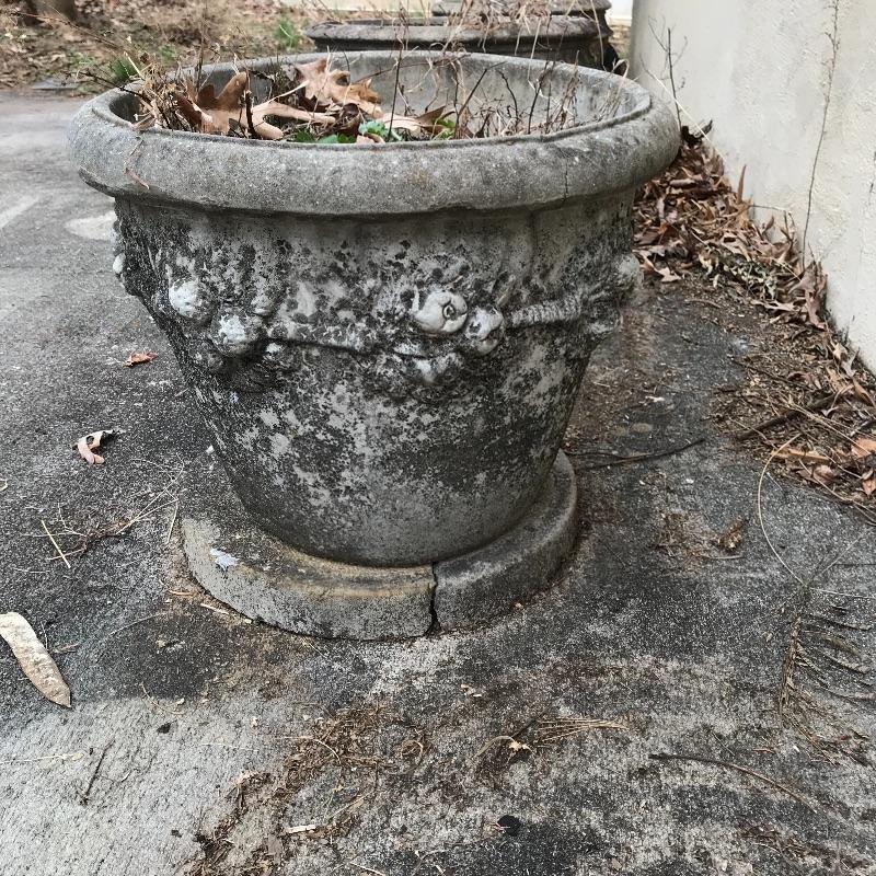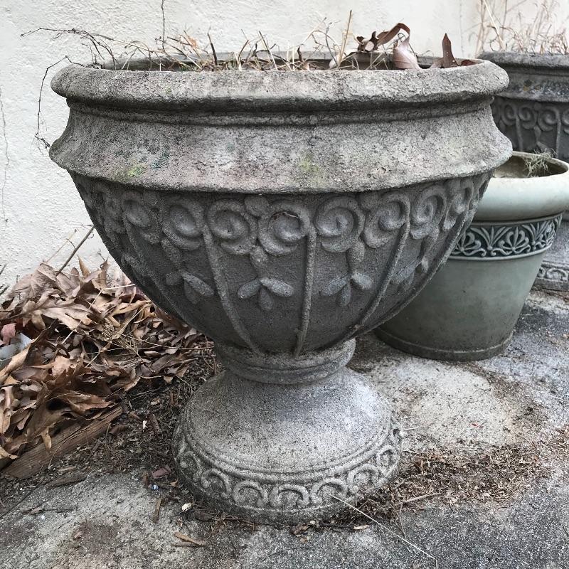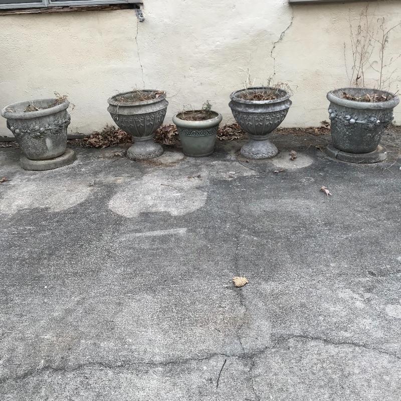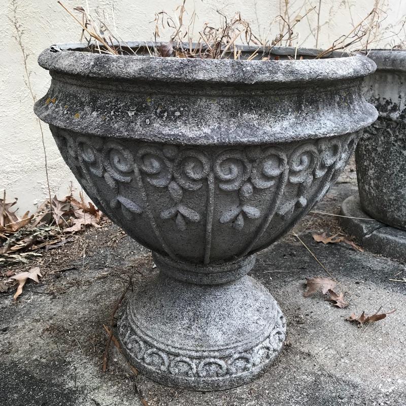 Two matching pairs of urns along with a single beautiful planter complete this collection. The two largest urns are solid concrete and three smaller ones are plastic resin with concrete faux coating one large urn sitting on separate platforms and measure approximately 18.5”d x 17.5” with platform base. One platform base has split into three pieces, but it doesn’t hinder the balance of the urn itself. Buyer may choose to forfeit broken base if desired. One urn in the middle sized pair is a and has a crack in the rim noted in photos. The two large ones are significantly heavier than the smaller three. Please bring help to load, All five urns are located in the driveway for simple loading. No shipping.