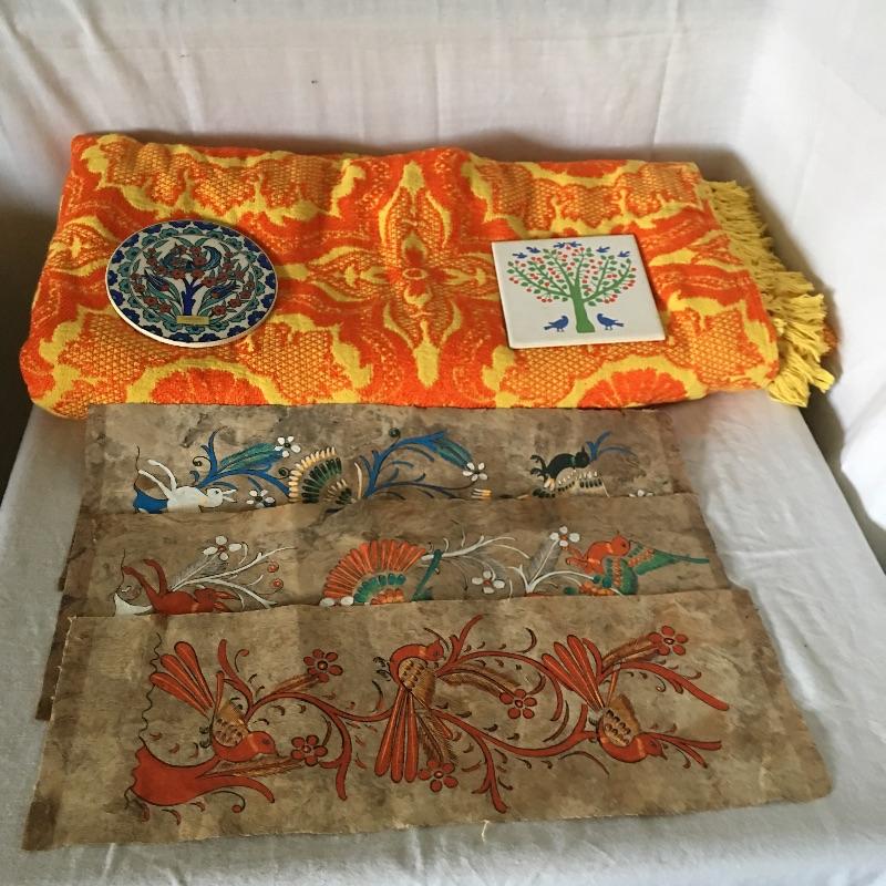 Folk art and throw includes a Turkish tile, three pieces of art called Amate Bark Paper Art, tile folk art of the institute of Chicago and a colorful throw blanket. You will love how this throw will brighten up your home with its vibrant colors and the tiles and artwork will definitely get the conversation started. Throw measures 94” x 104”.