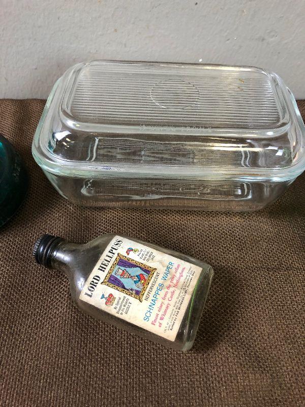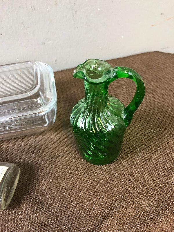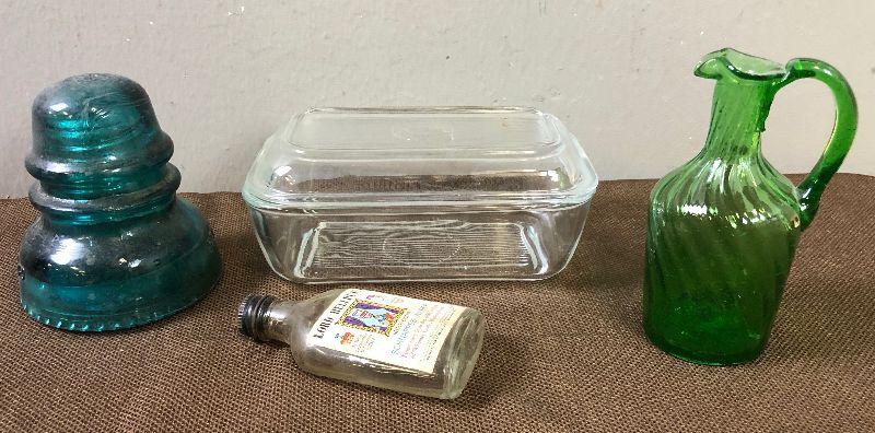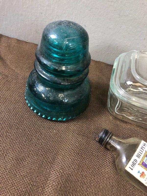 Lot #87 Glass Refrige. Container with lid, vase, insulators