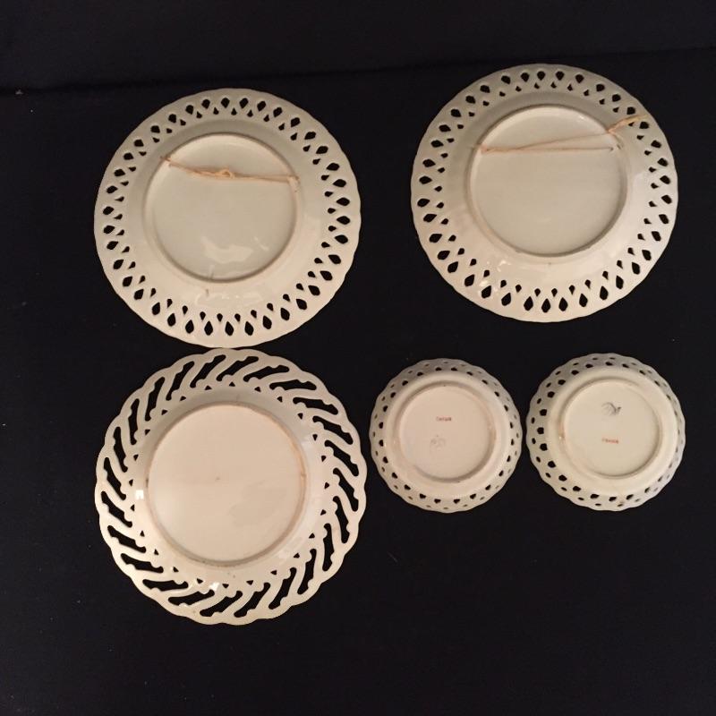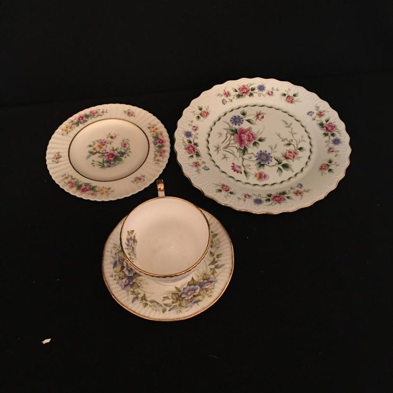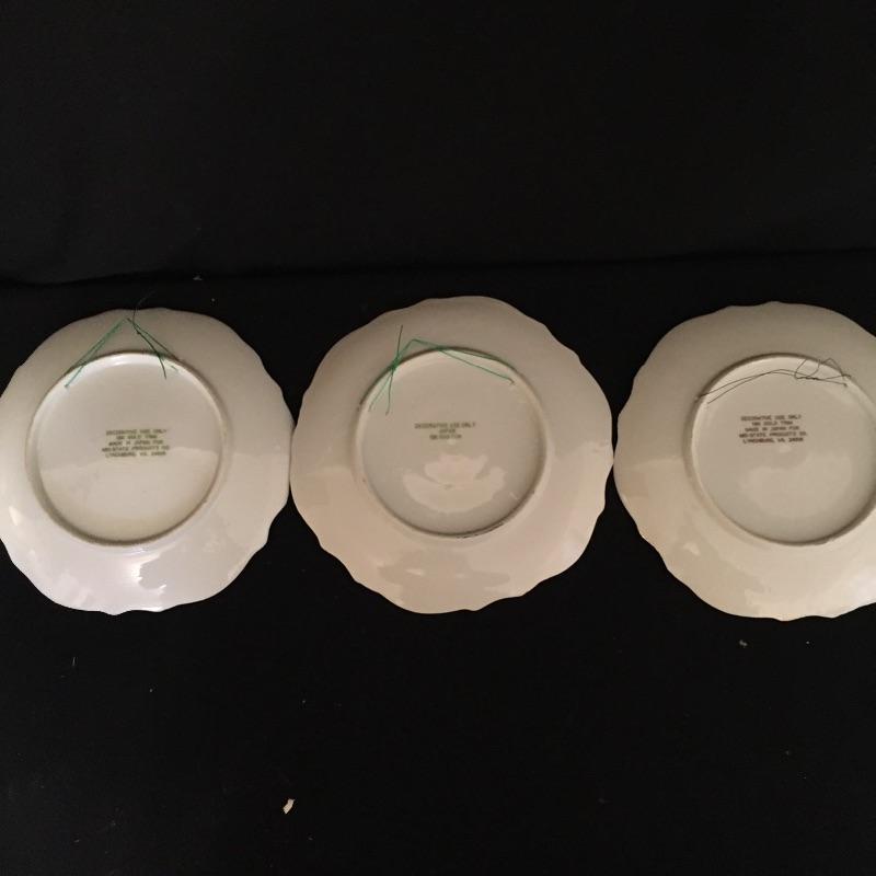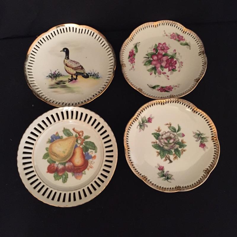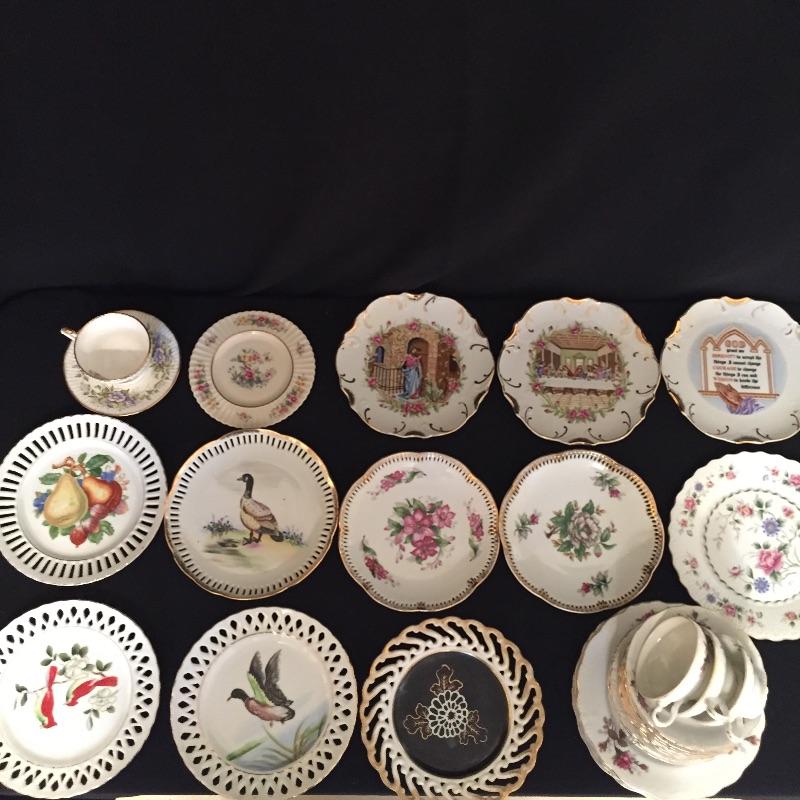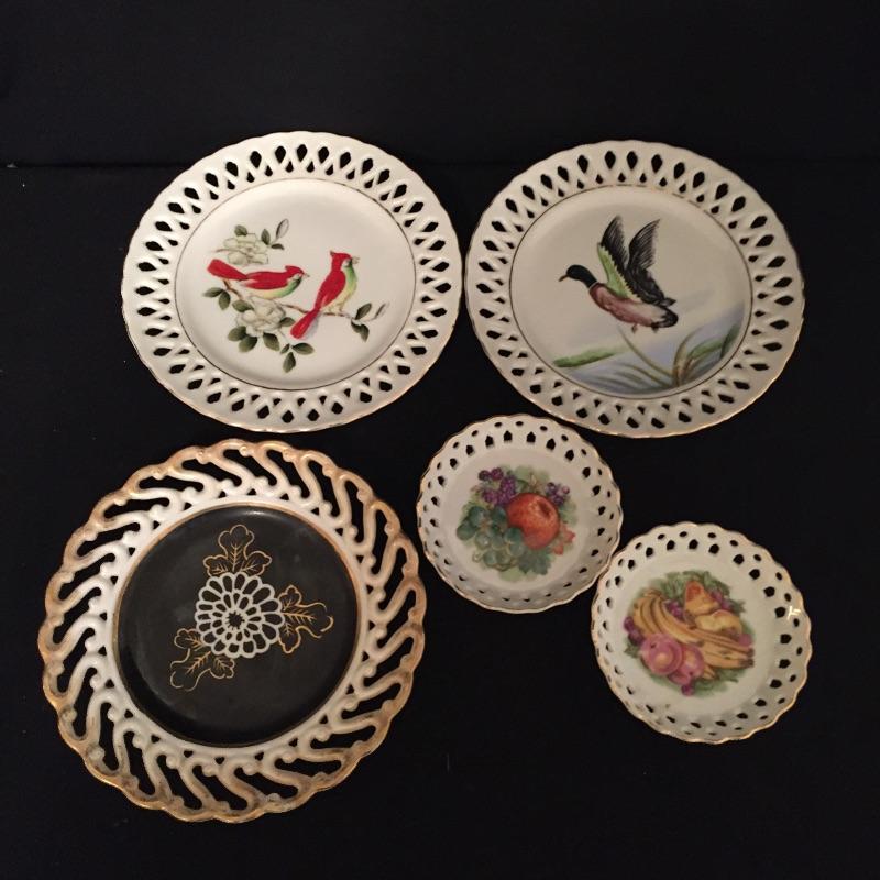 Large selection of gold rimmed dishes in various sizes and designs. Use for dining or for decor. Largest plate measures 9” D.