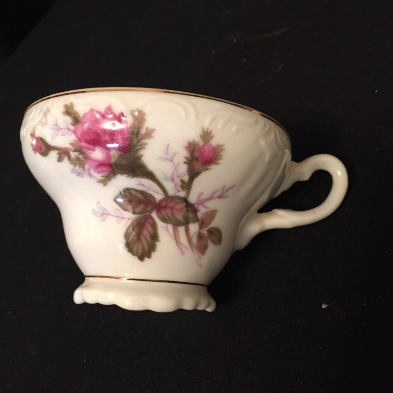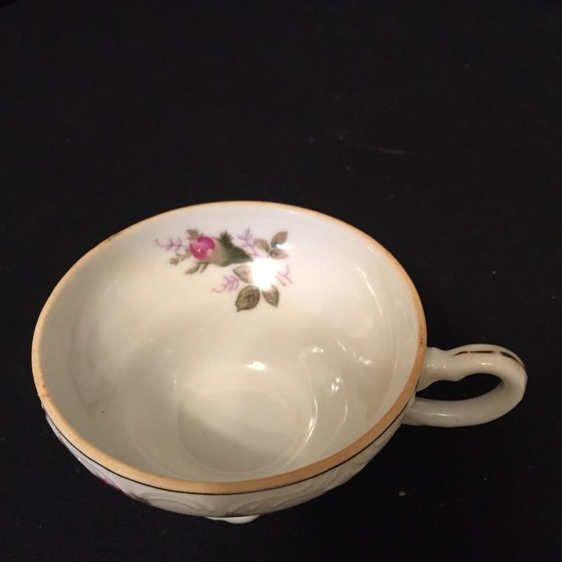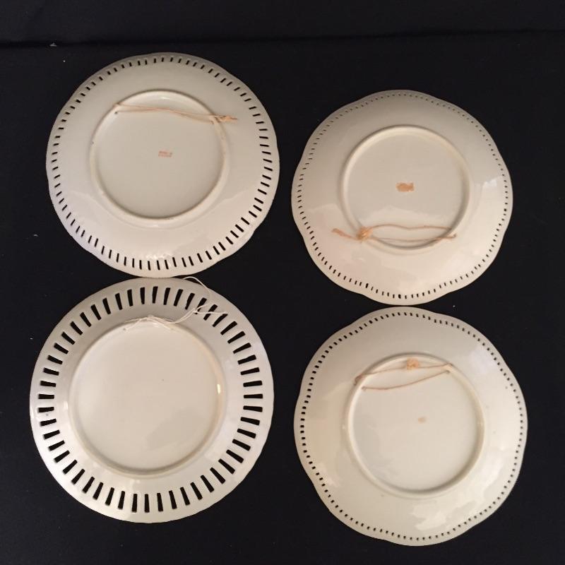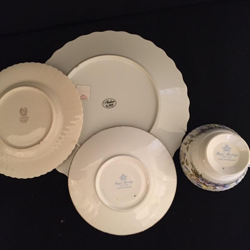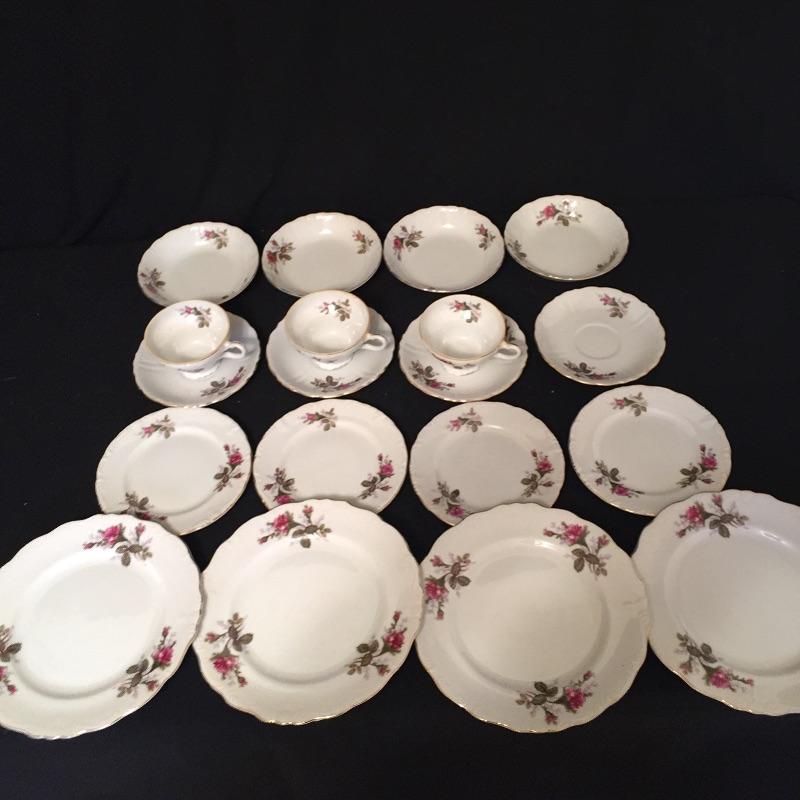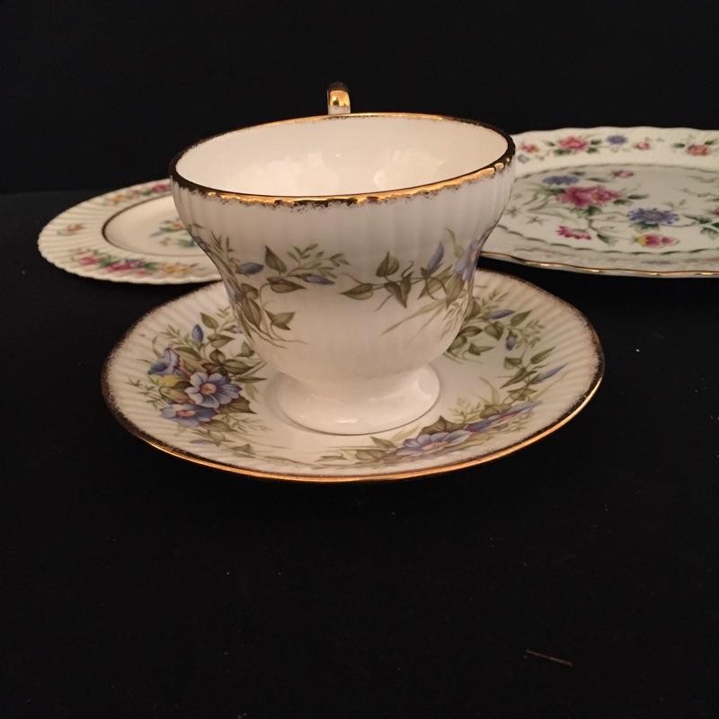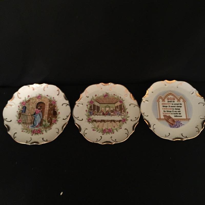 Large selection of gold rimmed dishes in various sizes and designs. Use for dining or for decor. Largest plate measures 9” D.
