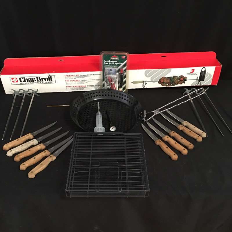 Its summer and its grilling time. Add to your repertoire with these grilling accessories that includes a Char-Broil electric rotisserie, ten steak knives, six skewers, grilling basket and pan, thermometer and more.