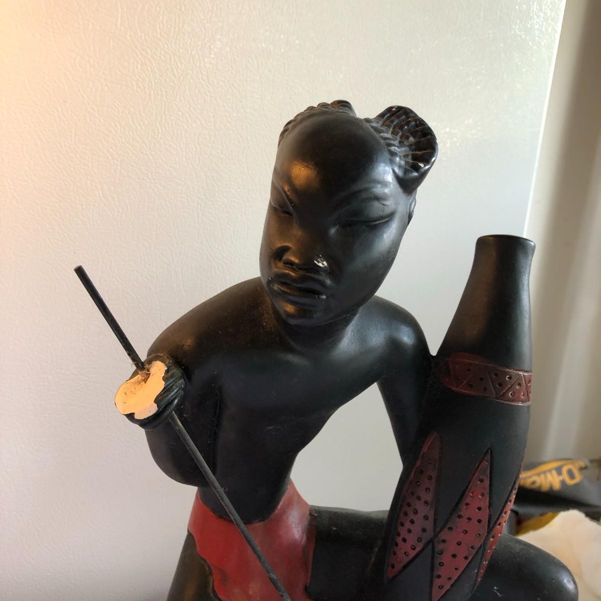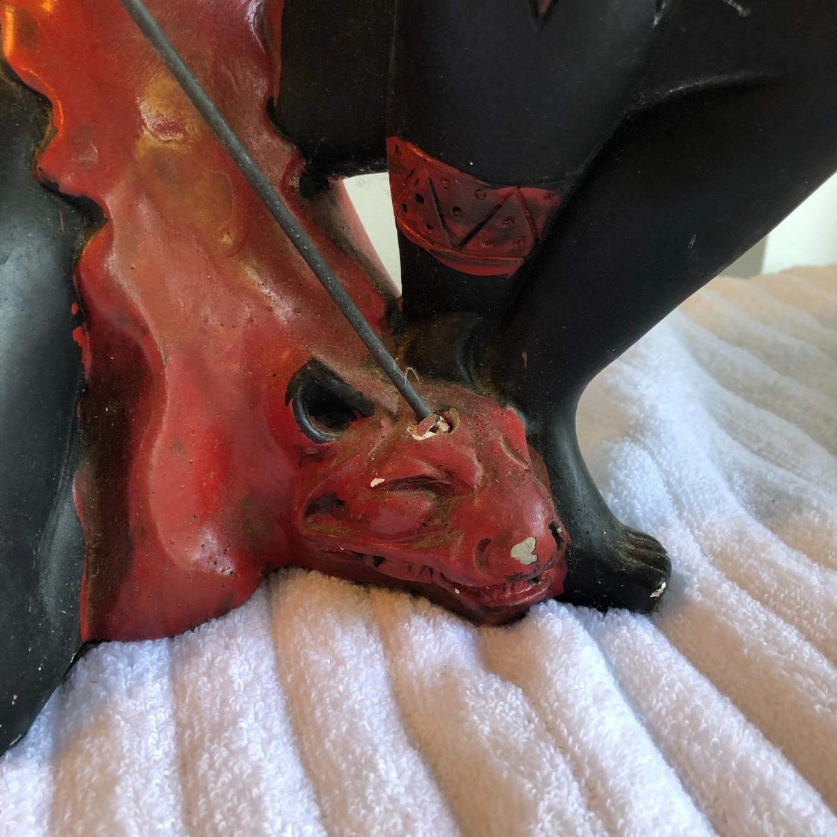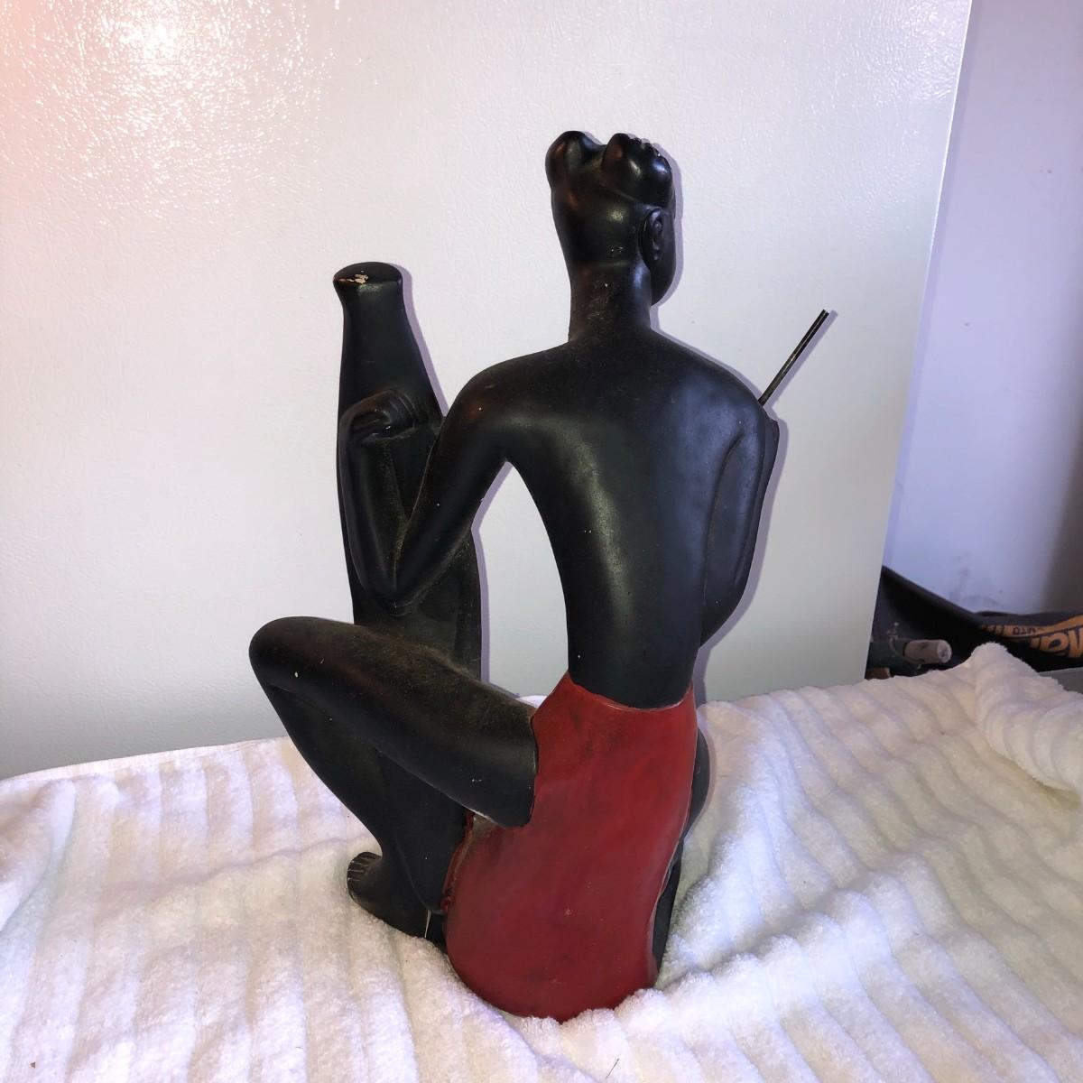 This figurine of a hunter standing over his prey is made of a heavy plaster. He stands about 15" and the main point of damage is to his hand, but that could be hidden with some paint.