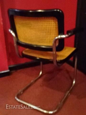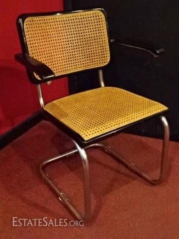 LOT 87: MARCEL BREUER CANTILEVER ARM CHAIR BY THONET, TUBULAR CHROME STEEL FRAME, CANE SET AND BACK, BLACK FINISH, WITH ORIGINAL THONET LABEL, VERY GOOD CONDITION, APPROX 31.5"H X 21.5"D X 22.5"W, SKU3367.12