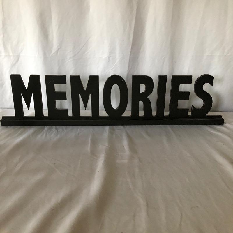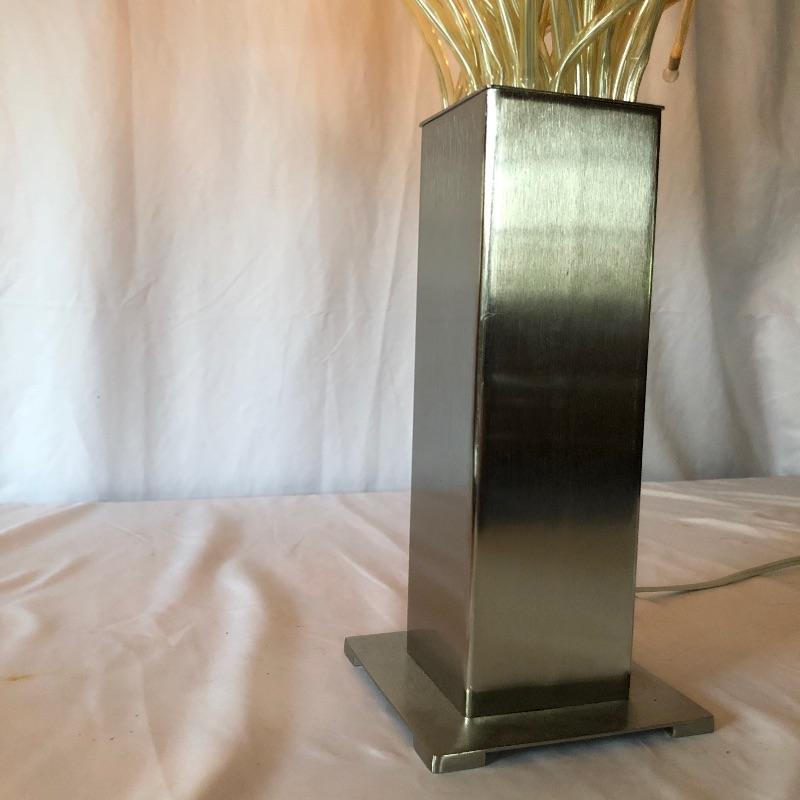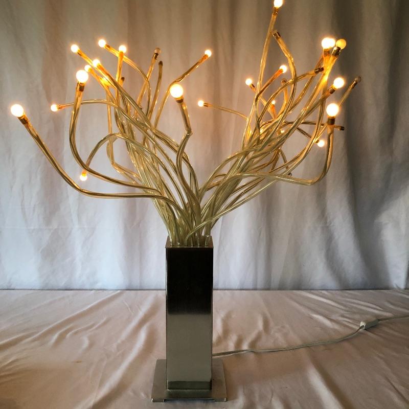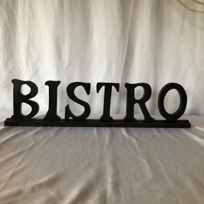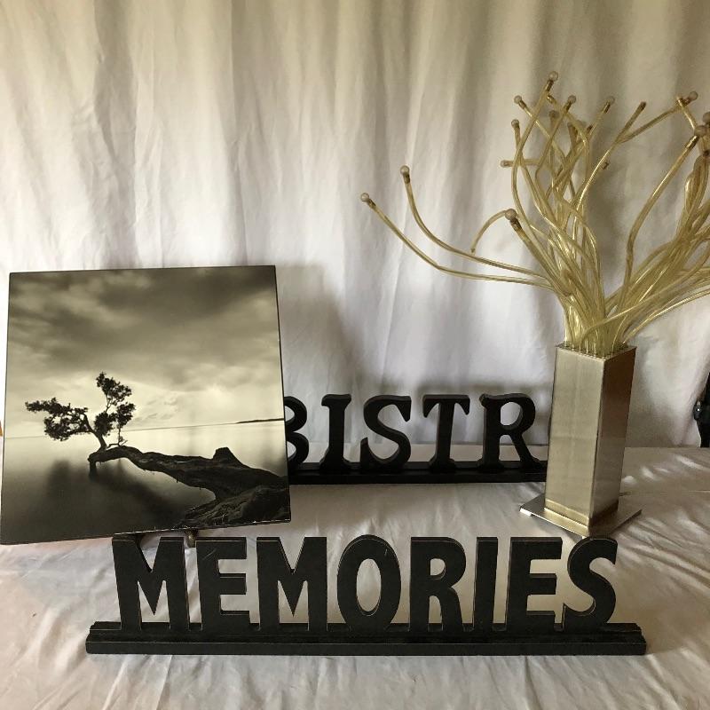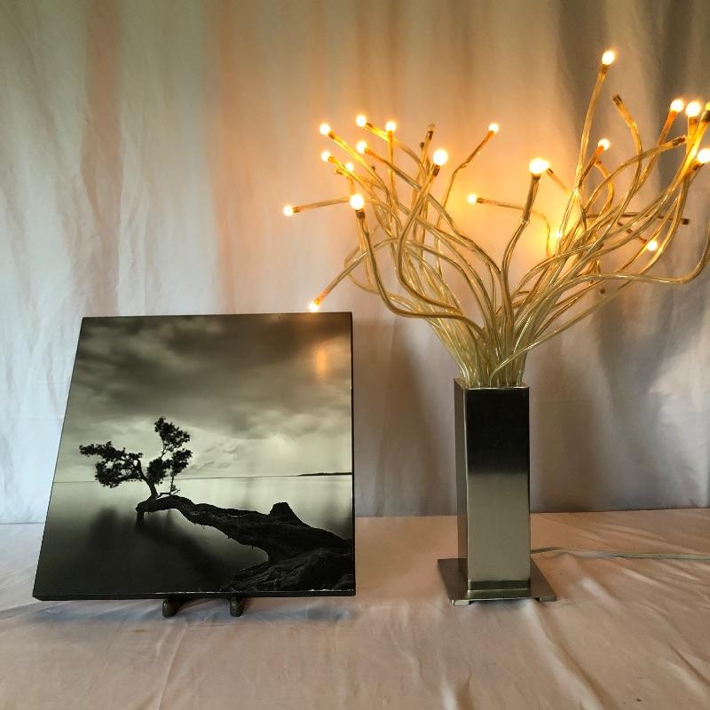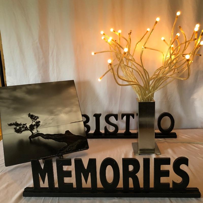 This unique lamp is made up of rubber straw like tubes with small bulbs at the ends. These tubes are flexible and can be arranged however you like; they are encased in an aluminum base with an in line switch. Six bulbs are missing. The photograph on canvas is mounted on a wooden frame and is a black and white lake scene. The two Bistro and Memories signs are black wood and they measure 26.5” x 12.5”. There are a few minor marks shown in images.