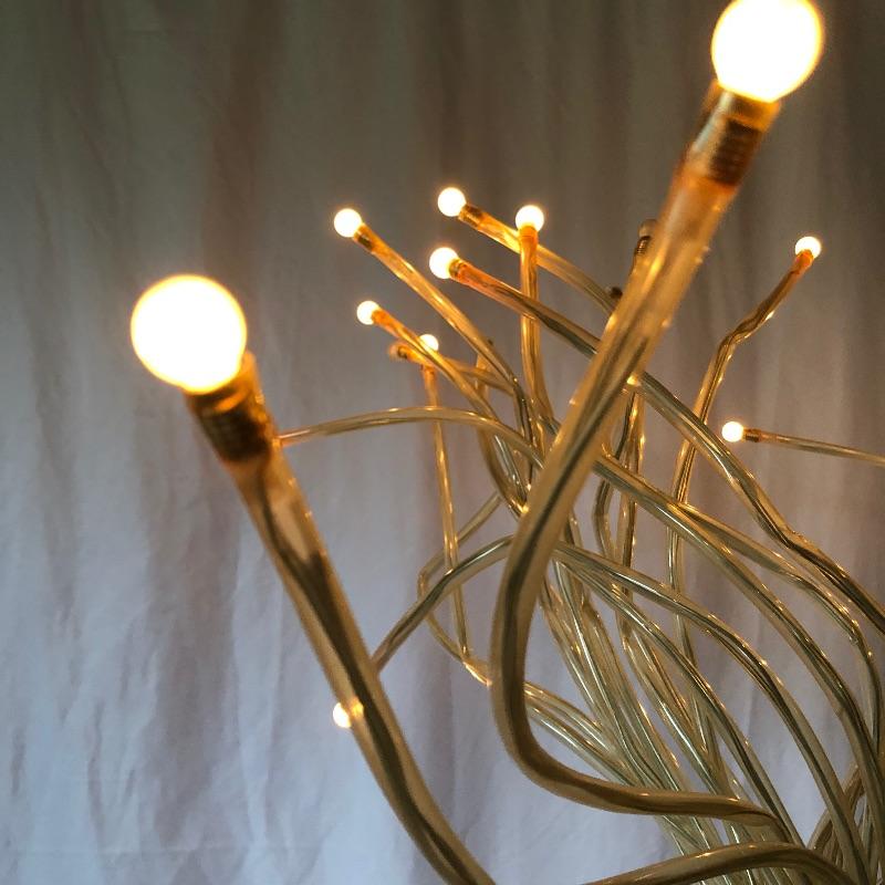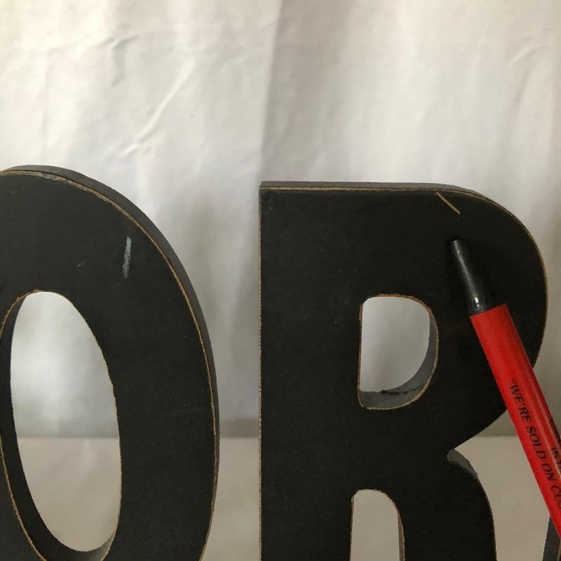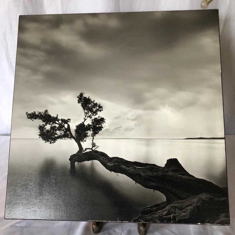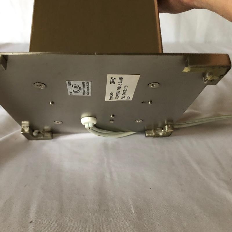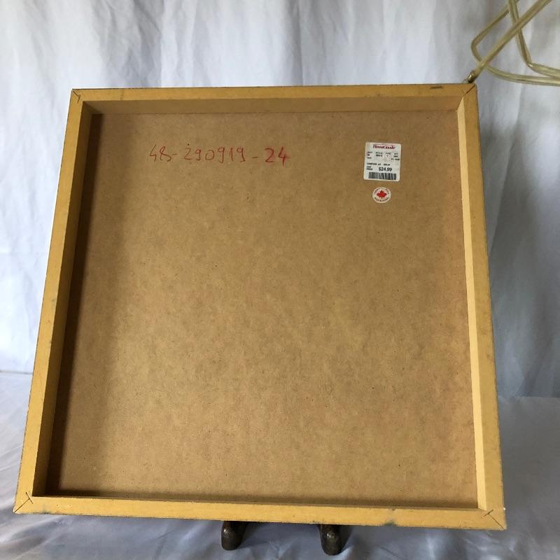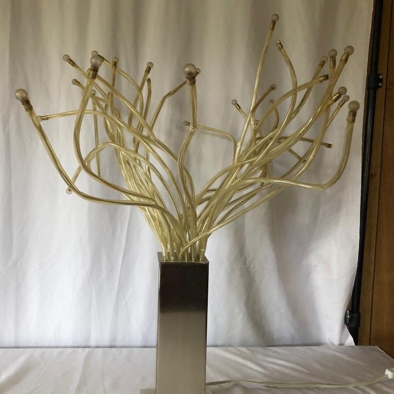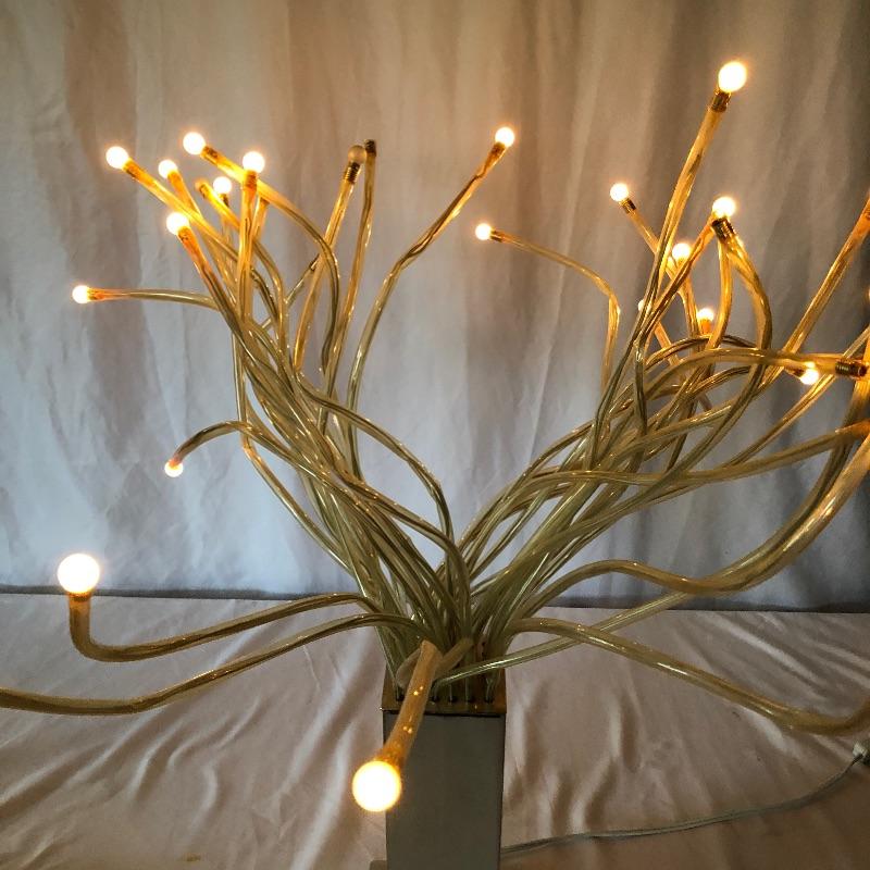 This unique lamp is made up of rubber straw like tubes with small bulbs at the ends. These tubes are flexible and can be arranged however you like; they are encased in an aluminum base with an in line switch. Six bulbs are missing. The photograph on canvas is mounted on a wooden frame and is a black and white lake scene. The two Bistro and Memories signs are black wood and they measure 26.5” x 12.5”. There are a few minor marks shown in images.