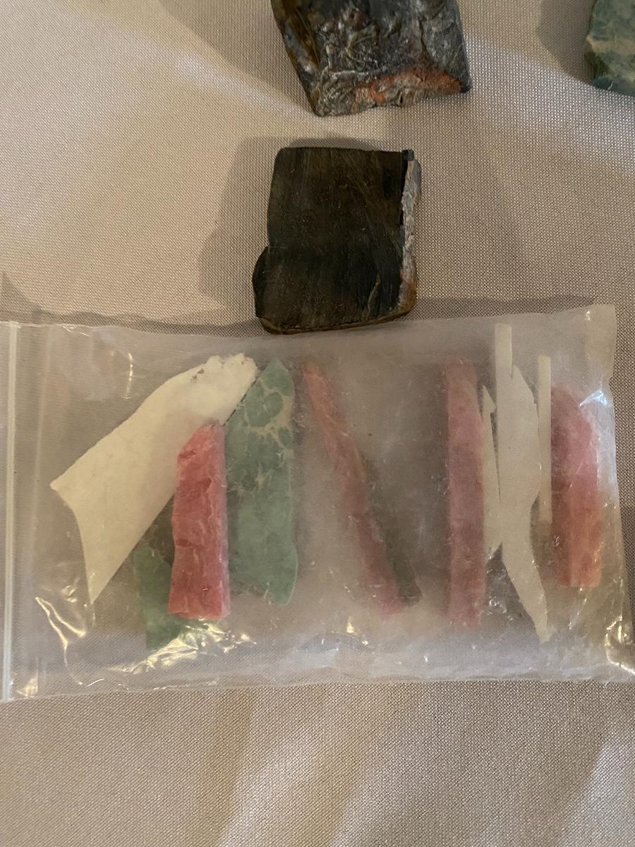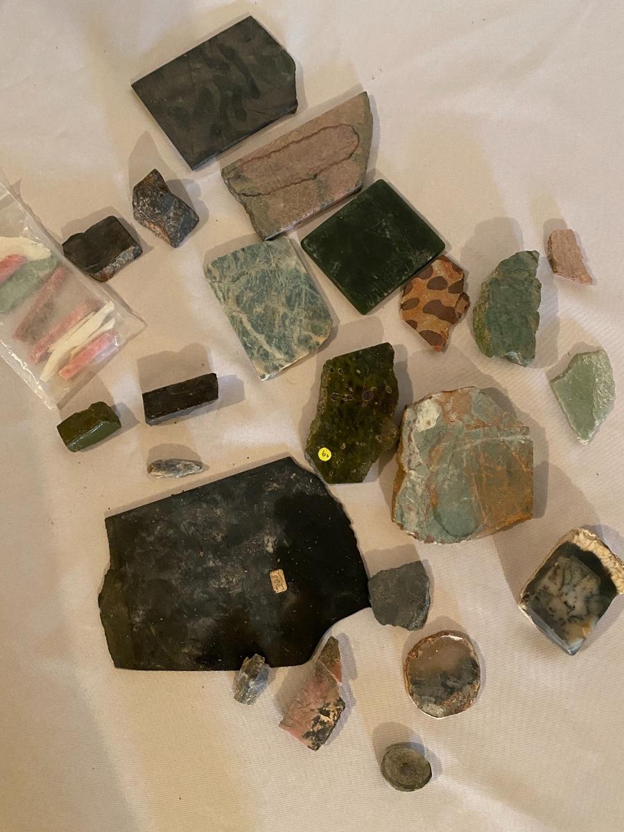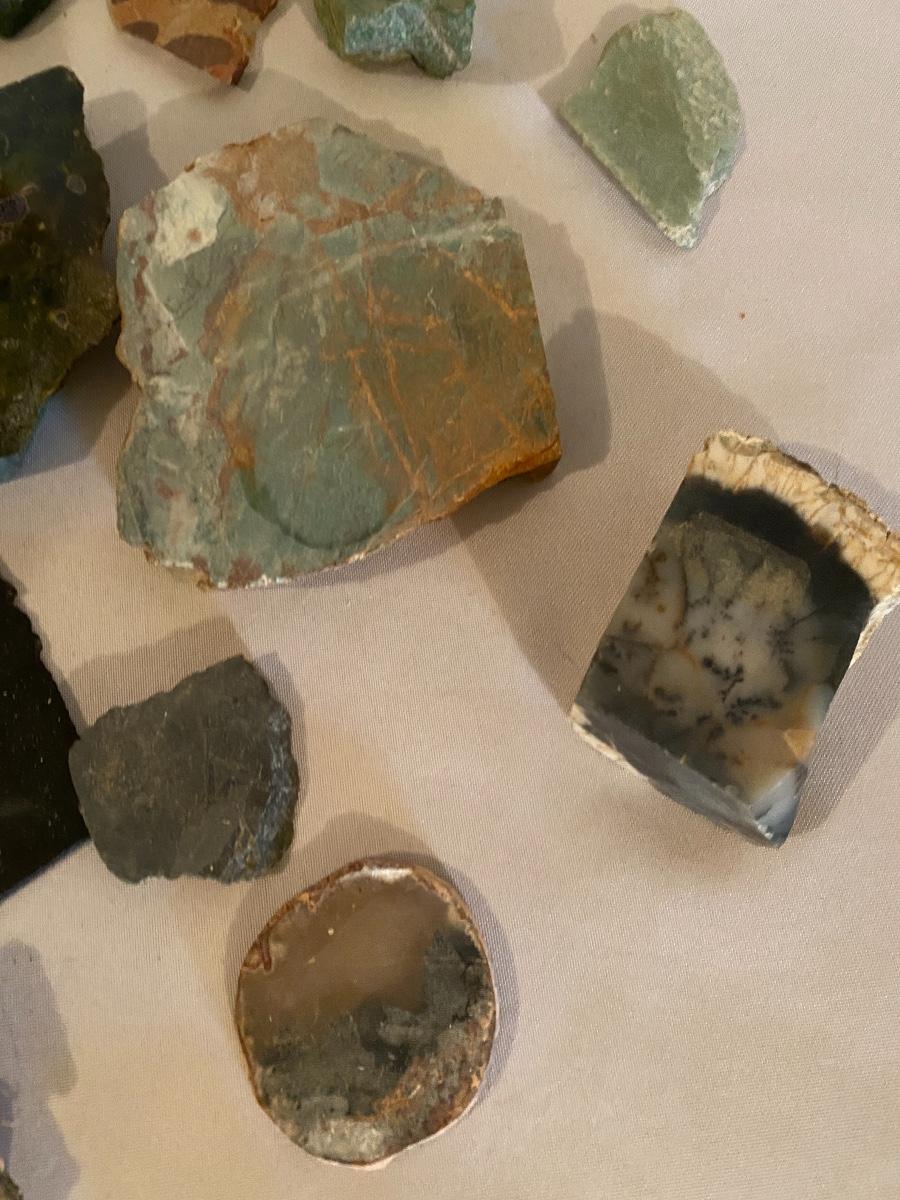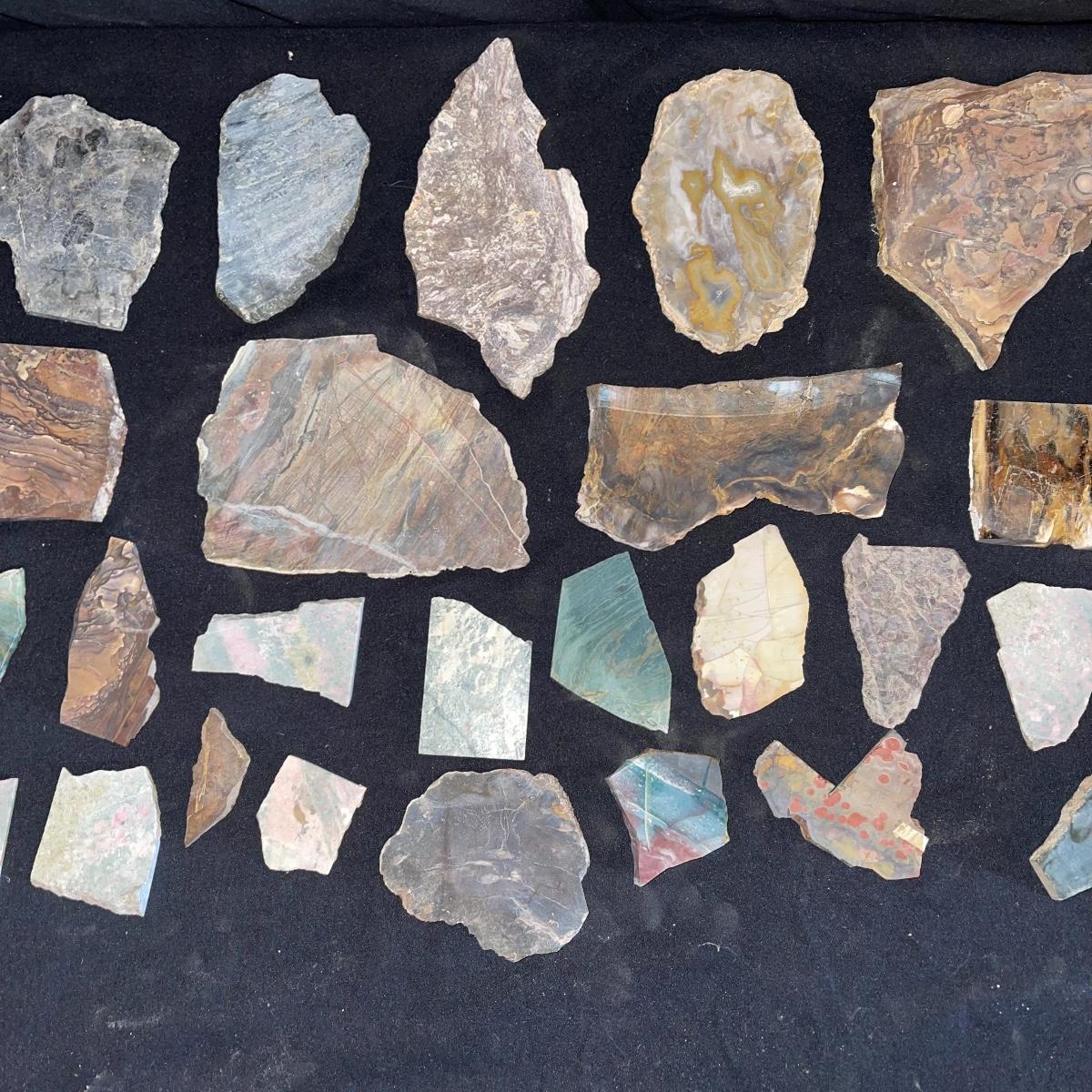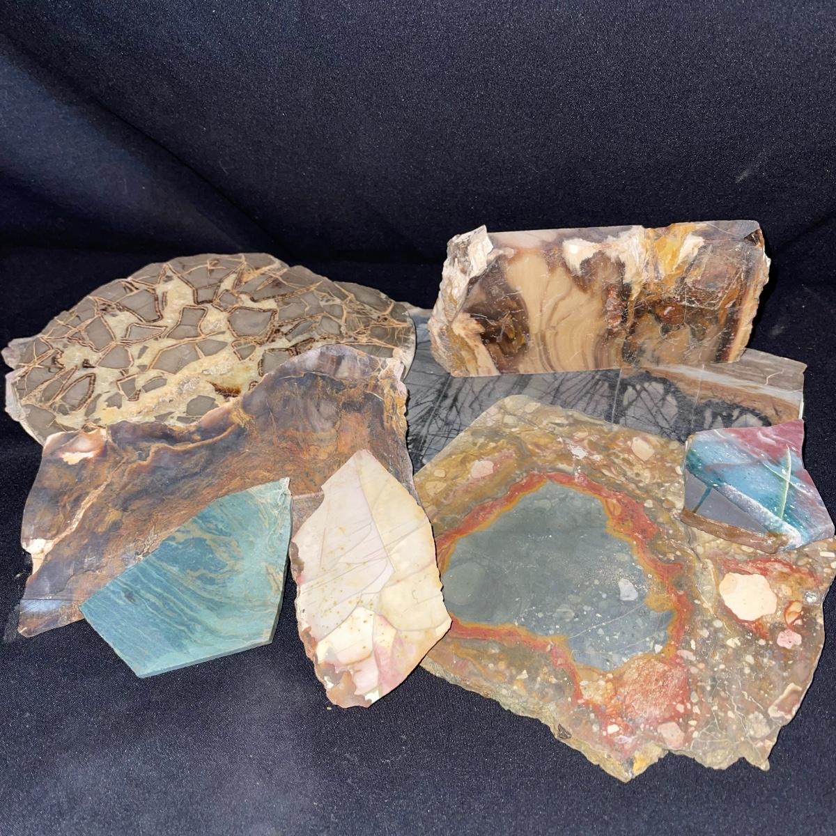 This collection of stone slabs has a variety of sizes, colors, shapes, thickness, and types of stones. Some of the stones in this lot may include jaspers from mines that have since closed. The largest slabs are about 10 inches, sizes of all other slabs are smaller than that; the smallest being about 2 inches. Some stones have price stickers on them, or some tape/stickers identifying where they are from. There is a bag of small tiger’s eye pieces that has a note inside identifying it as such.