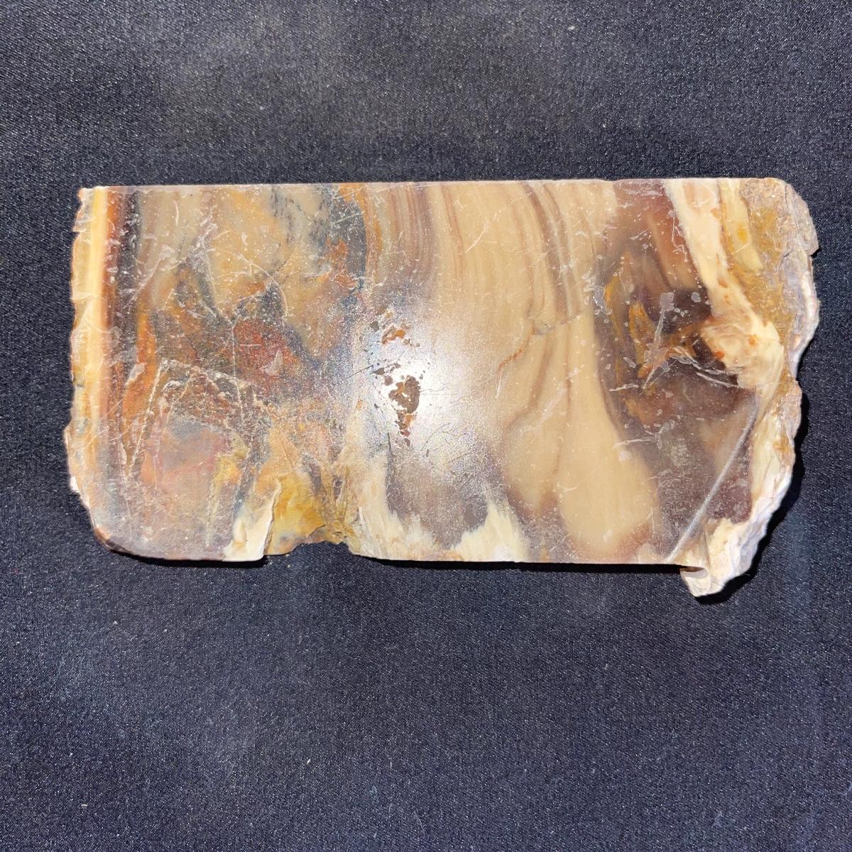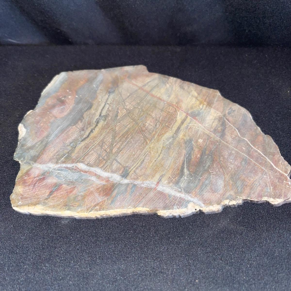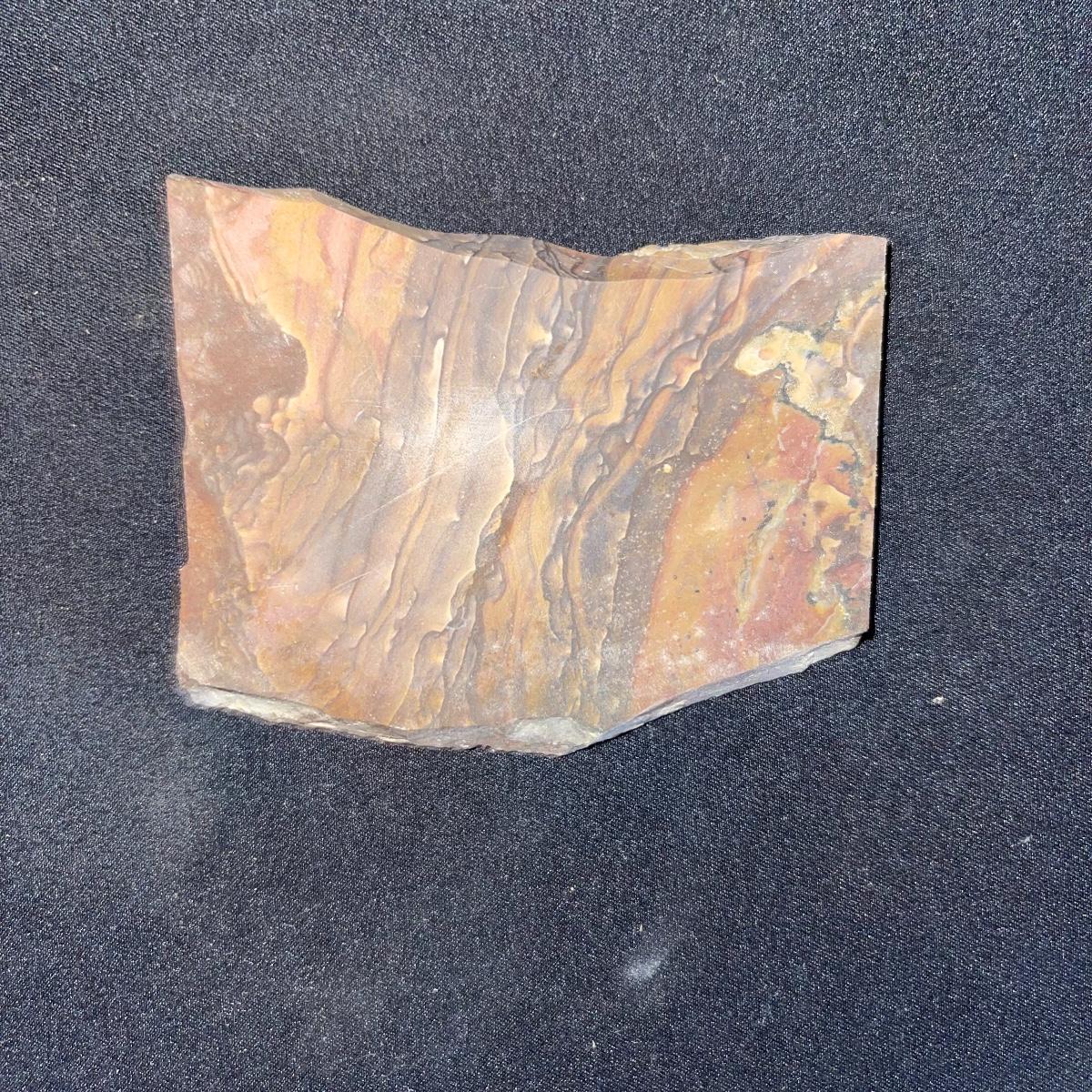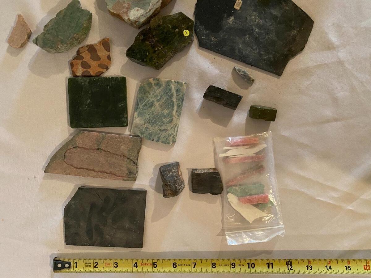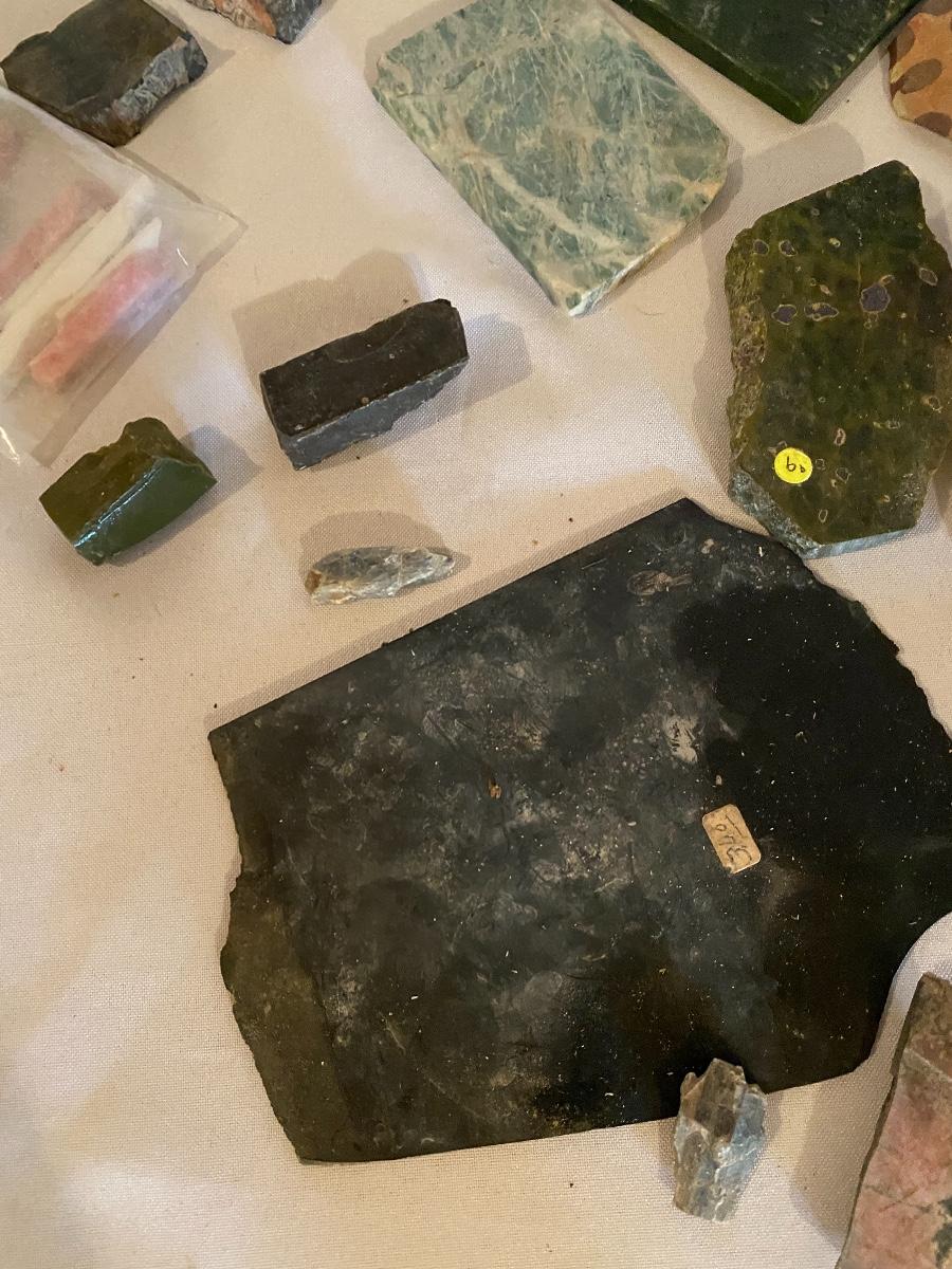 This collection of stone slabs has a variety of sizes, colors, shapes, thickness, and types of stones. Some of the stones in this lot may include jaspers from mines that have since closed. The largest slabs are about 10 inches, sizes of all other slabs are smaller than that; the smallest being about 2 inches. Some stones have price stickers on them, or some tape/stickers identifying where they are from. There is a bag of small tiger’s eye pieces that has a note inside identifying it as such.