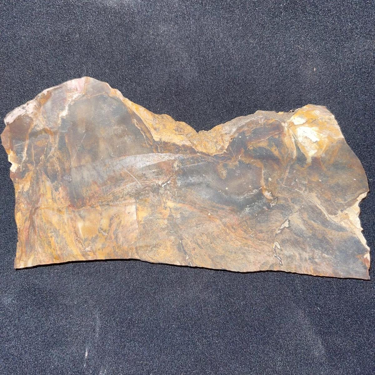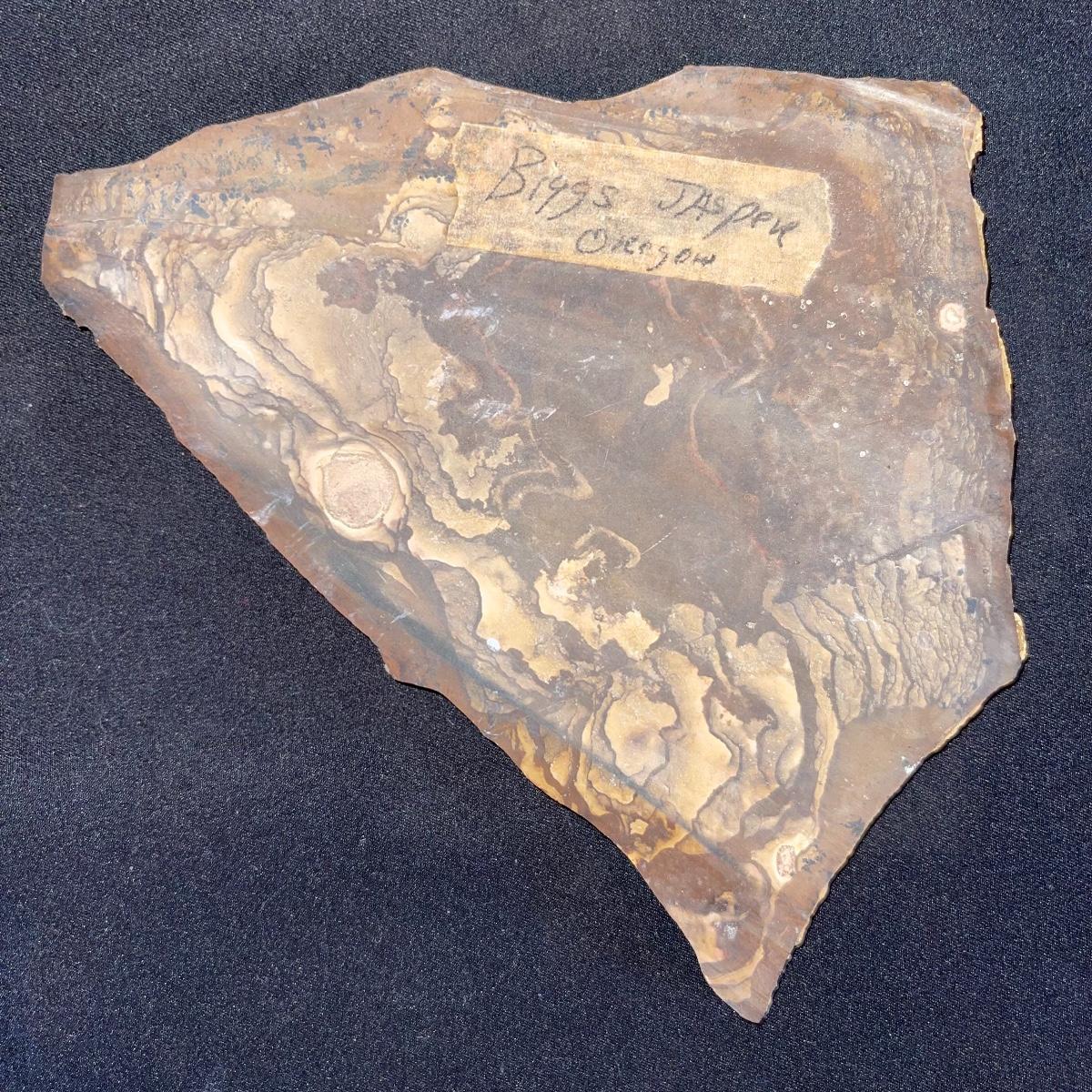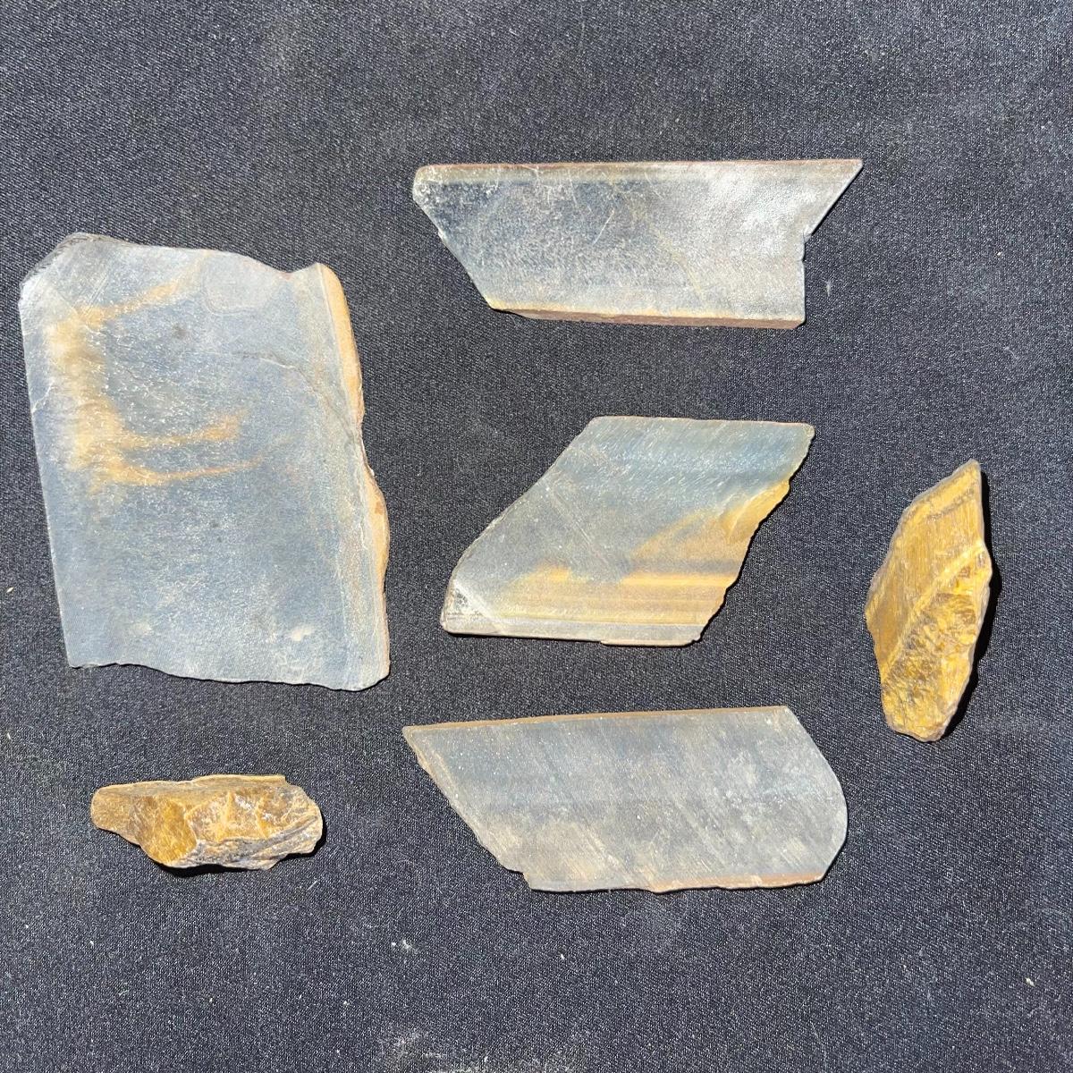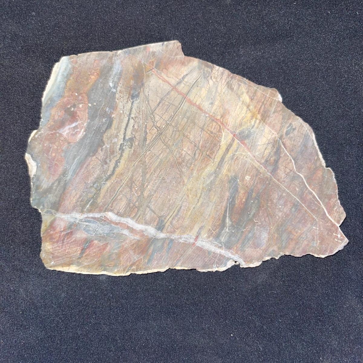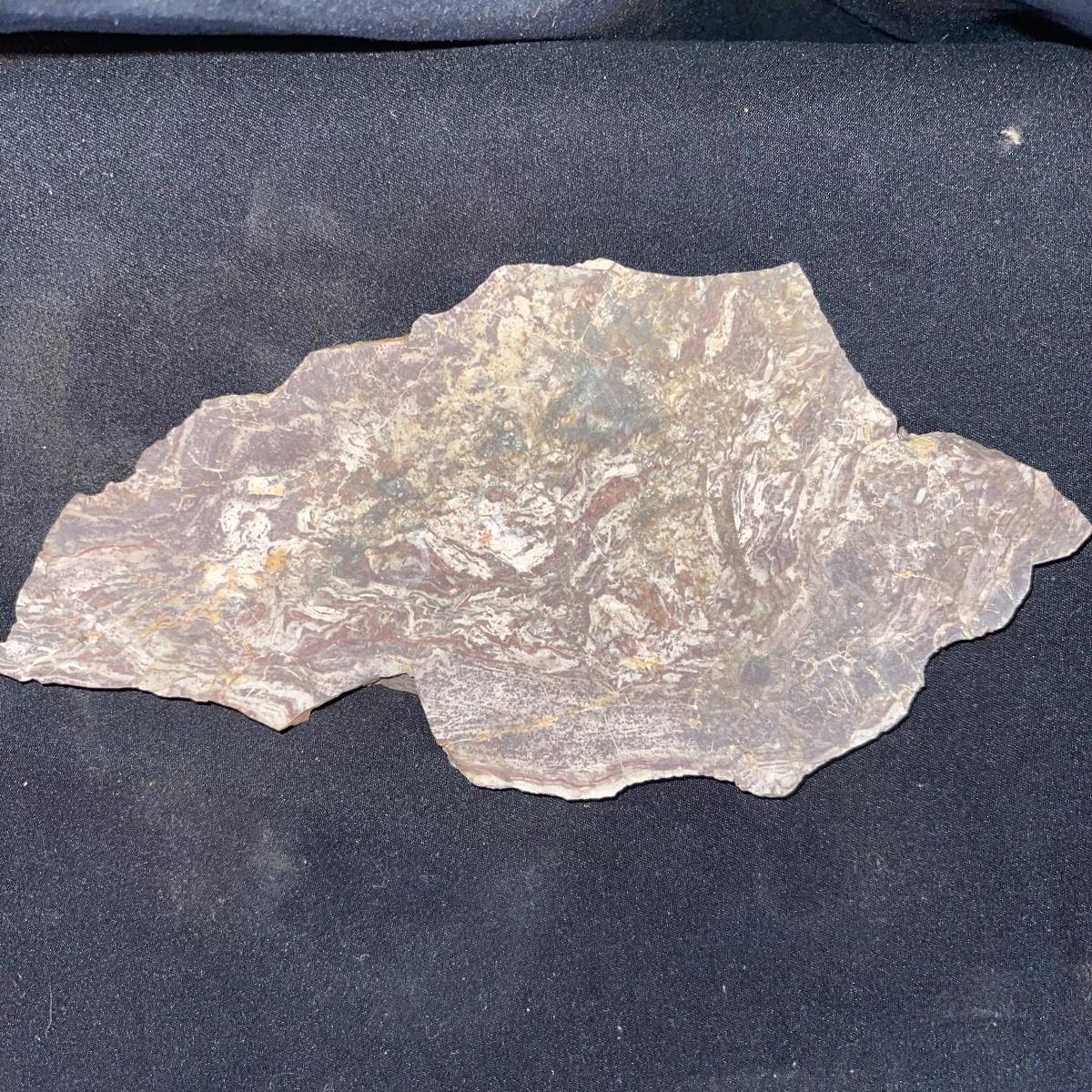This collection of stone slabs has a variety of sizes, colors, shapes, thickness, and types of stones. Some of the stones in this lot may include jaspers from mines that have since closed. The largest slabs are about 10 inches, sizes of all other slabs are smaller than that; the smallest being about 2 inches. Some stones have price stickers on them, or some tape/stickers identifying where they are from. There is a bag of small tiger’s eye pieces that has a note inside identifying it as such.