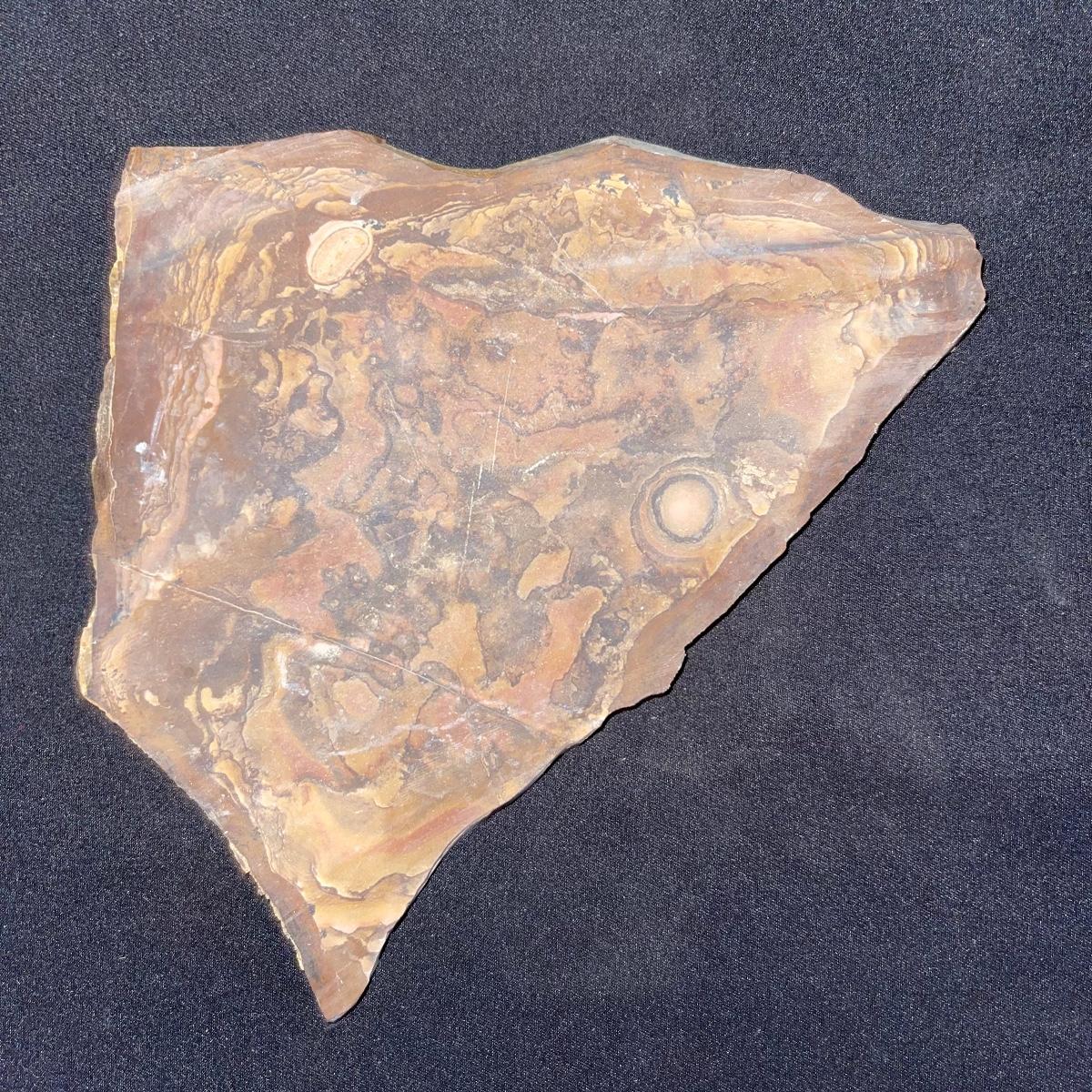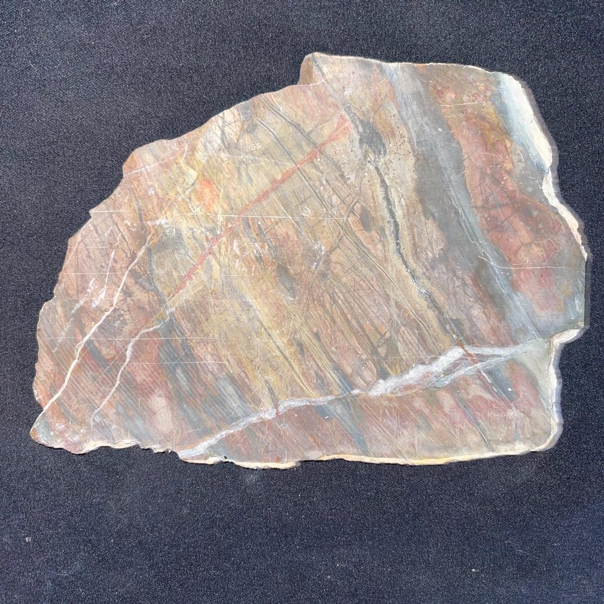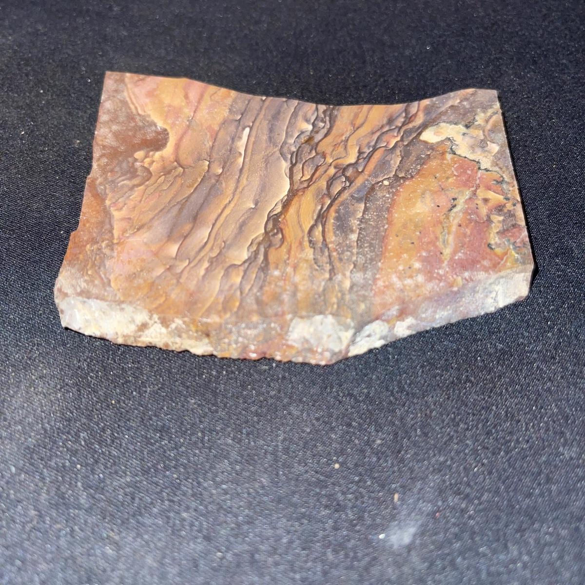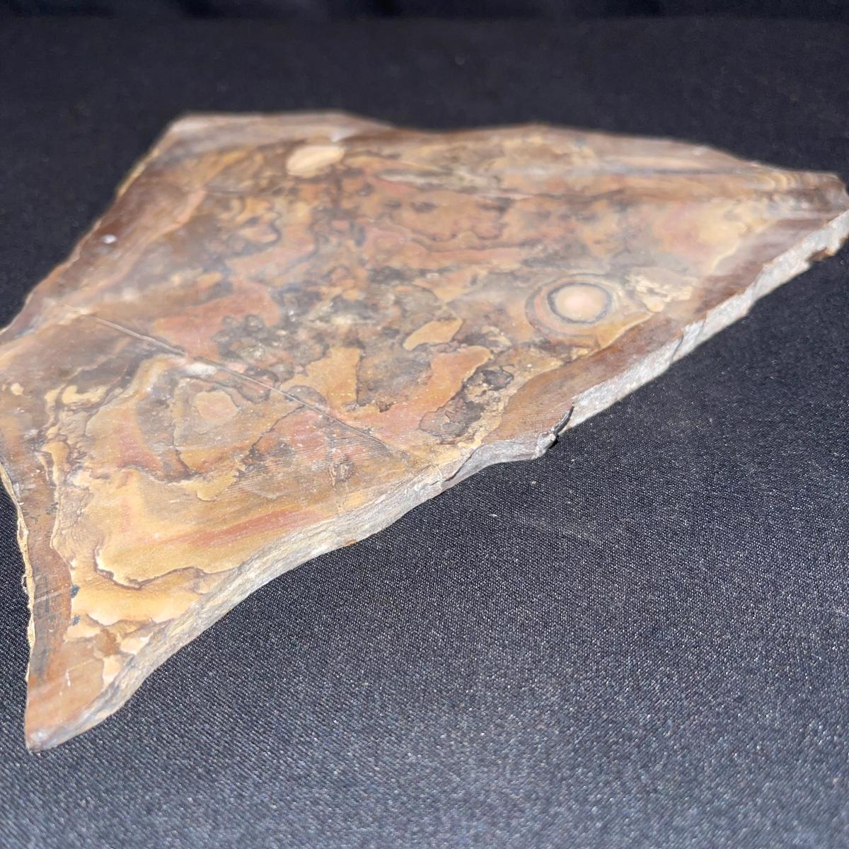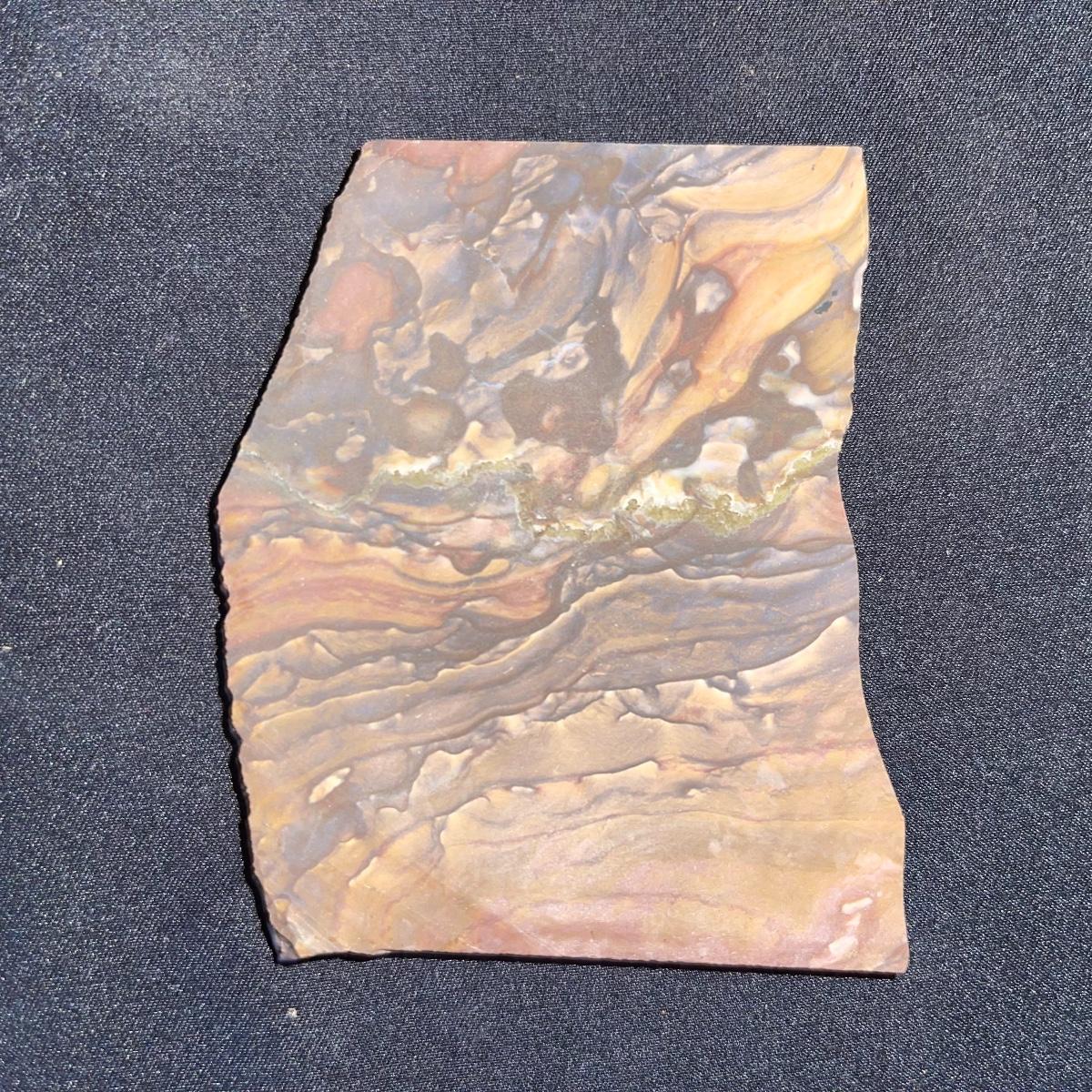 This collection of stone slabs has a variety of sizes, colors, shapes, thickness, and types of stones. Some of the stones in this lot may include jaspers from mines that have since closed. The largest slabs are about 10 inches, sizes of all other slabs are smaller than that; the smallest being about 2 inches. Some stones have price stickers on them, or some tape/stickers identifying where they are from. There is a bag of small tiger’s eye pieces that has a note inside identifying it as such.