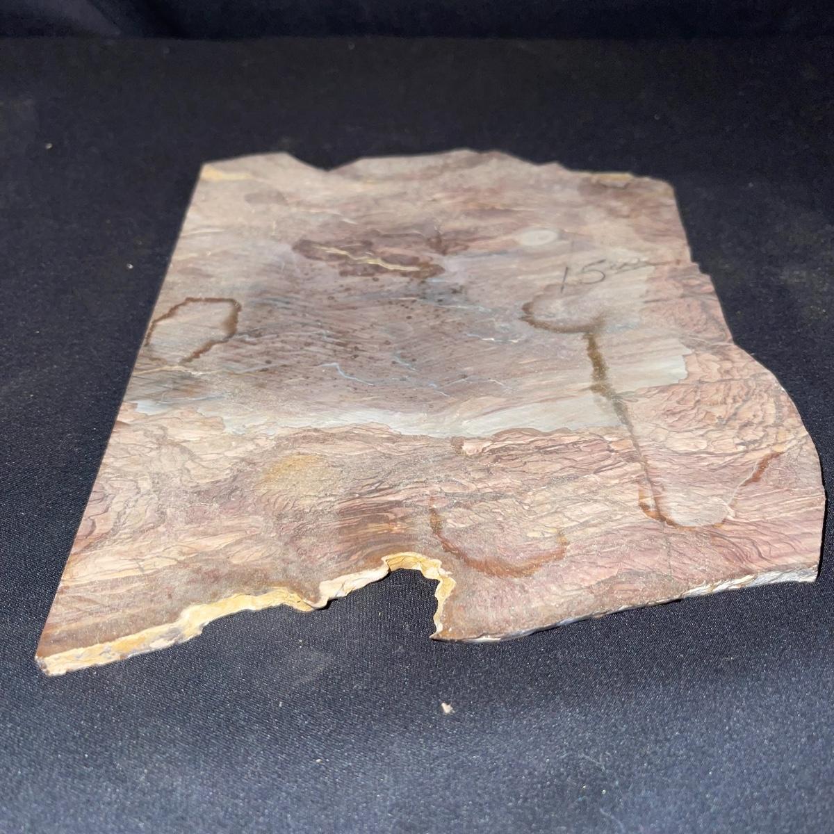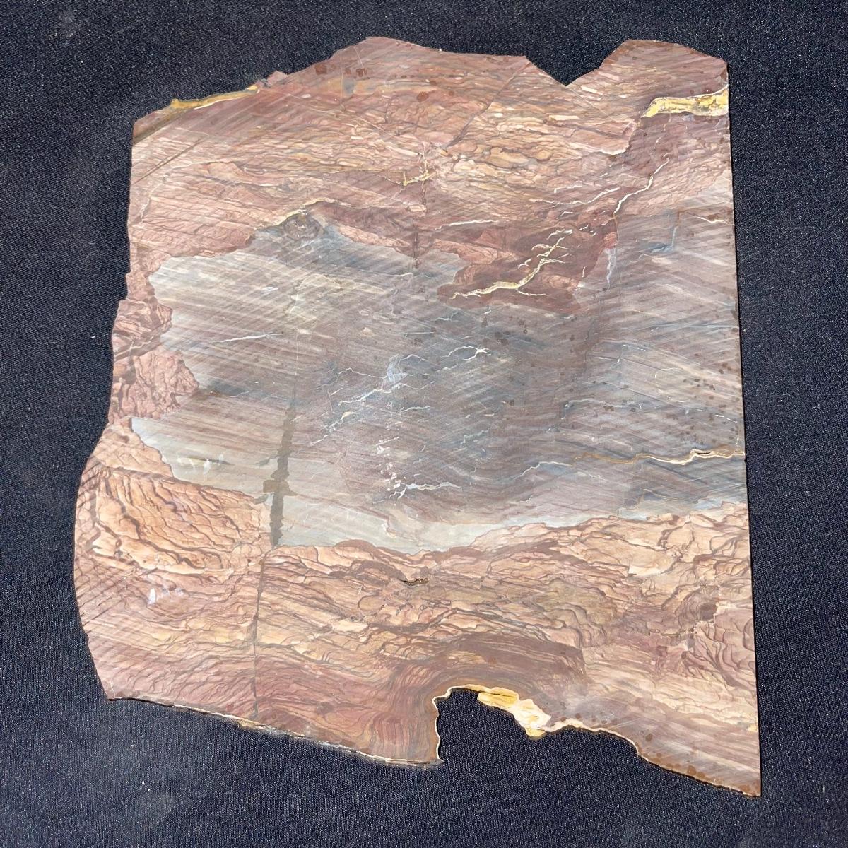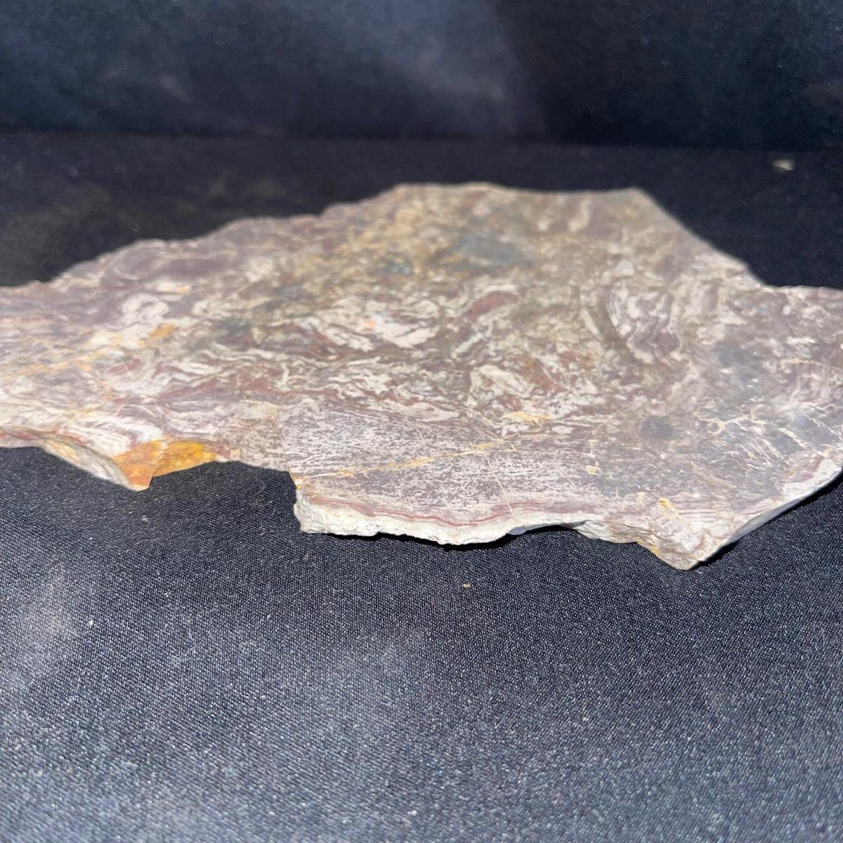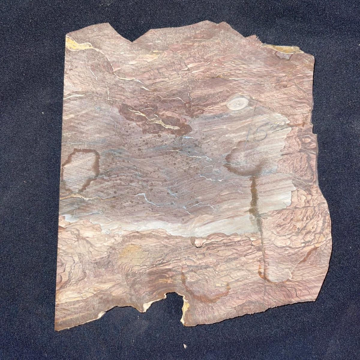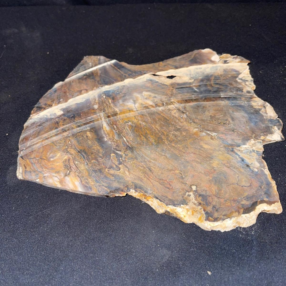 This collection of stone slabs has a variety of sizes, colors, shapes, thickness, and types of stones. Some of the stones in this lot may include jaspers from mines that have since closed. The largest slabs are about 10 inches, sizes of all other slabs are smaller than that; the smallest being about 2 inches. Some stones have price stickers on them, or some tape/stickers identifying where they are from. There is a bag of small tiger’s eye pieces that has a note inside identifying it as such.