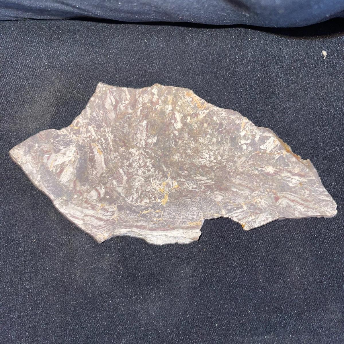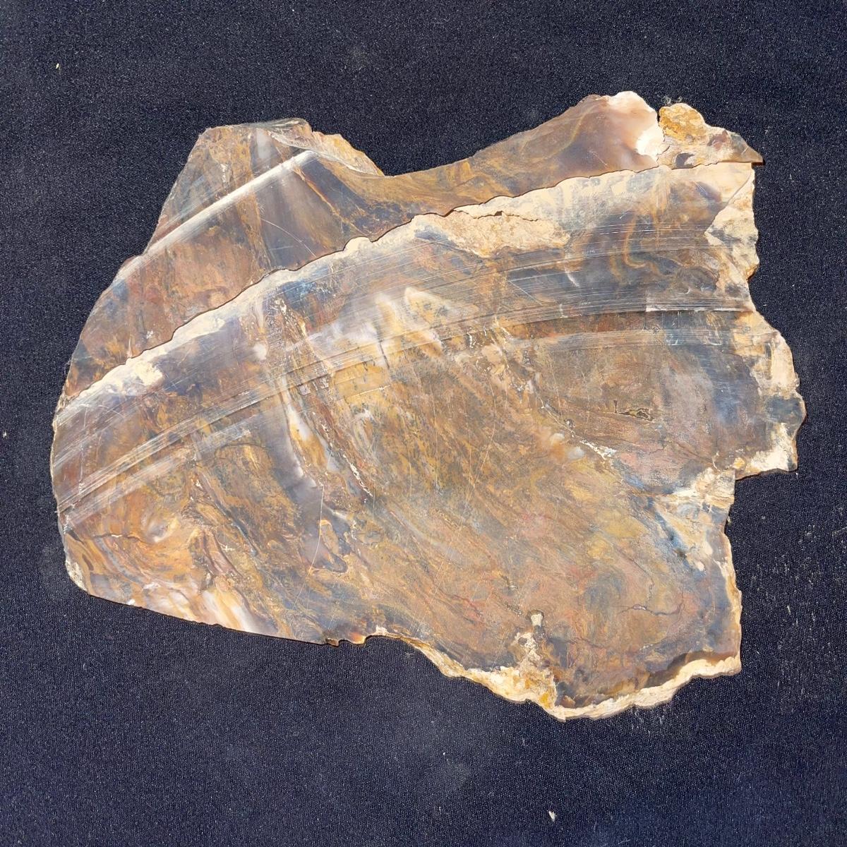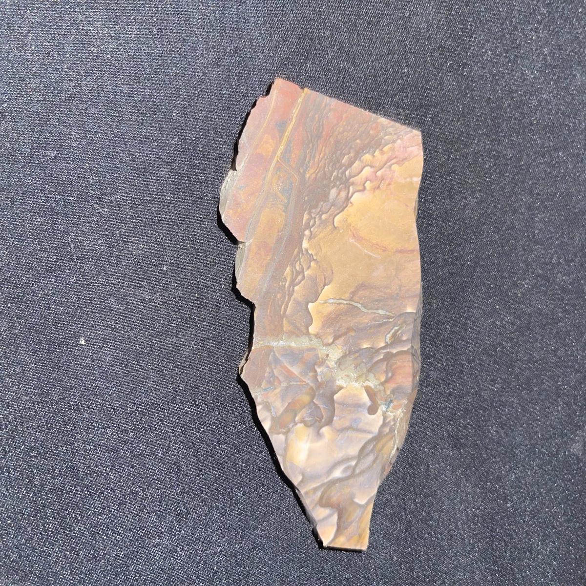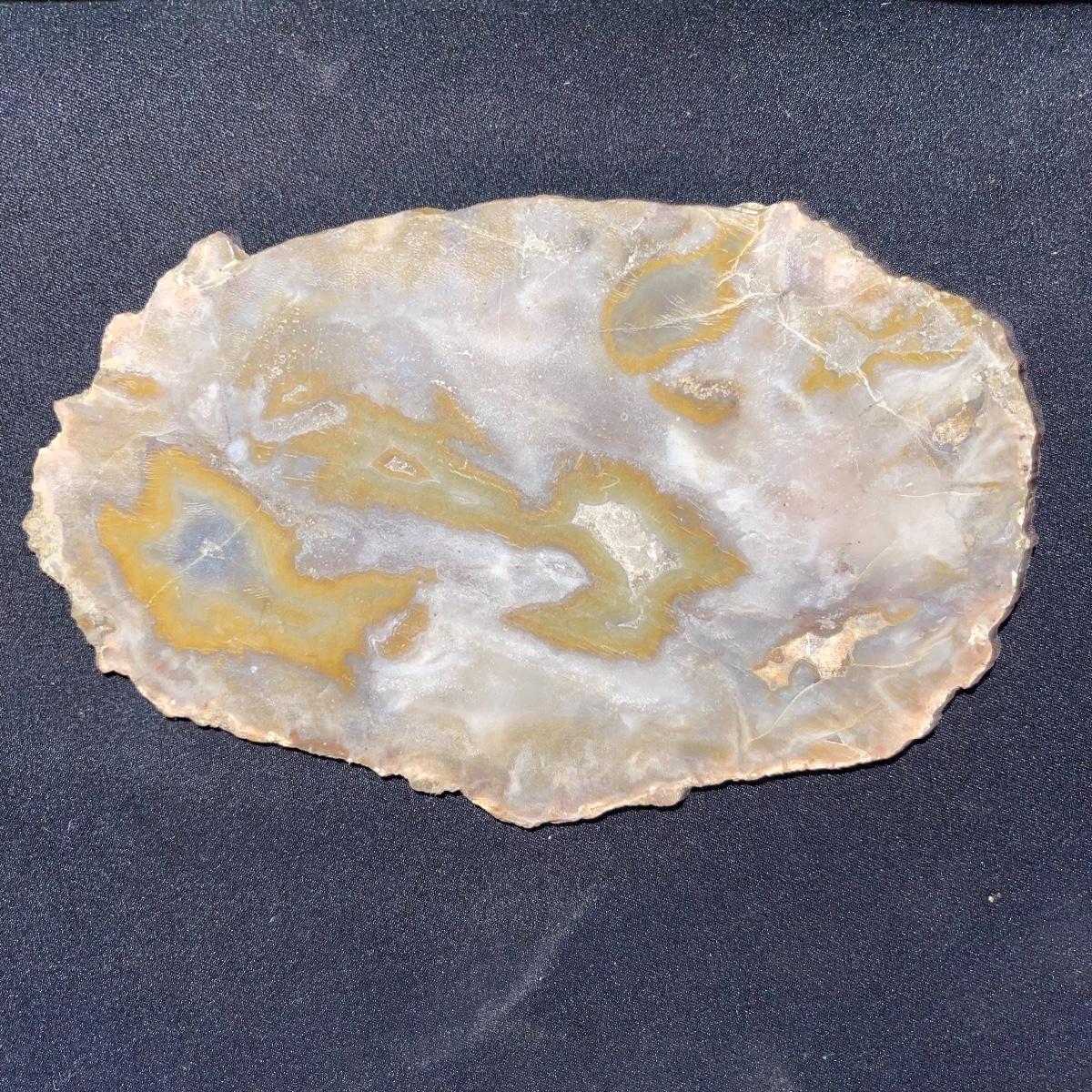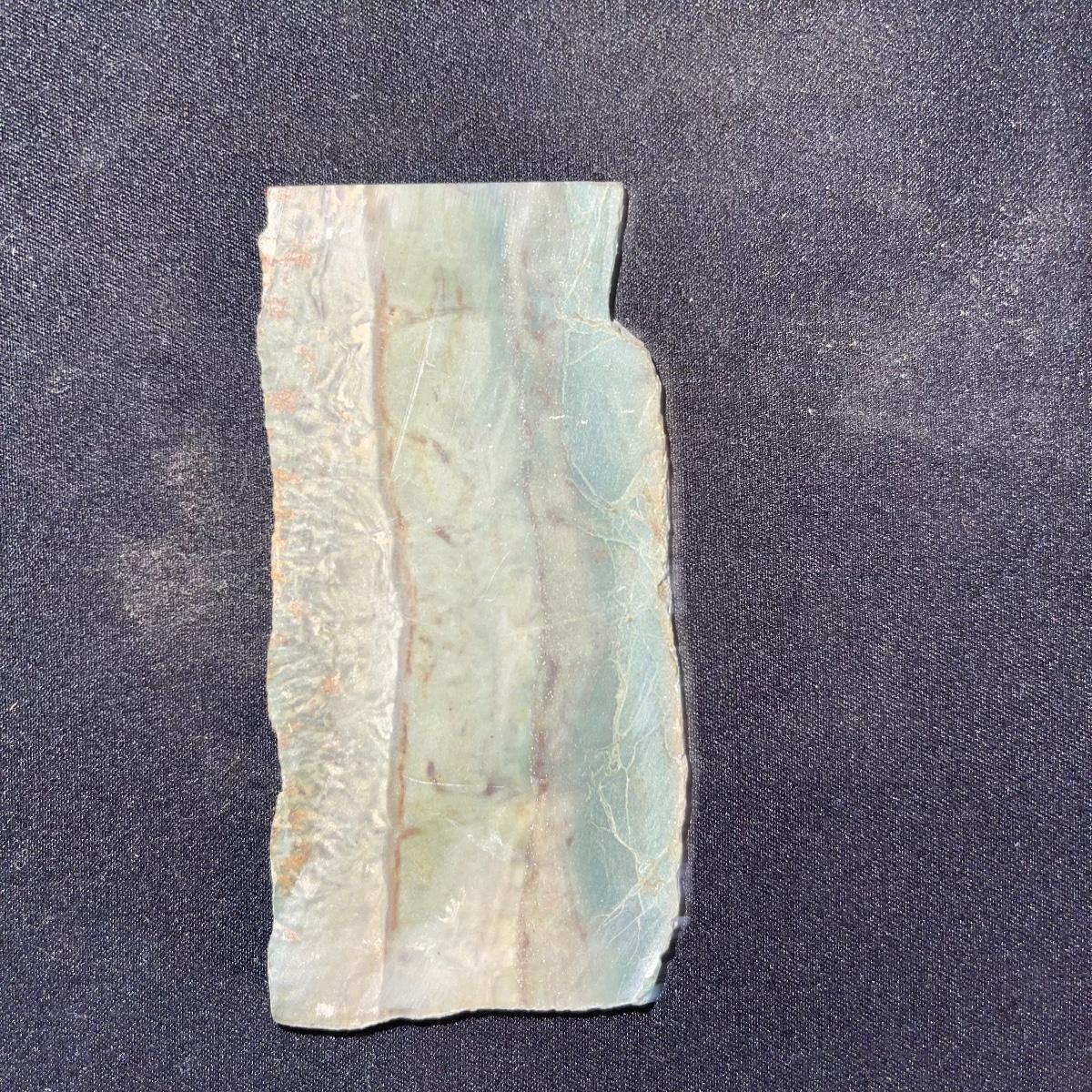 This collection of stone slabs has a variety of sizes, colors, shapes, thickness, and types of stones. Some of the stones in this lot may include jaspers from mines that have since closed. The largest slabs are about 10 inches, sizes of all other slabs are smaller than that; the smallest being about 2 inches. Some stones have price stickers on them, or some tape/stickers identifying where they are from. There is a bag of small tiger’s eye pieces that has a note inside identifying it as such.