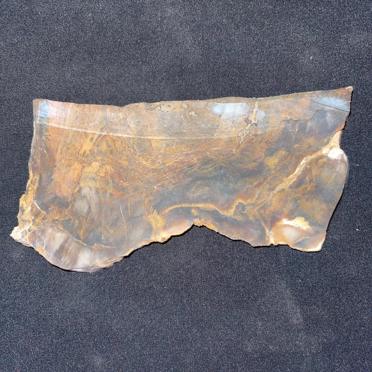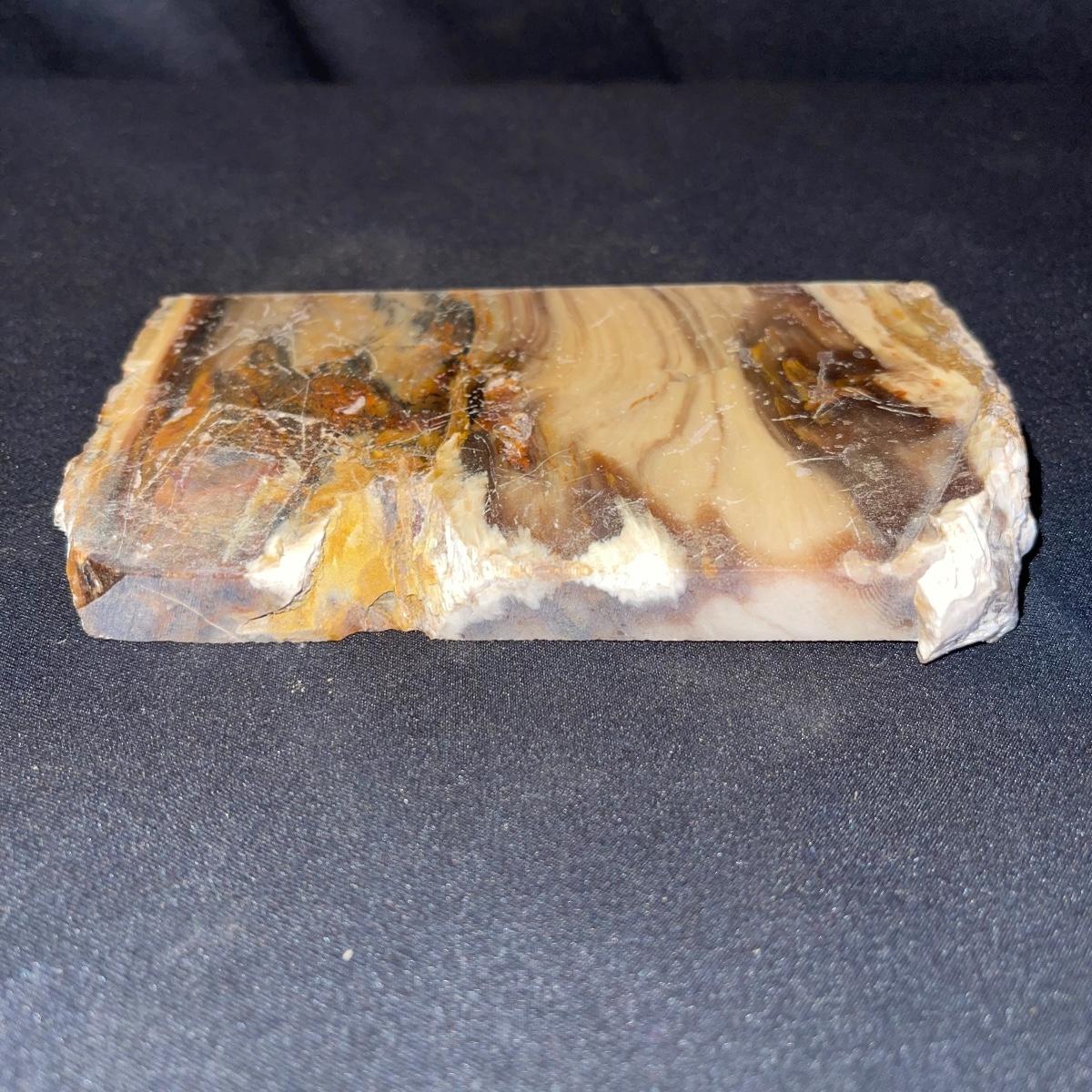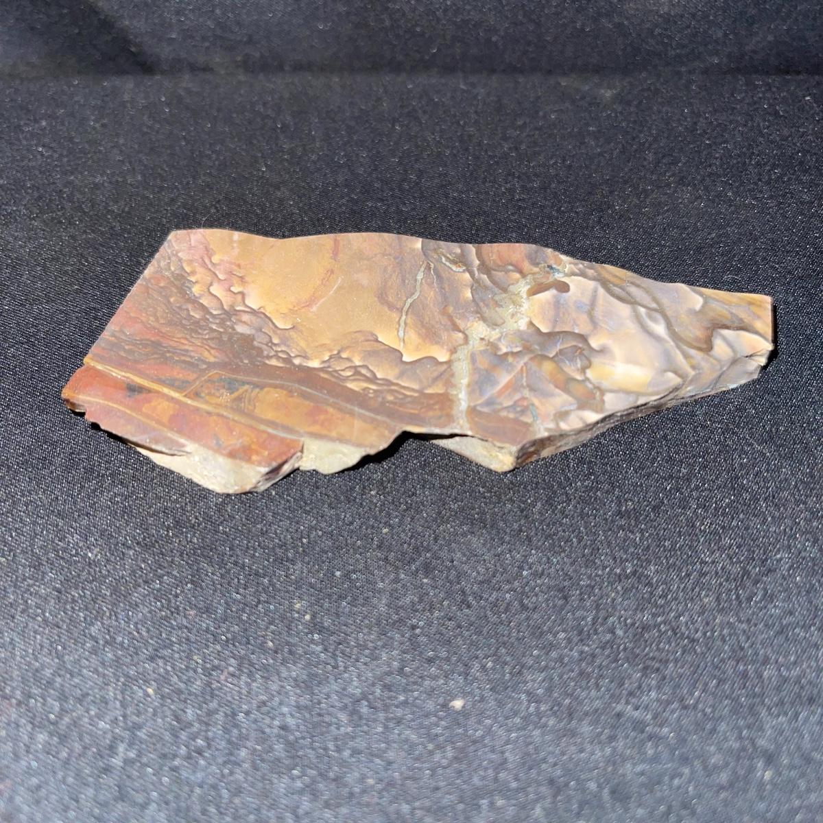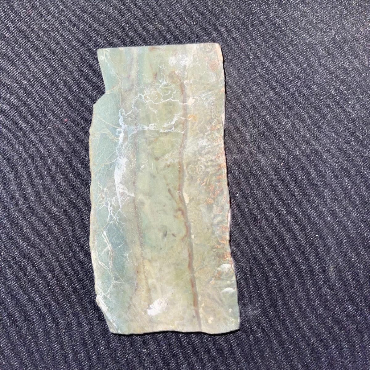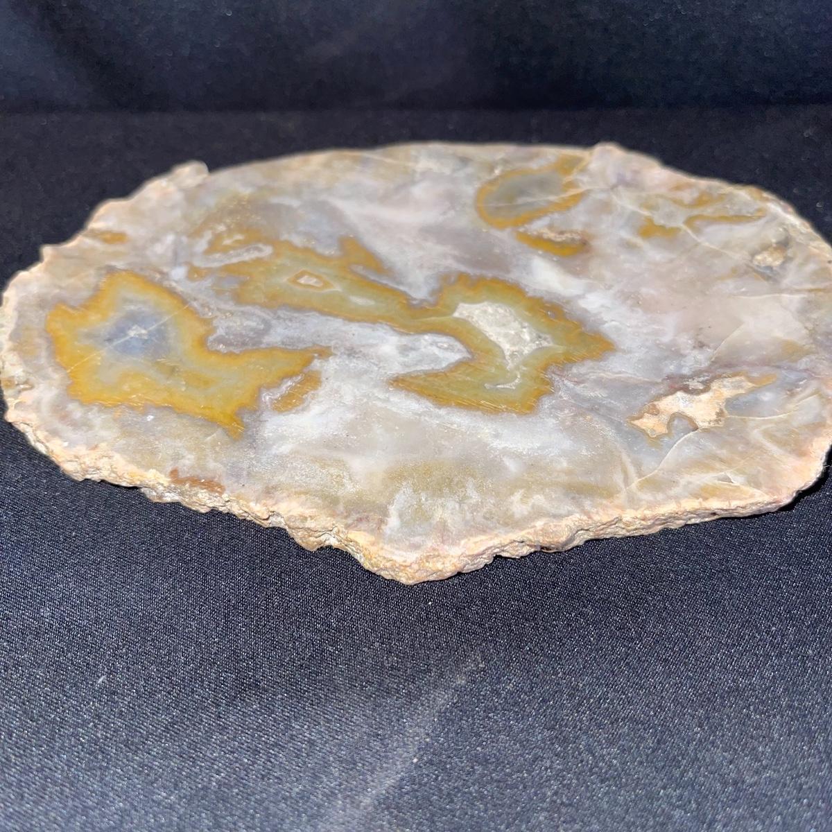 This collection of stone slabs has a variety of sizes, colors, shapes, thickness, and types of stones. Some of the stones in this lot may include jaspers from mines that have since closed. The largest slabs are about 10 inches, sizes of all other slabs are smaller than that; the smallest being about 2 inches. Some stones have price stickers on them, or some tape/stickers identifying where they are from. There is a bag of small tiger’s eye pieces that has a note inside identifying it as such.