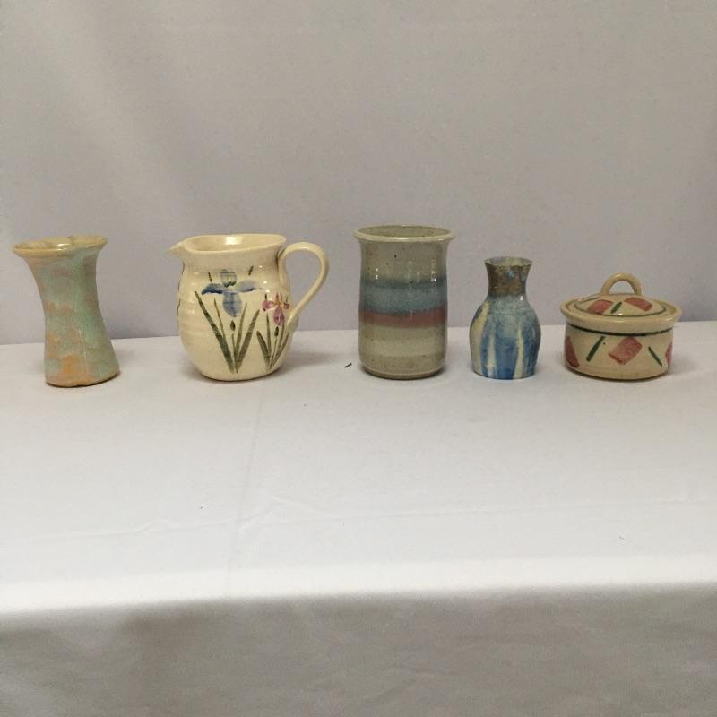 Lot includes Pisgah pottery vase, Crystalline vase by Piera, pitcher, jar with lid and vase. Pictures do not do these vases justice, truly spectacular.