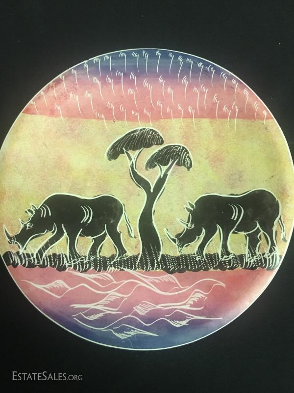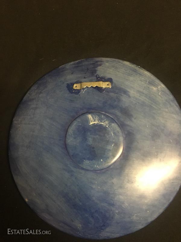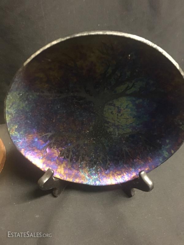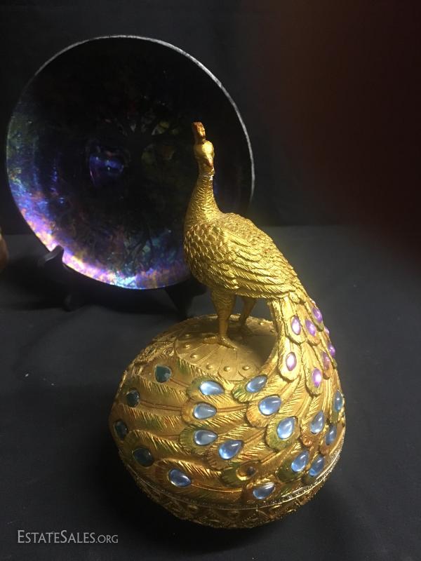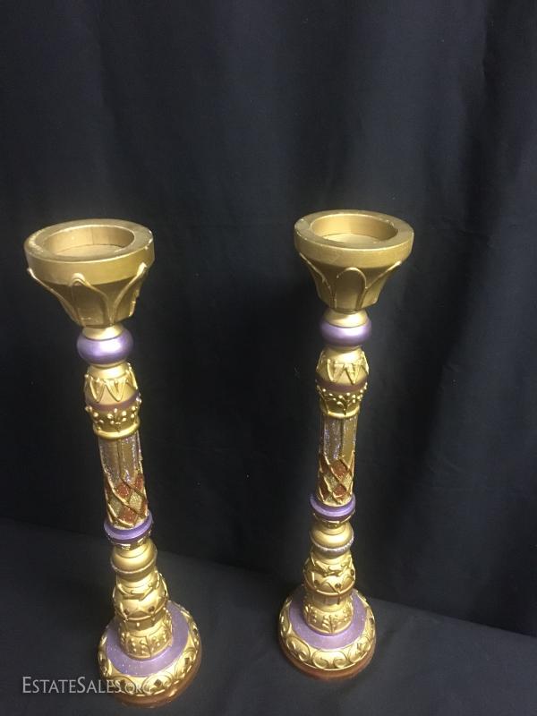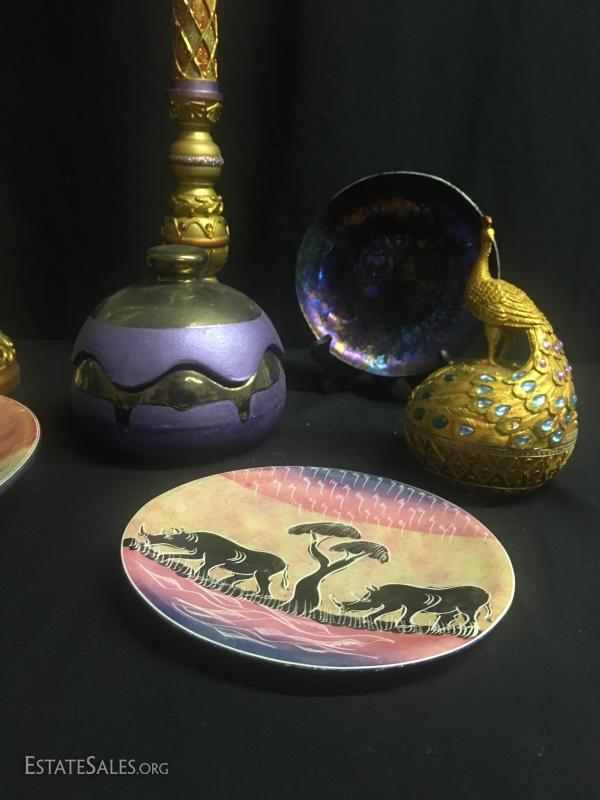 Pair of 24" candle holders, cast man-made materials with a little "bling". Peacock canister matches nicely and is a plastic form, approx. 8" tall. Purple and copper colored pottery piece and three plates. Largest plate measures 12" diameter.
