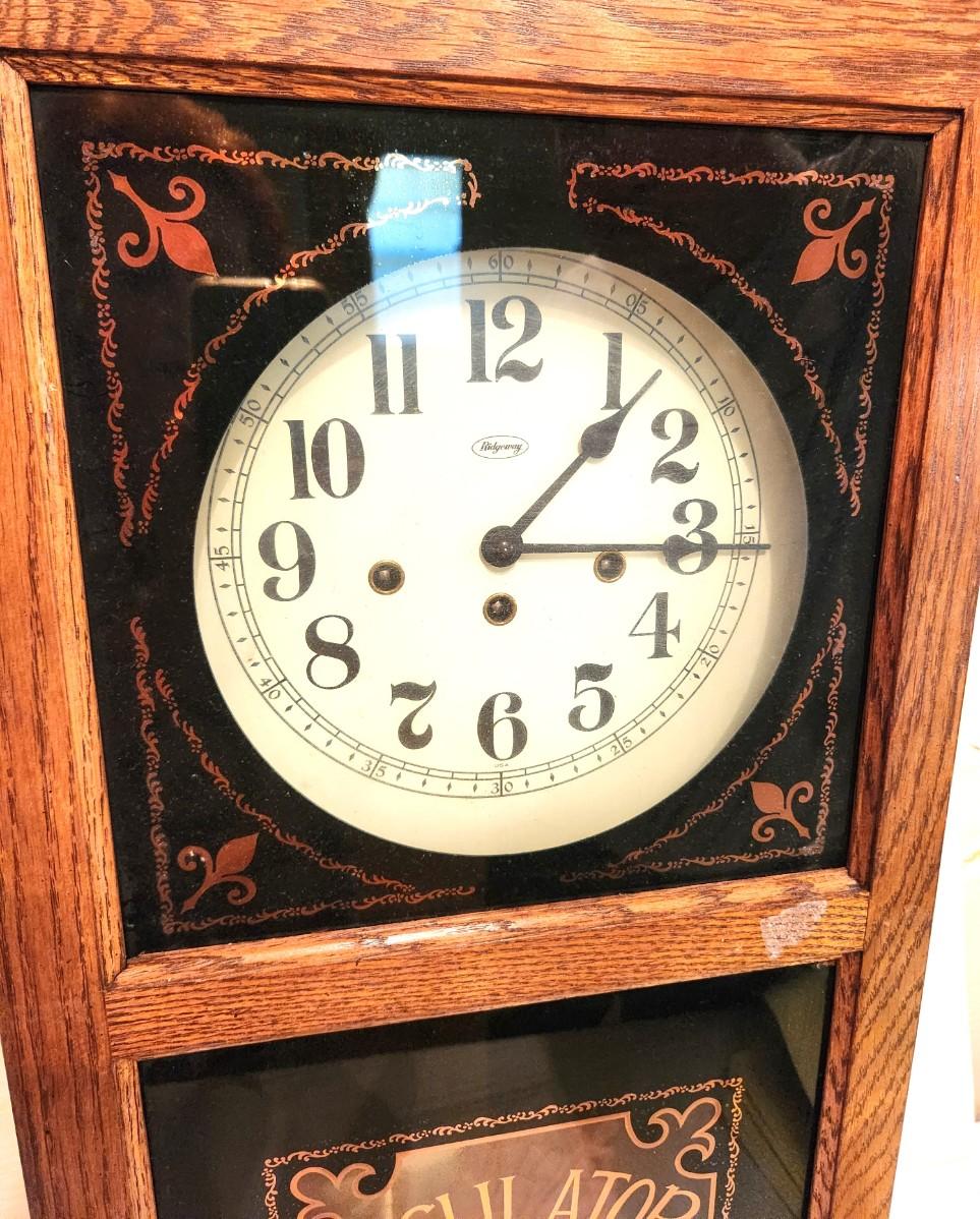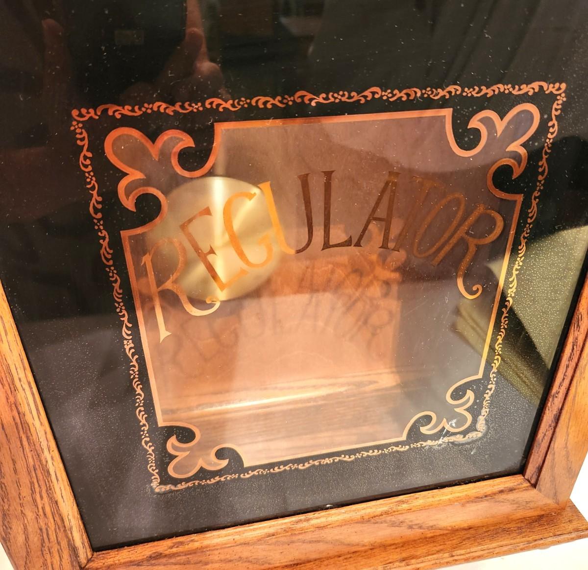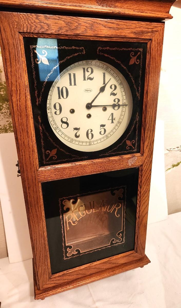 Traditional style oak finish wall pendulum clock from the Ridgeway Company 33.5" tall, 16" across. Strikes the hour and the half. Appears to be in good working condition.