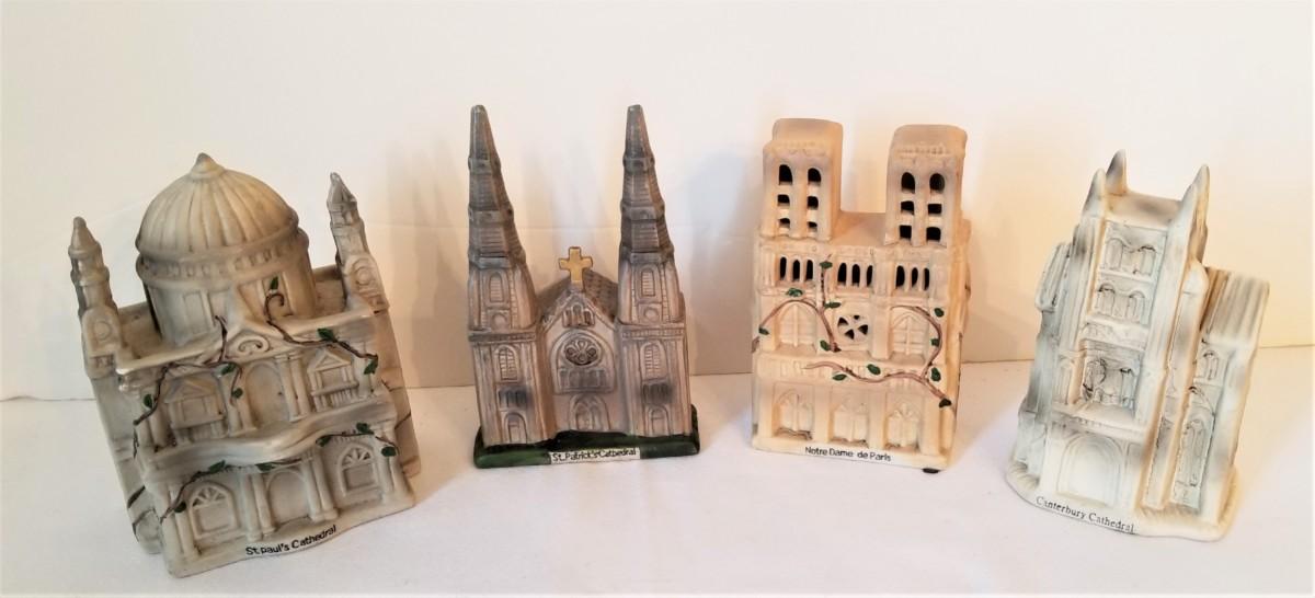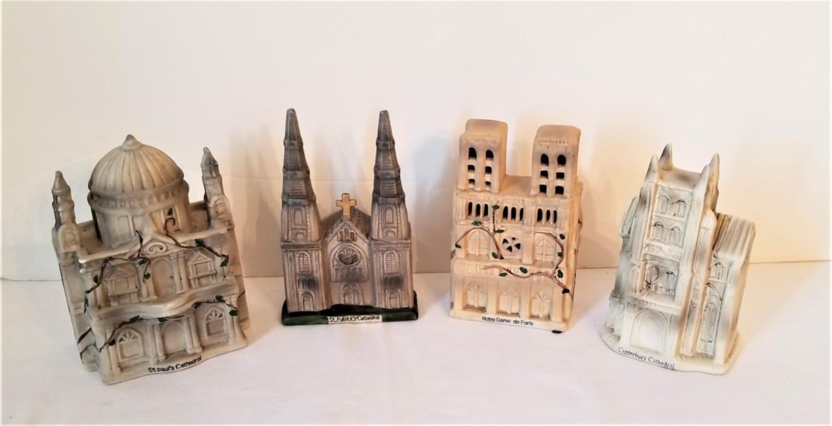 You get all you see here: St. Paul's (London), St. Patrick's (New York), Notre Dame (Paris), Canterbury Cathedral (Canterbury, UK). Each is about 5.25" tall, bisque porcelain.