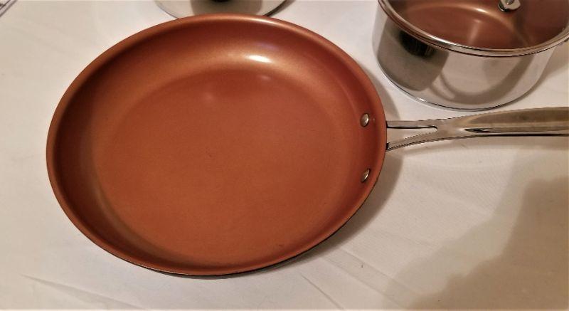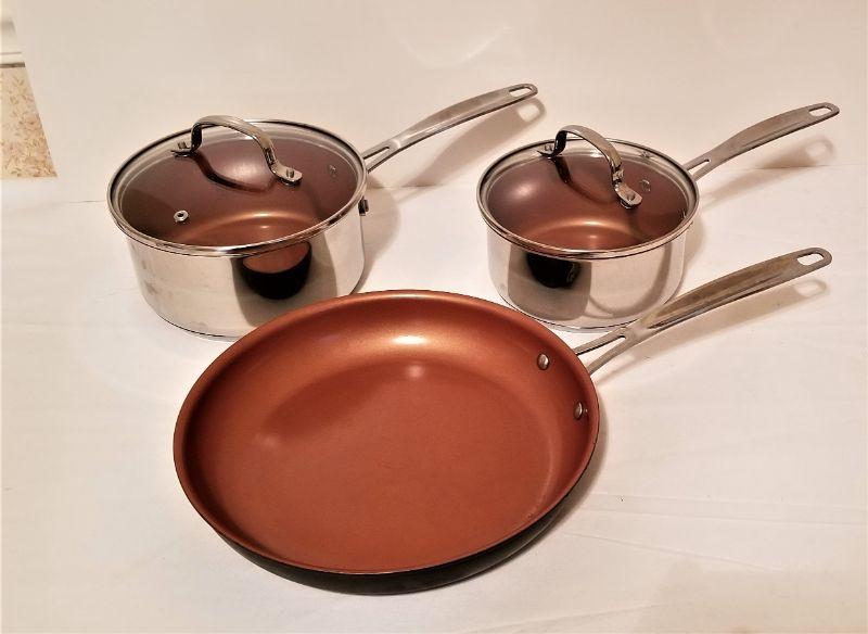 Three pieces of no-stick NUWARE cookware in great condition - you get all you see here, Skillet (10.75" across), 2 Qt. Saucepan with lid and 1.5 QT saucepan with lid. I have a skillet made by this company and I use it all the time. Really IS non-stick.